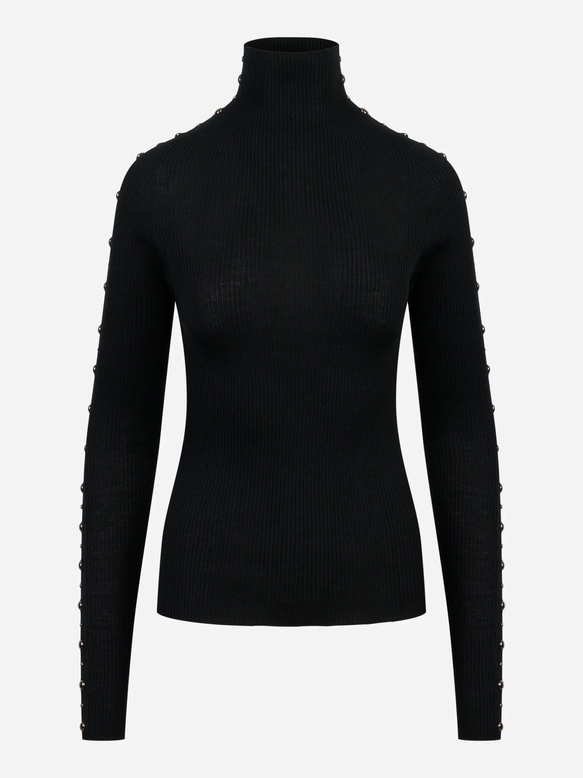 ITEM INFO Dolcevita nero in lana merinos con applicazioni su maniche Dolcevita a costine con applicazioni metalliche sulle maniche Collo alto, maniche lunghe Finiture a costine su polsi e fondo Linea aderente Composizione: 100% lana merinos extrafine