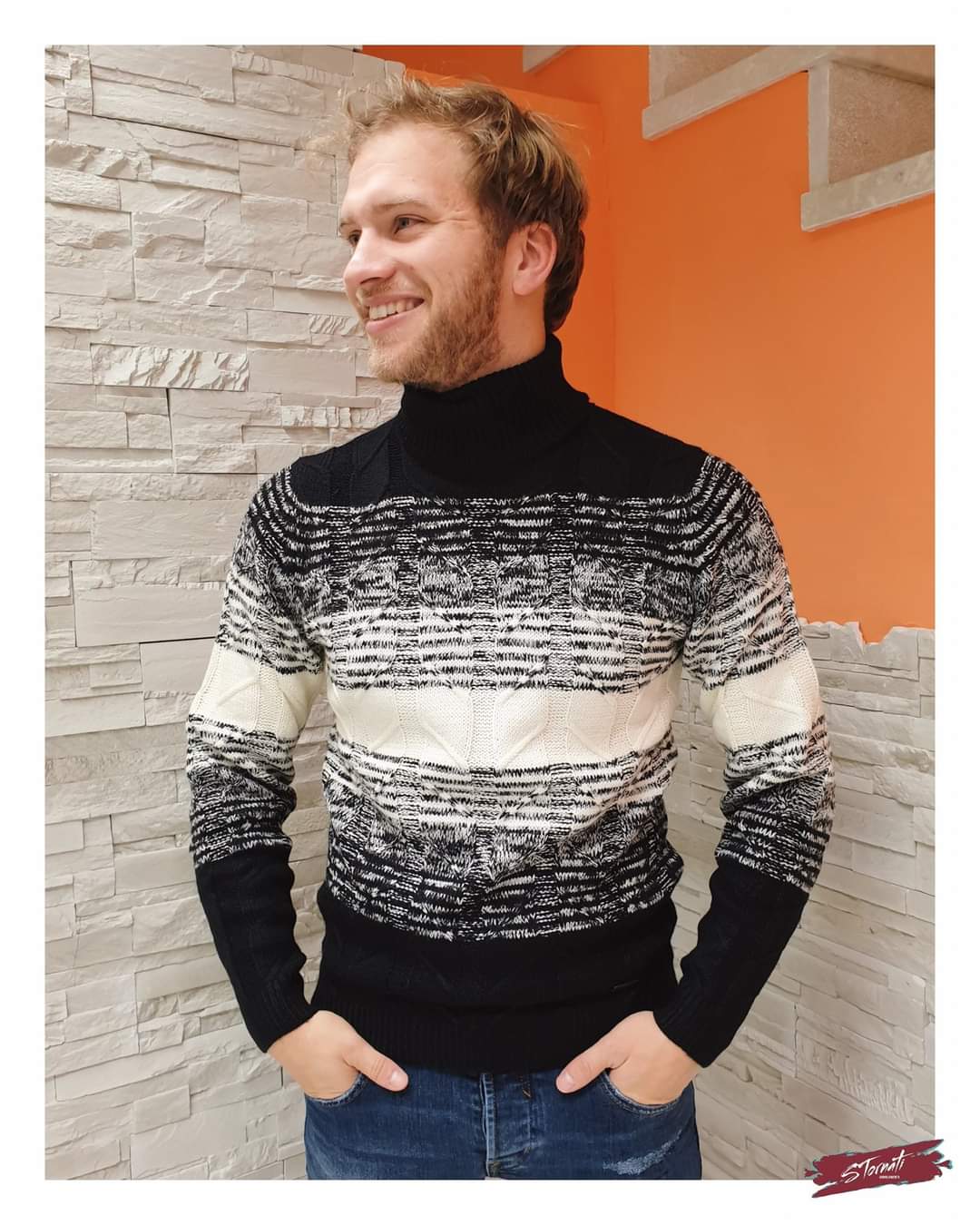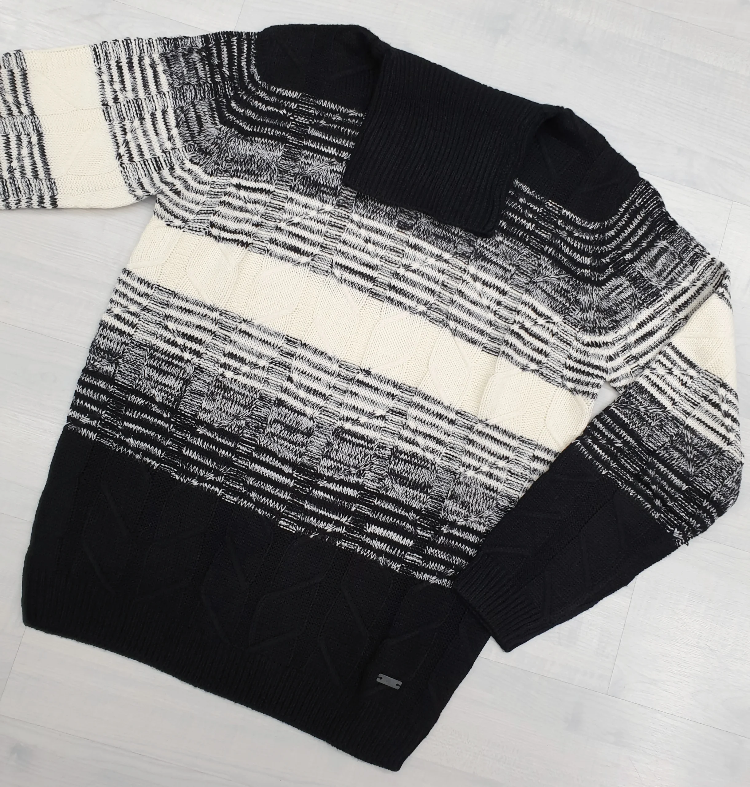 Maglia dolcevita nero righe latte degradè in tricot lavorazione losanghe tono su tono.