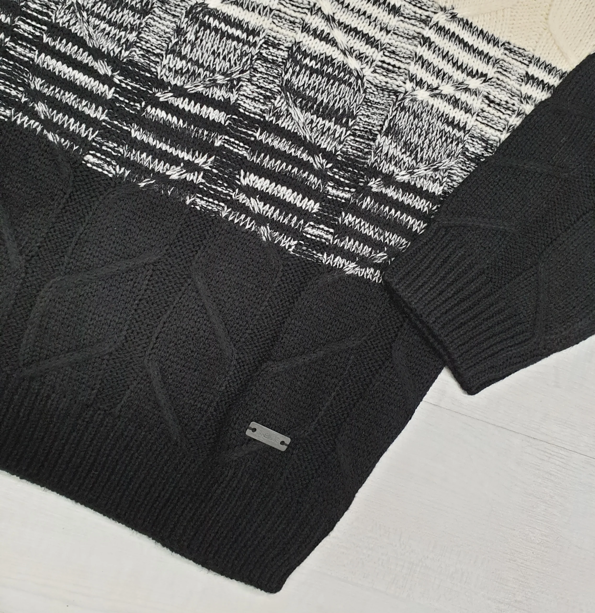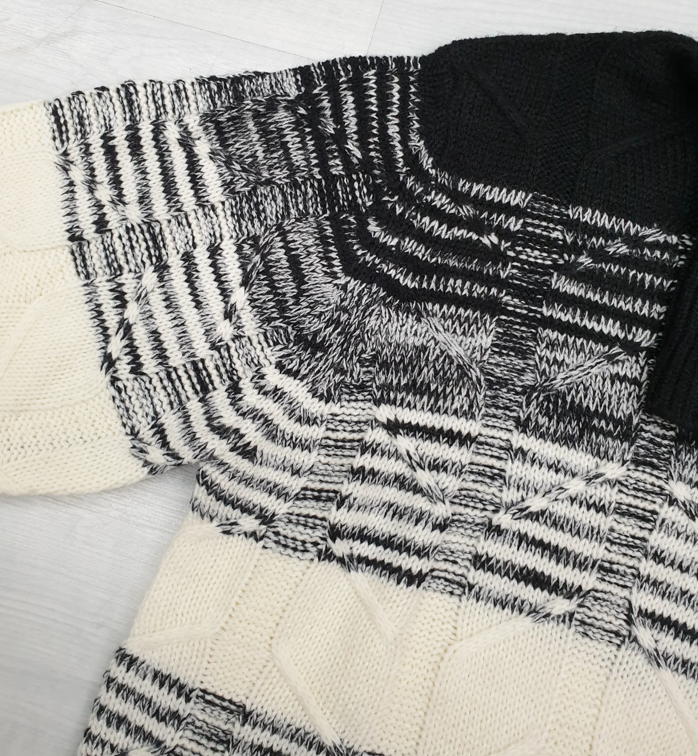 Maglia dolcevita nero righe latte degradè in tricot lavorazione losanghe tono su tono. Composizione: 85% Acrilico 15% Nylon