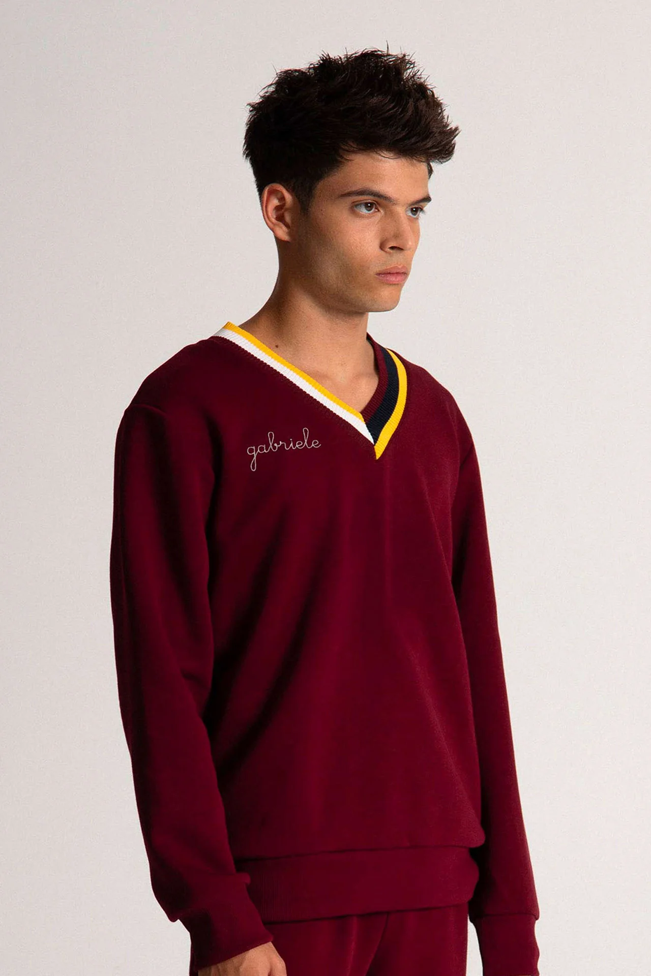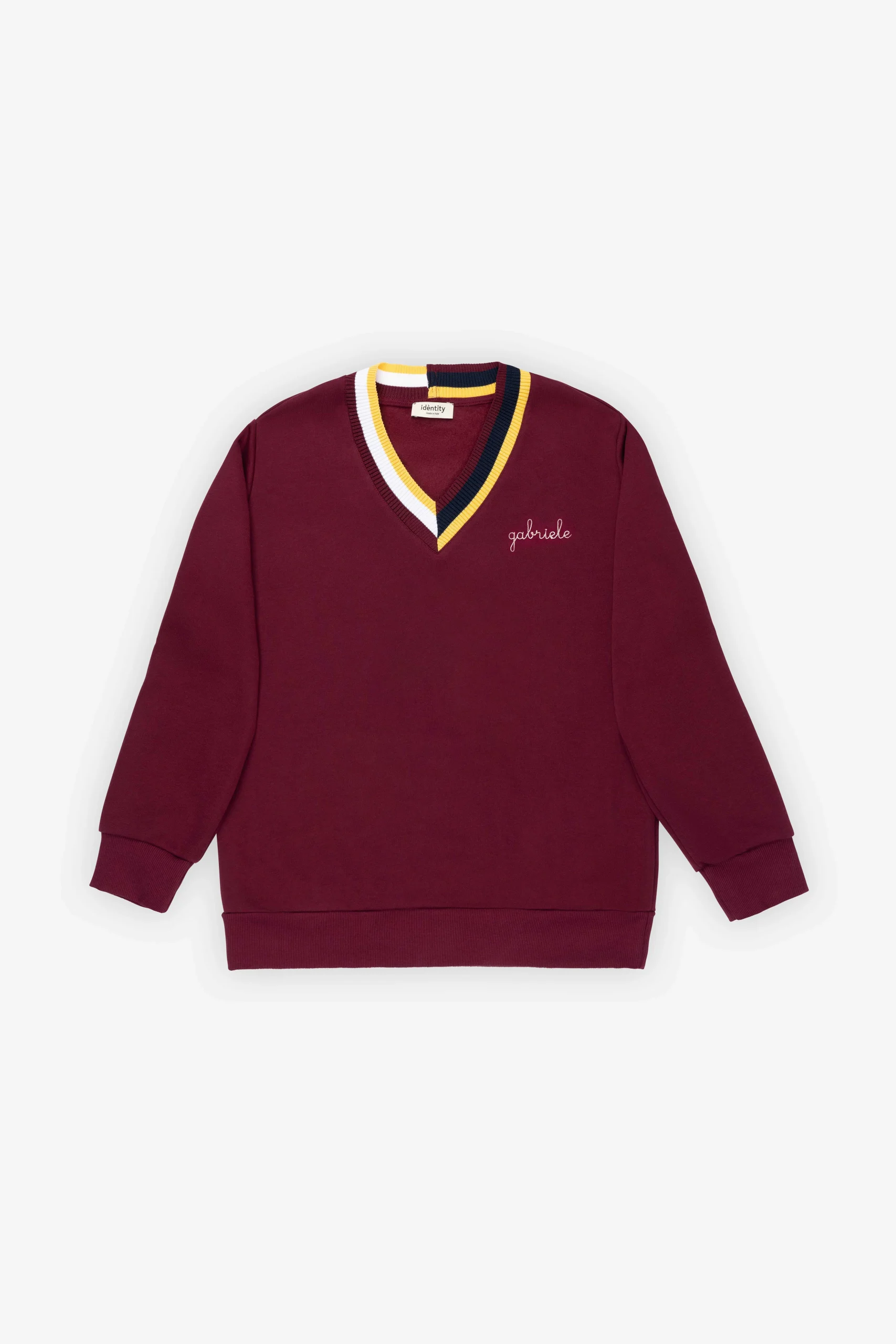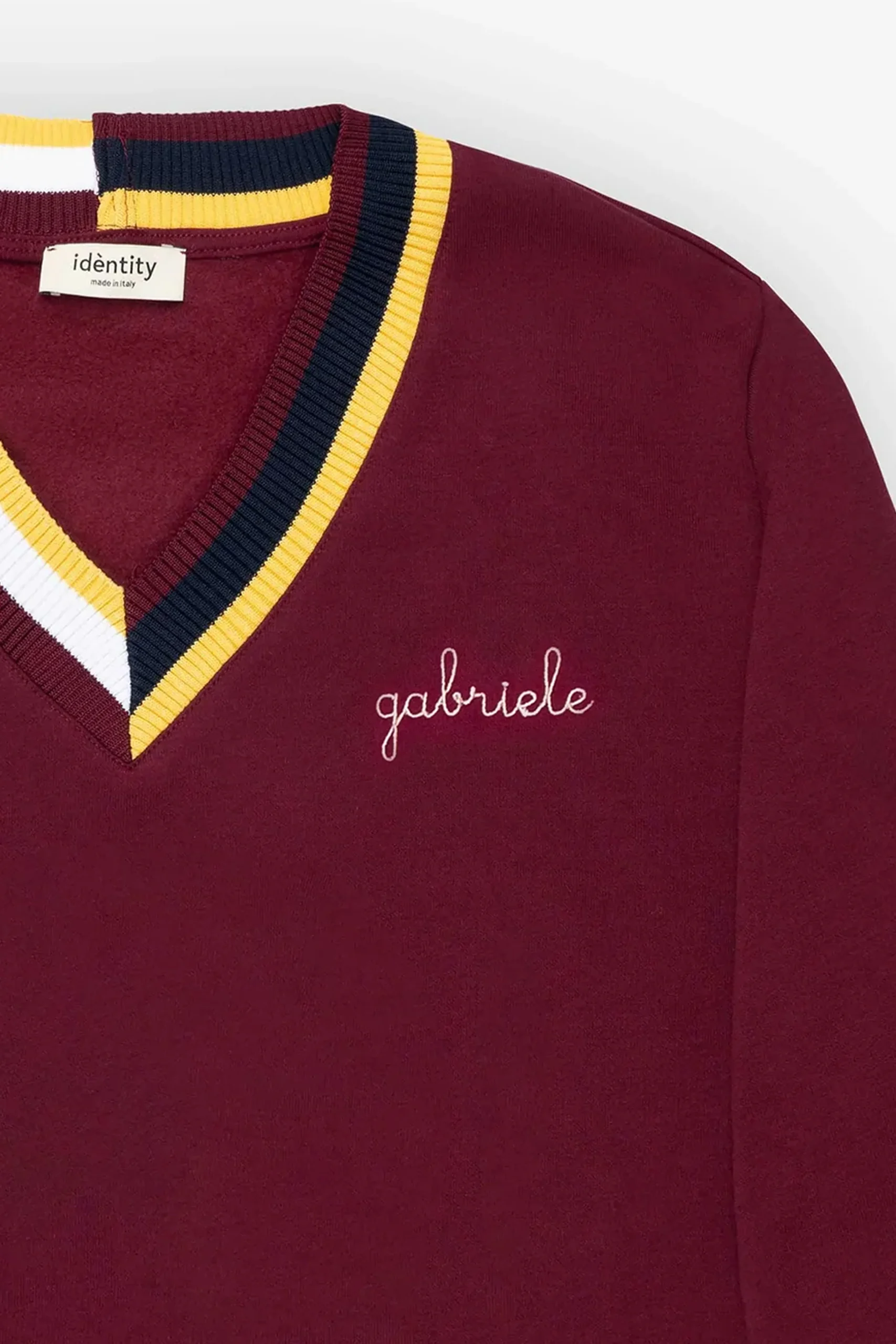 Caratterizzato da una texture accogliente in stile scuba e da un esterno super morbido, questo capo offre una vestibilità confortevole e presenta uno scollo a V a contrasto con righe nei colori barolo e senape. Realizzato con la massima cura per i dettagli, questo pezzo dallo stile preppy è l’opzione ideale per le stagioni più fredde, vantando un design classico Made in Italy che può essere personalizzato con il nome o l’iniziale desiderata.