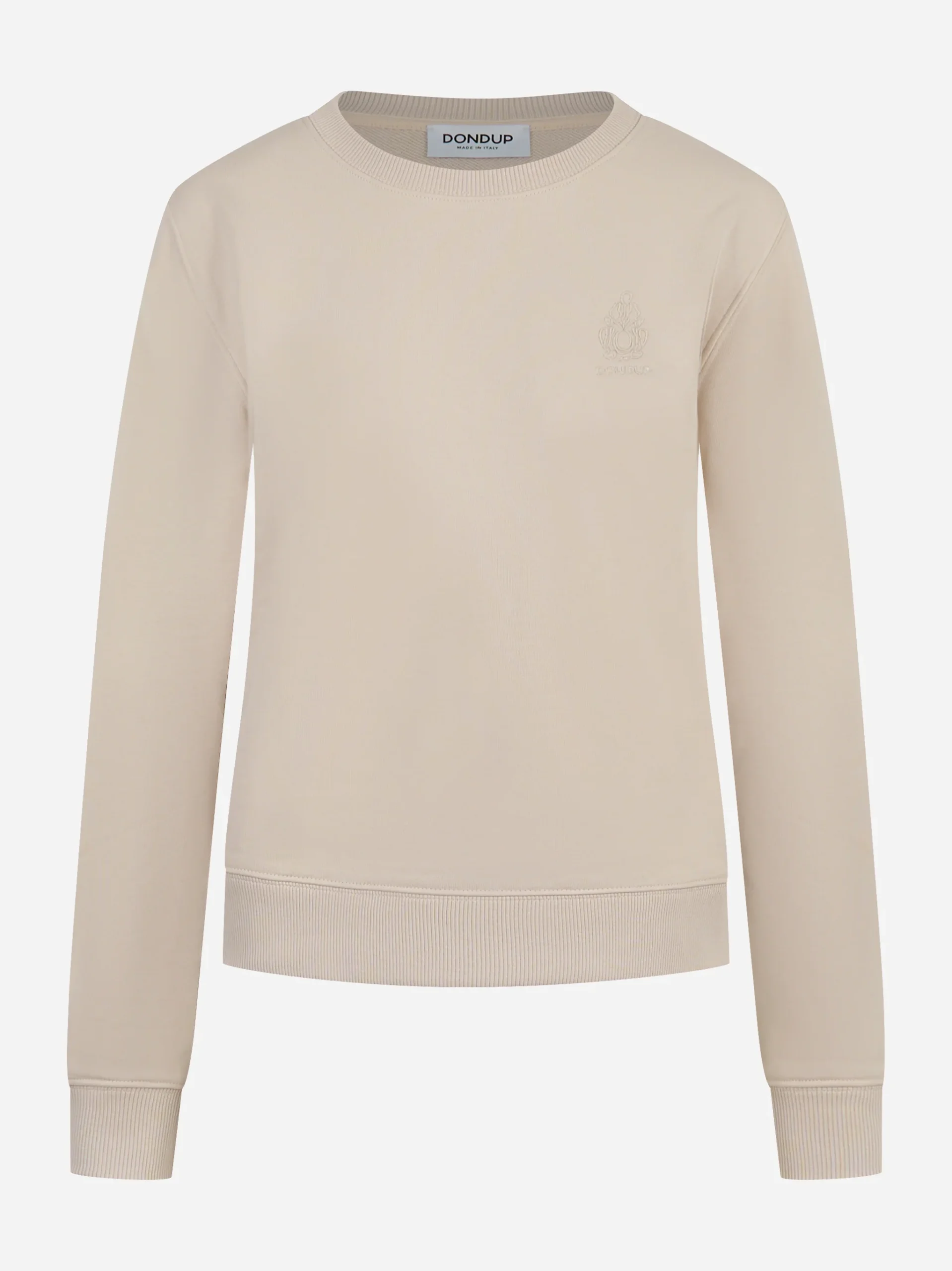 ITEM INFO Felpa girocollo slim beige Logo ricamato sul petto Linea slim con maniche lunghe Girocollo a costine Polsini e orlo con finitura elasticizzata Perfetta per outfit casual Composizione: 12% poliestere, 88% cotone