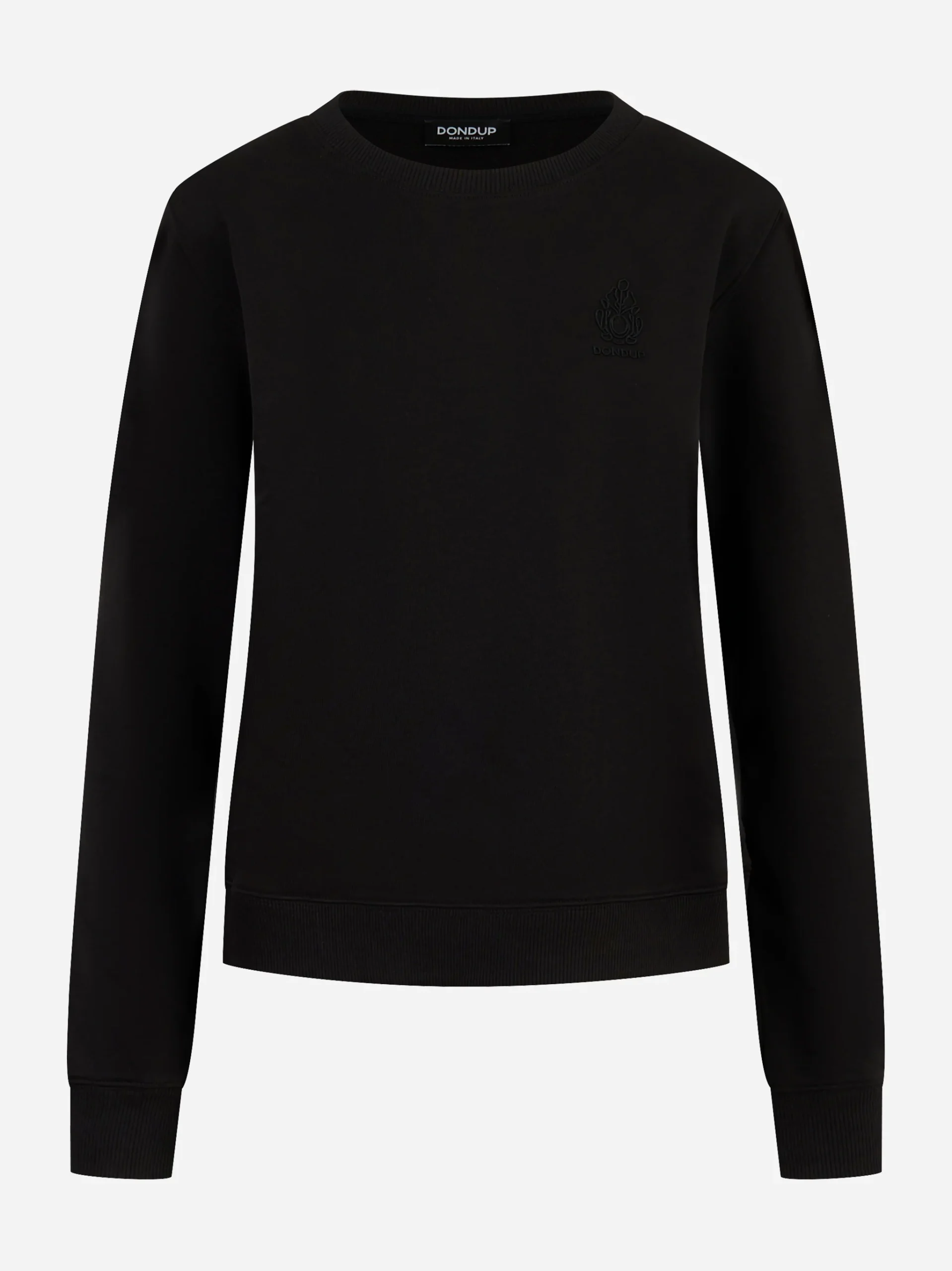 ITEM INFO Felpa girocollo in cotone color nero Logo Dondup ricamato tono su tono sul petto Collo, polsini e fondo in maglia a costine Maniche lunghe con taglio regolare Vestibilità slim con linea essenziale Orlo rifinito pulito Composizione: 88% Cotone, 12% Poliestere Made in Italy