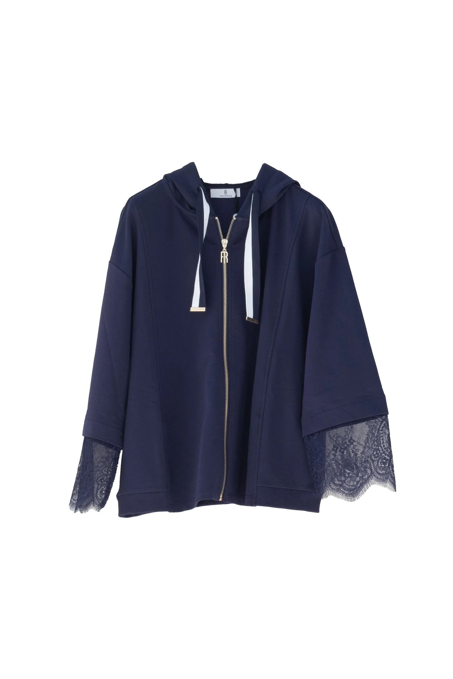 Felpa regular lunga, con cappuccio e maniche in pizzo, zip centrale per apertura, tasche sui fianchi, e con maniche lunghe.