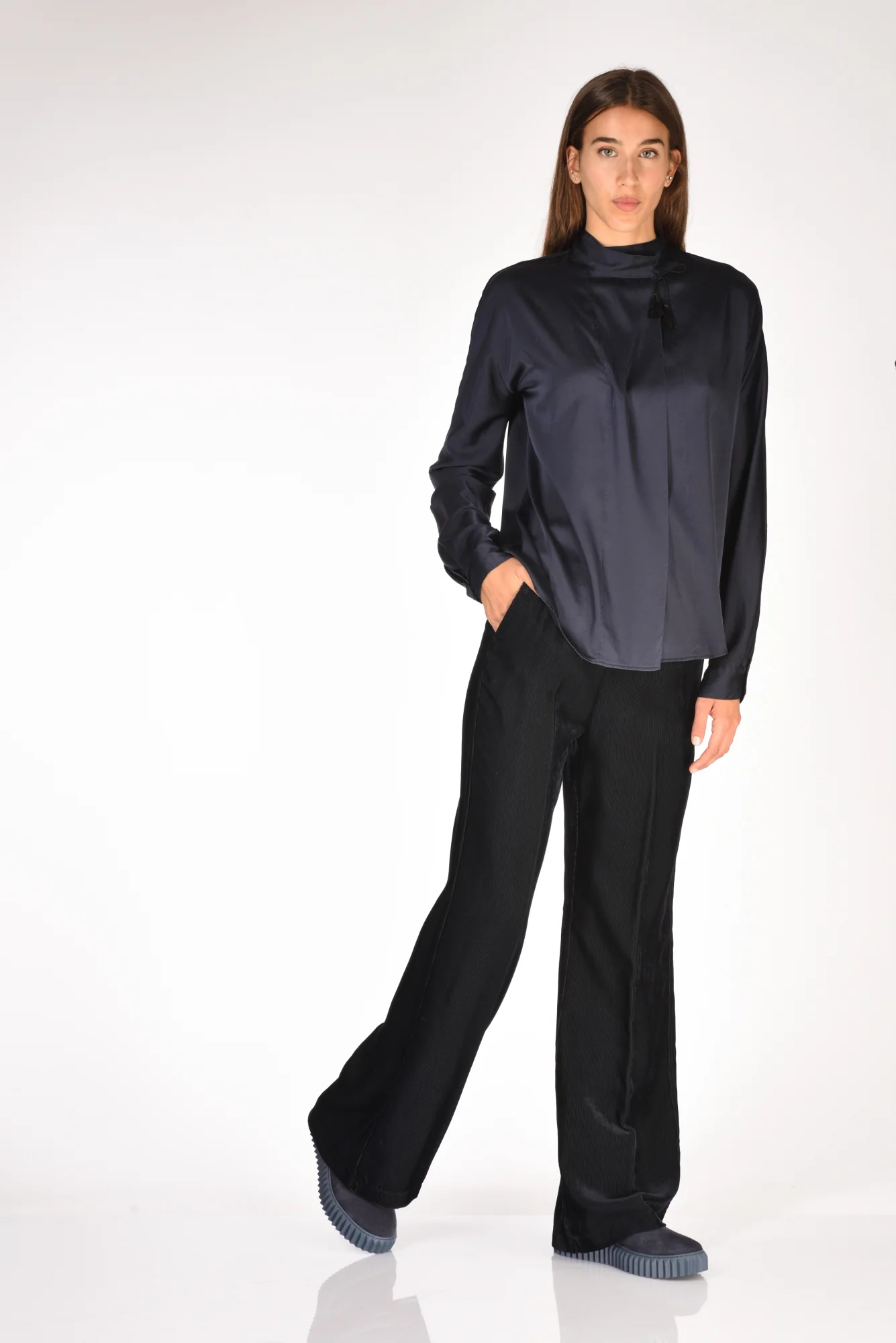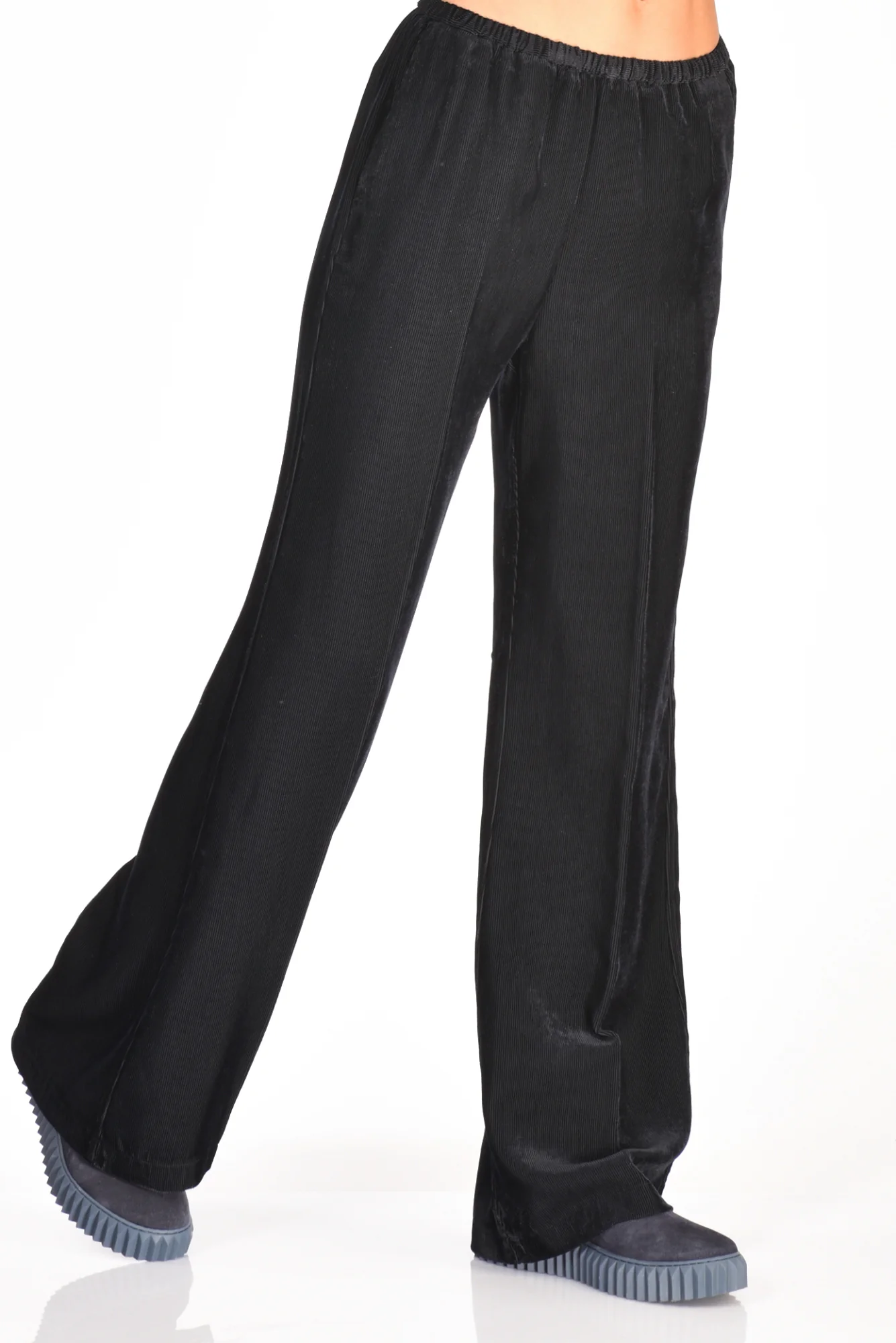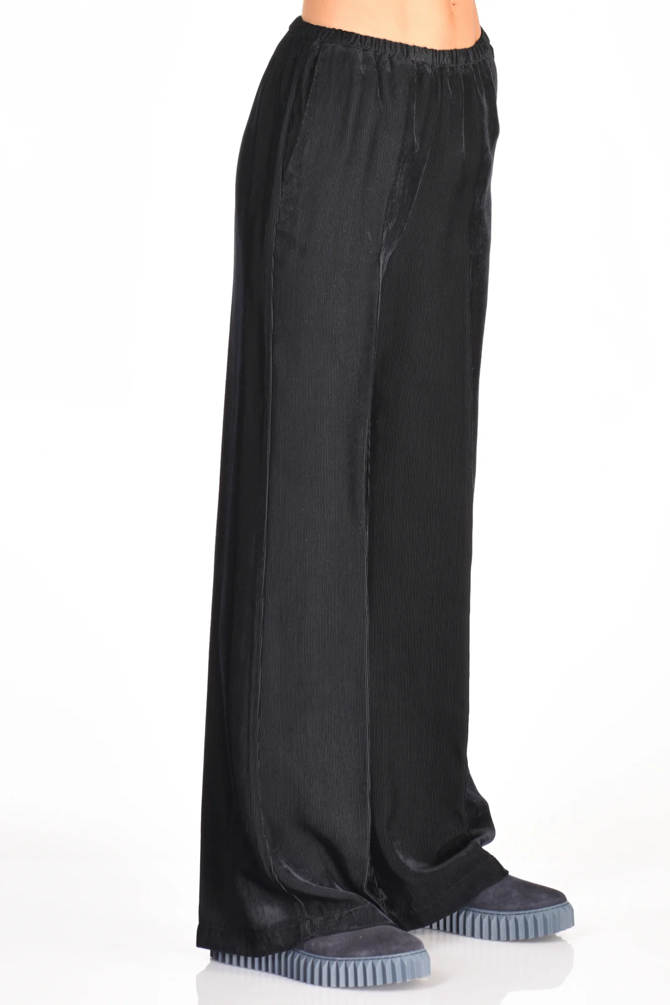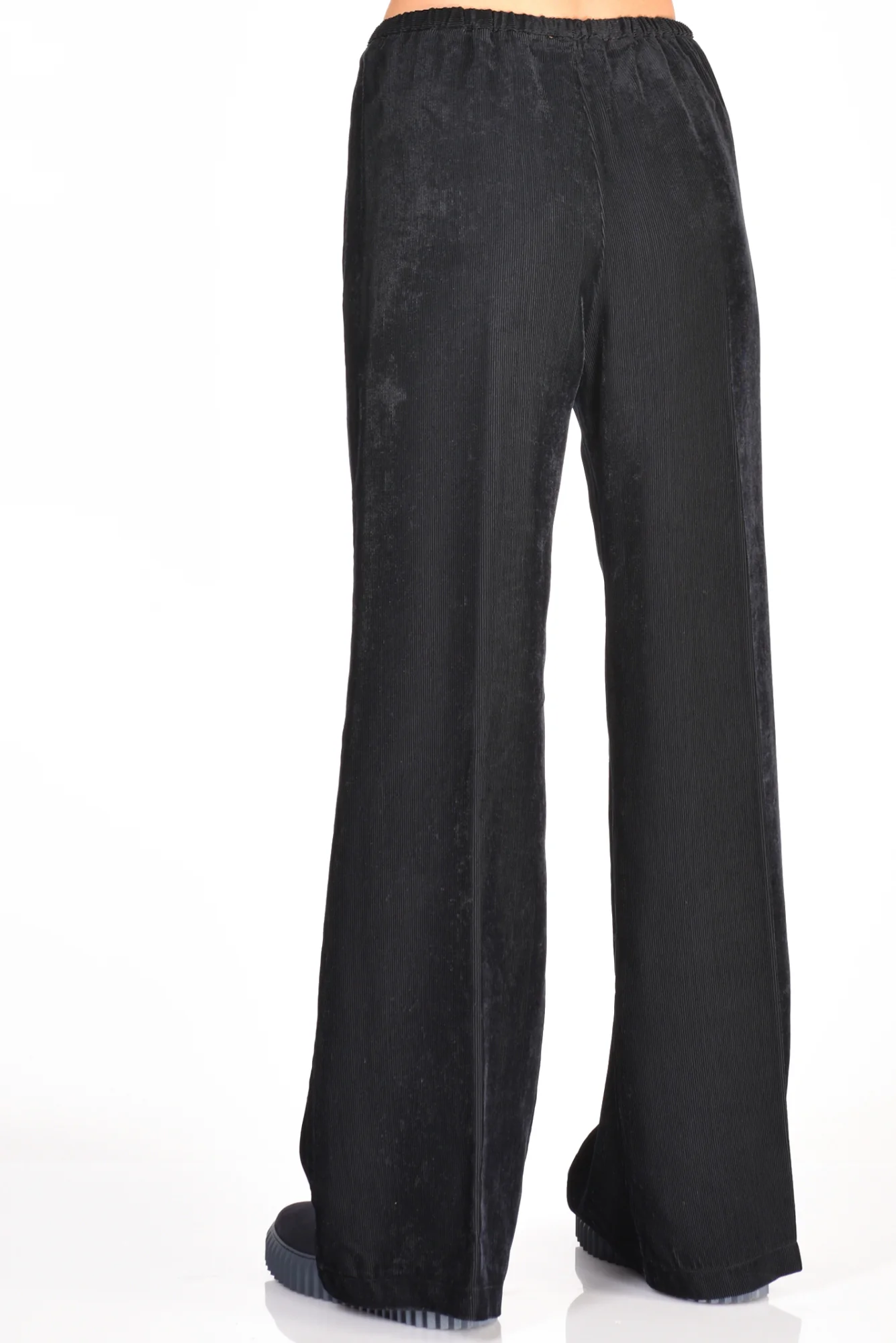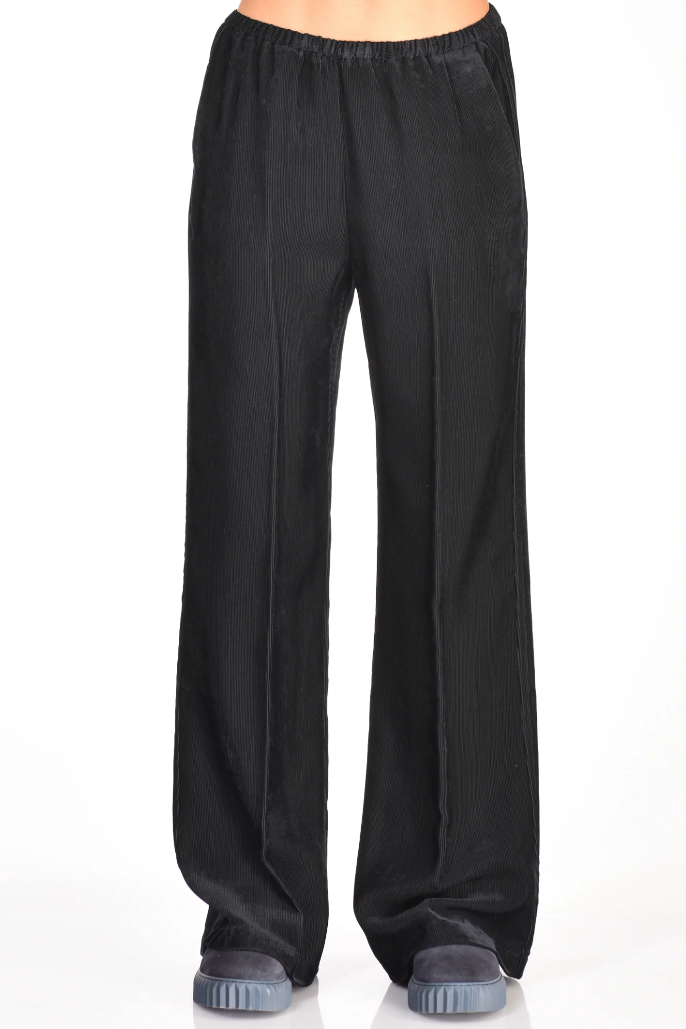 Pantaloni Palazzo Effetto Vellutto Matte, Tasche Laterali Alla Francese E Posteriore A Filetto, Elastico In Vita, Vestibilita’ Regular, Composizione 100 Viscosa, Made In Italy.