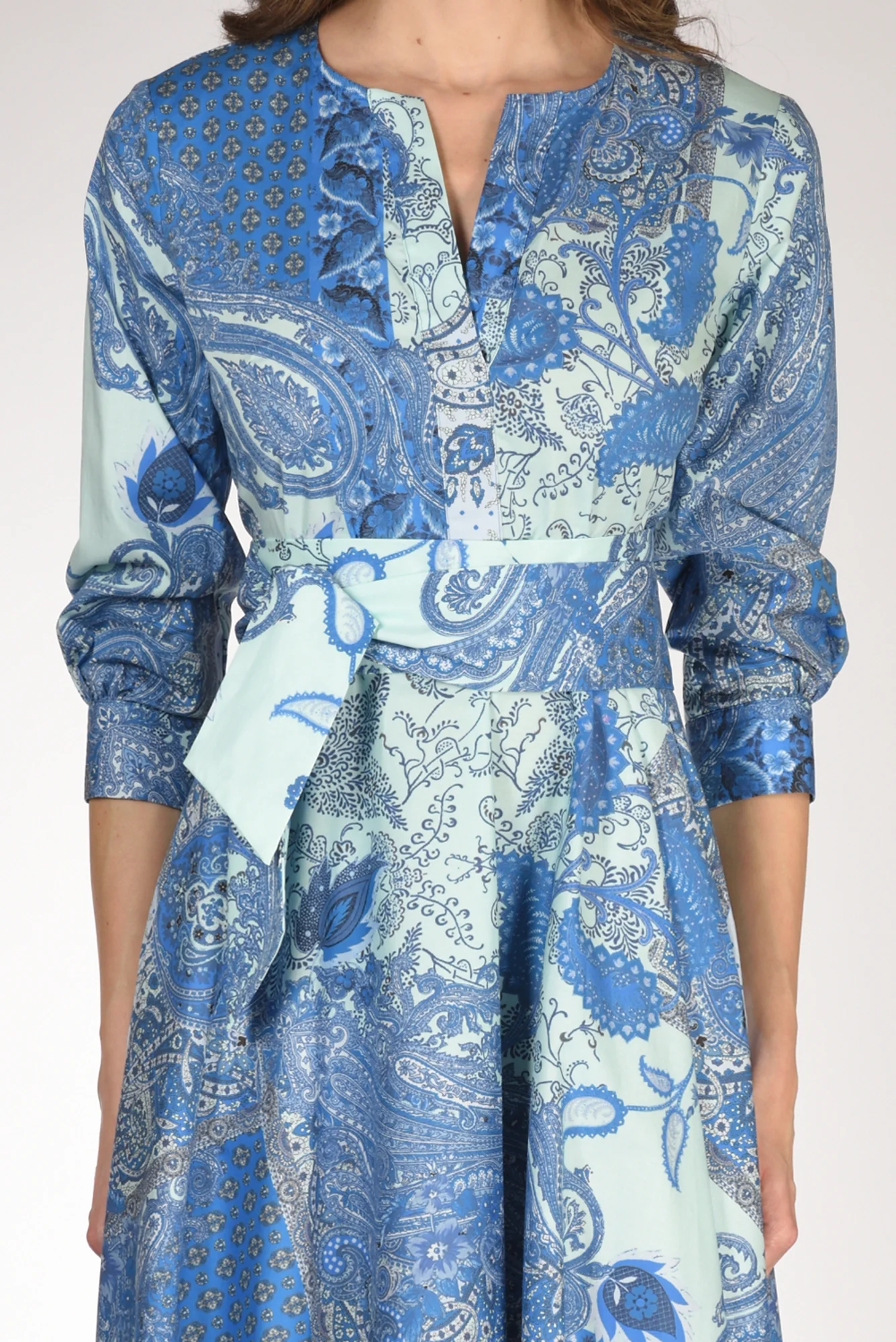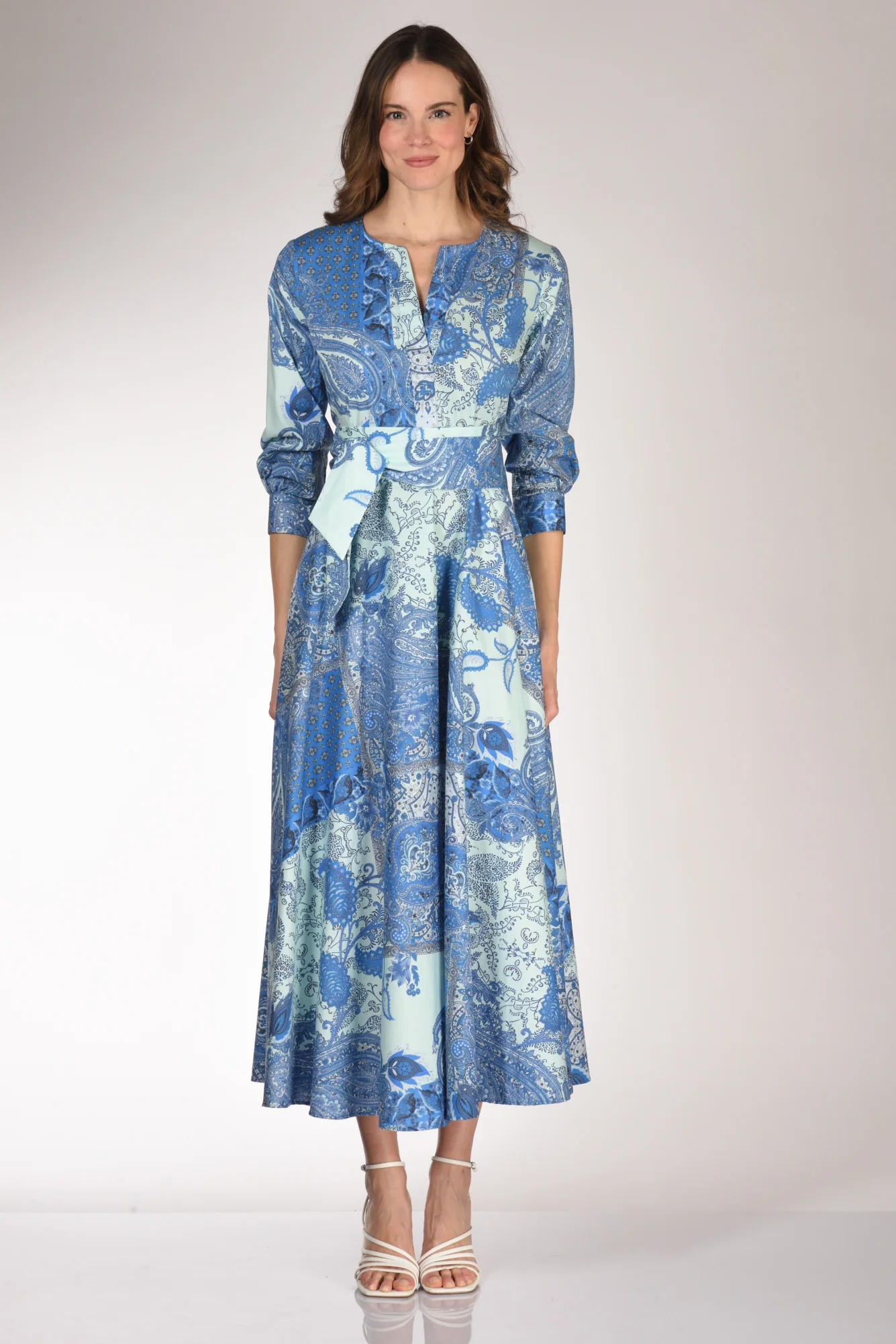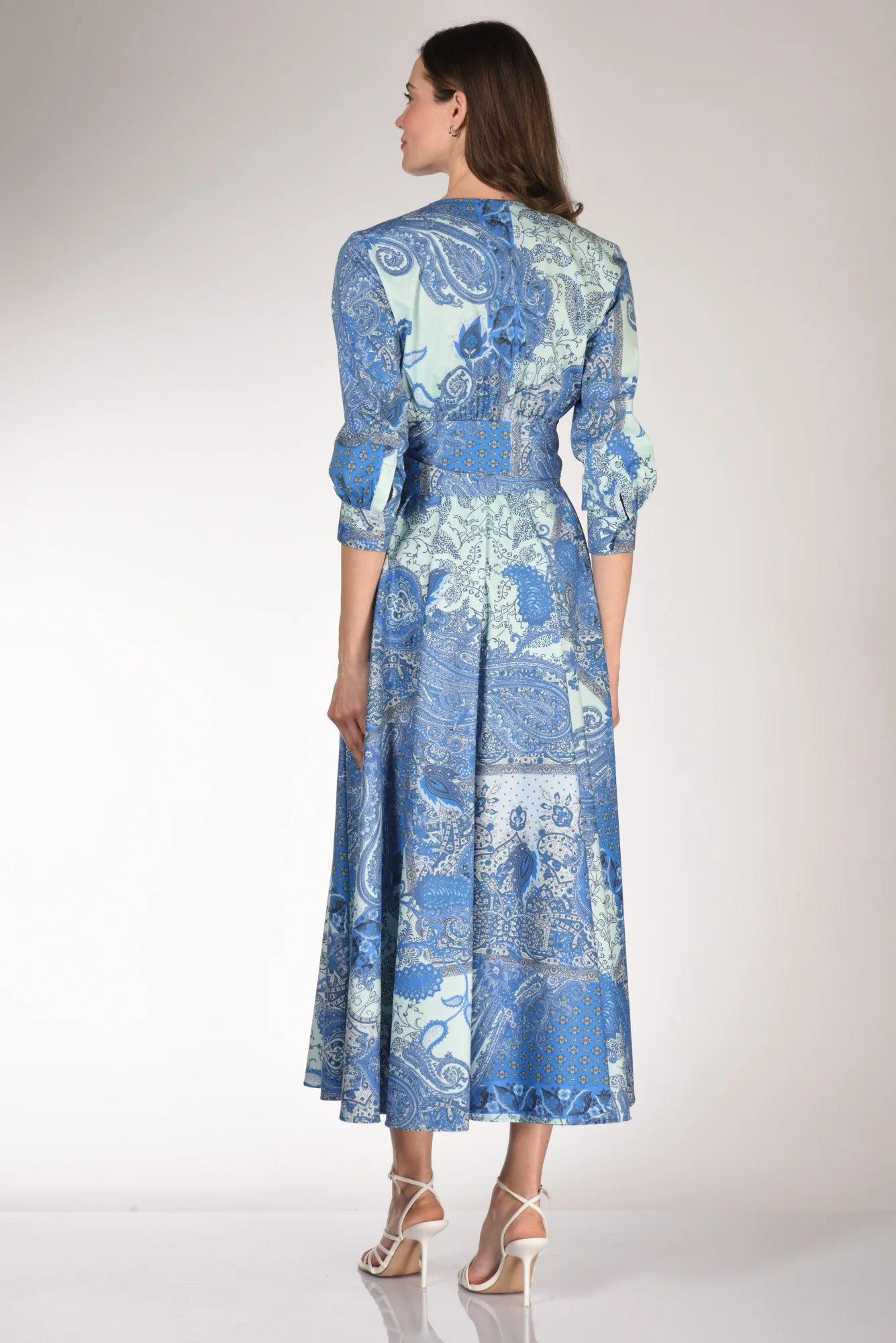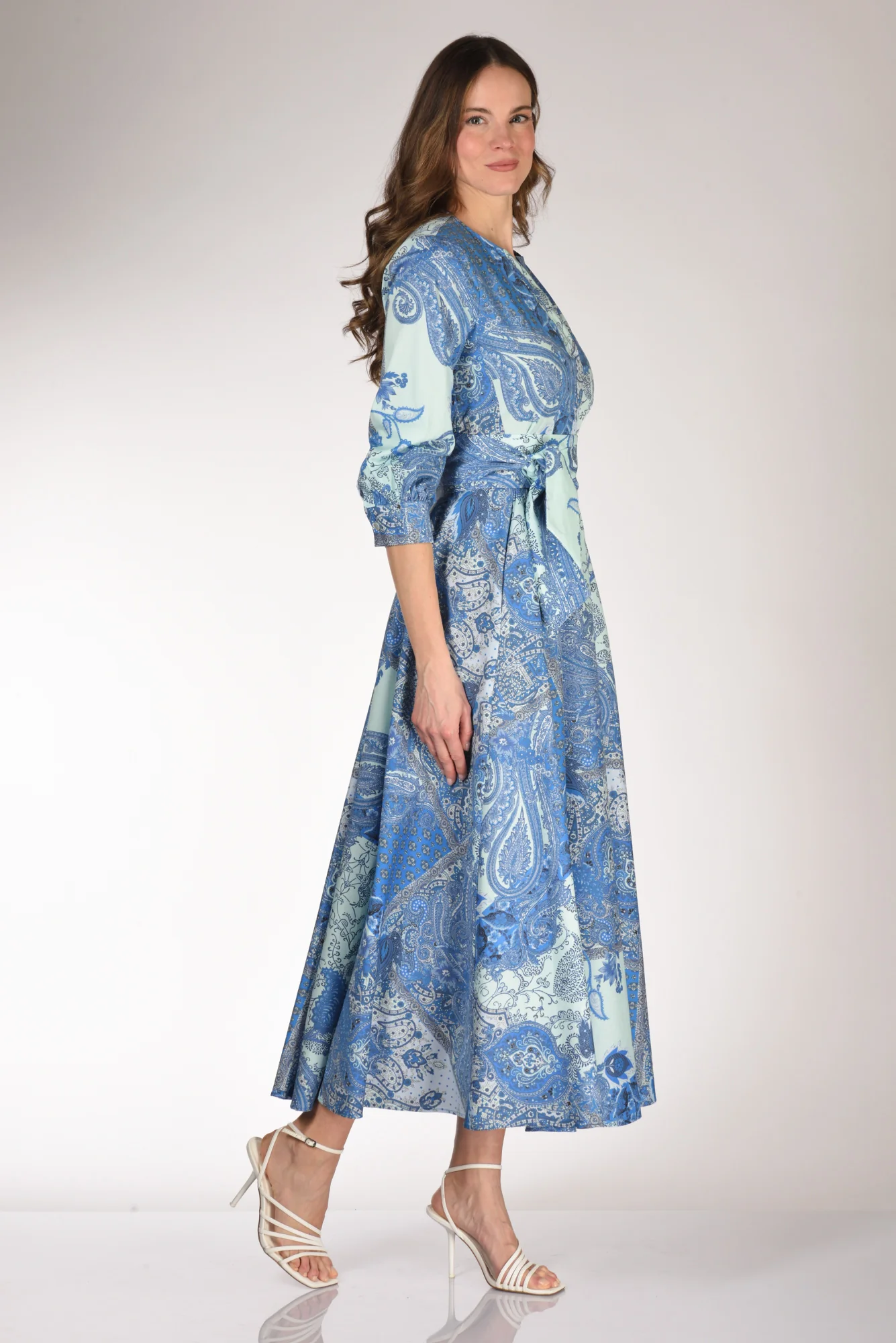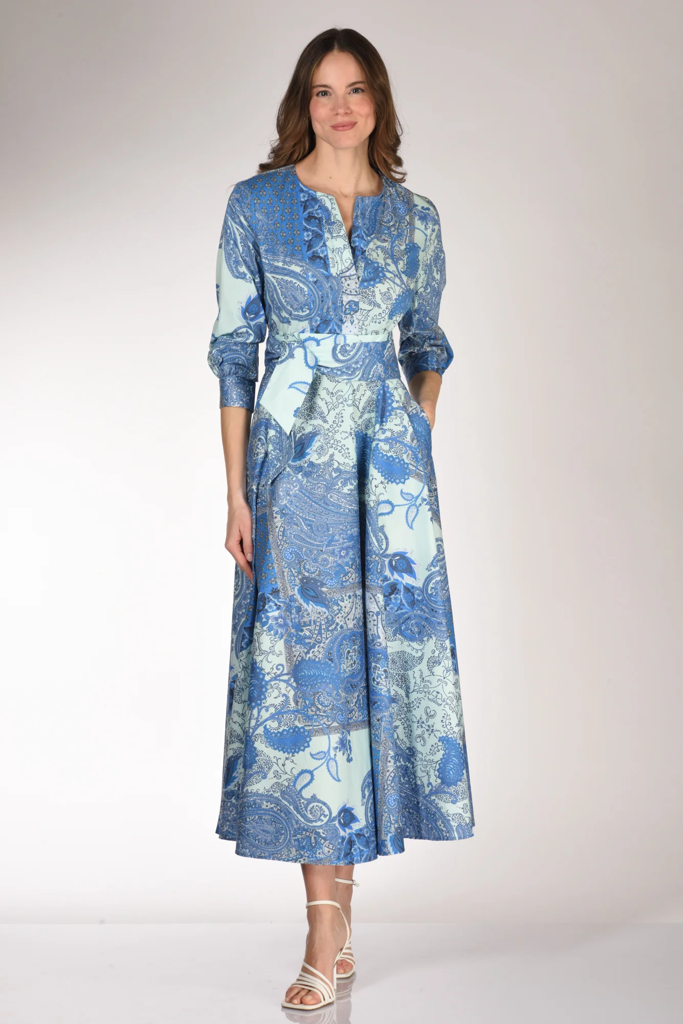 Abito Lungo Stampato, Manica 3/4, Taglio In Vita Con Elastico Posteriore, Gonna Ampia, Tasche Inserite Nel Fianco, Scollo A V, Cintura A Fusciacca Tono Su Tono, Made In Italy, Composizione 97 Cotone, 3 Elastan