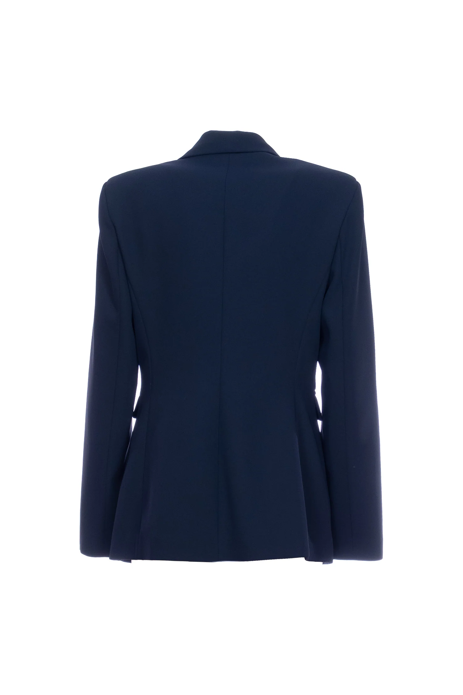 Elegante giacca blazer doppiopetto realizzata in morbido crêpe. Il collo a rever e le tasche con patta aggiungono un tocco di classe, mentre le maniche lunghe con bottoni sul fondo completano il look raffinato. Perfetta per un outfit sofisticato e chic.