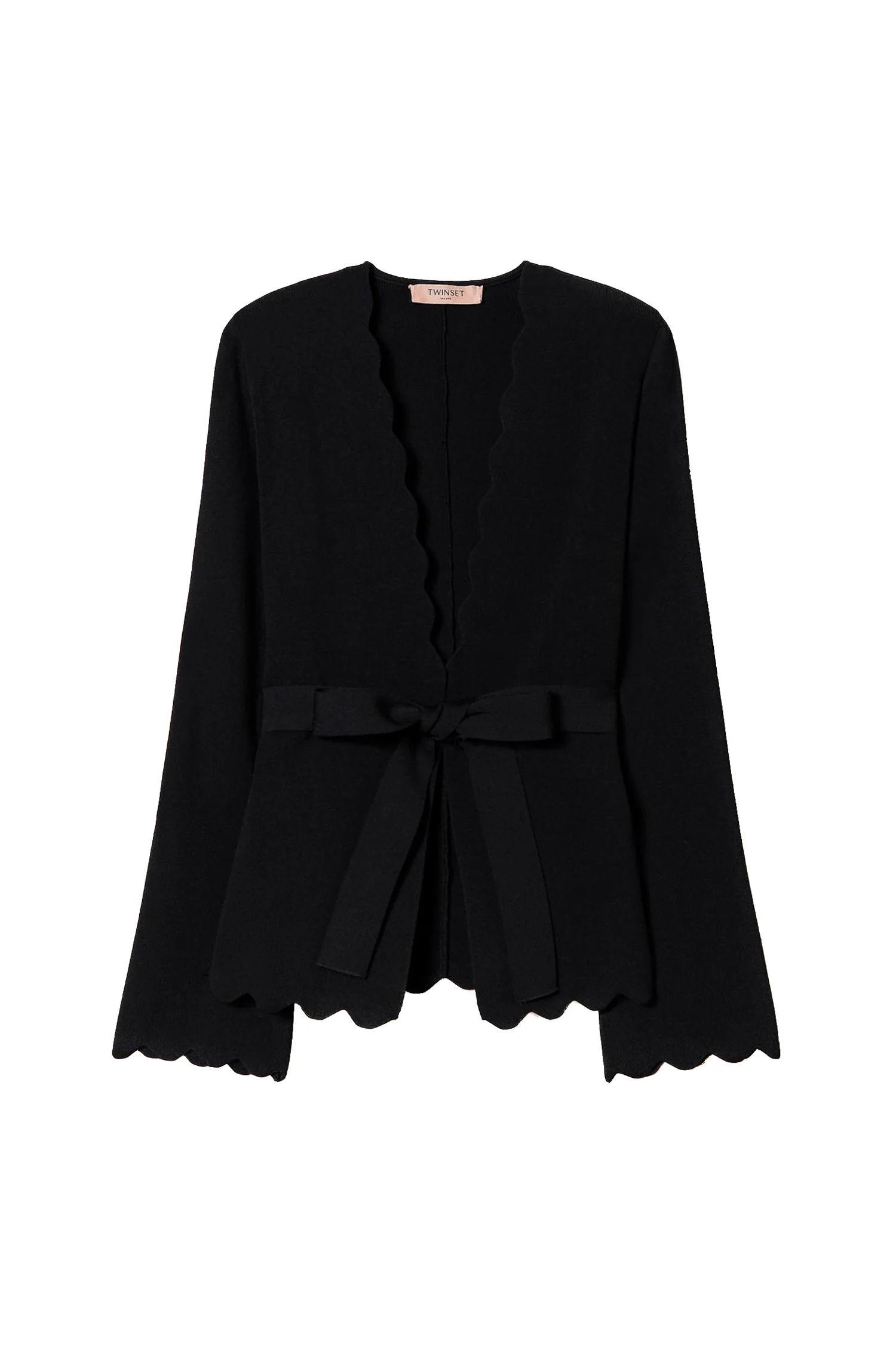 Giacca blazer in maglia di viscosa stretch con mano crêpe, profili smerlati, linea fitted, cintura abbinata.
