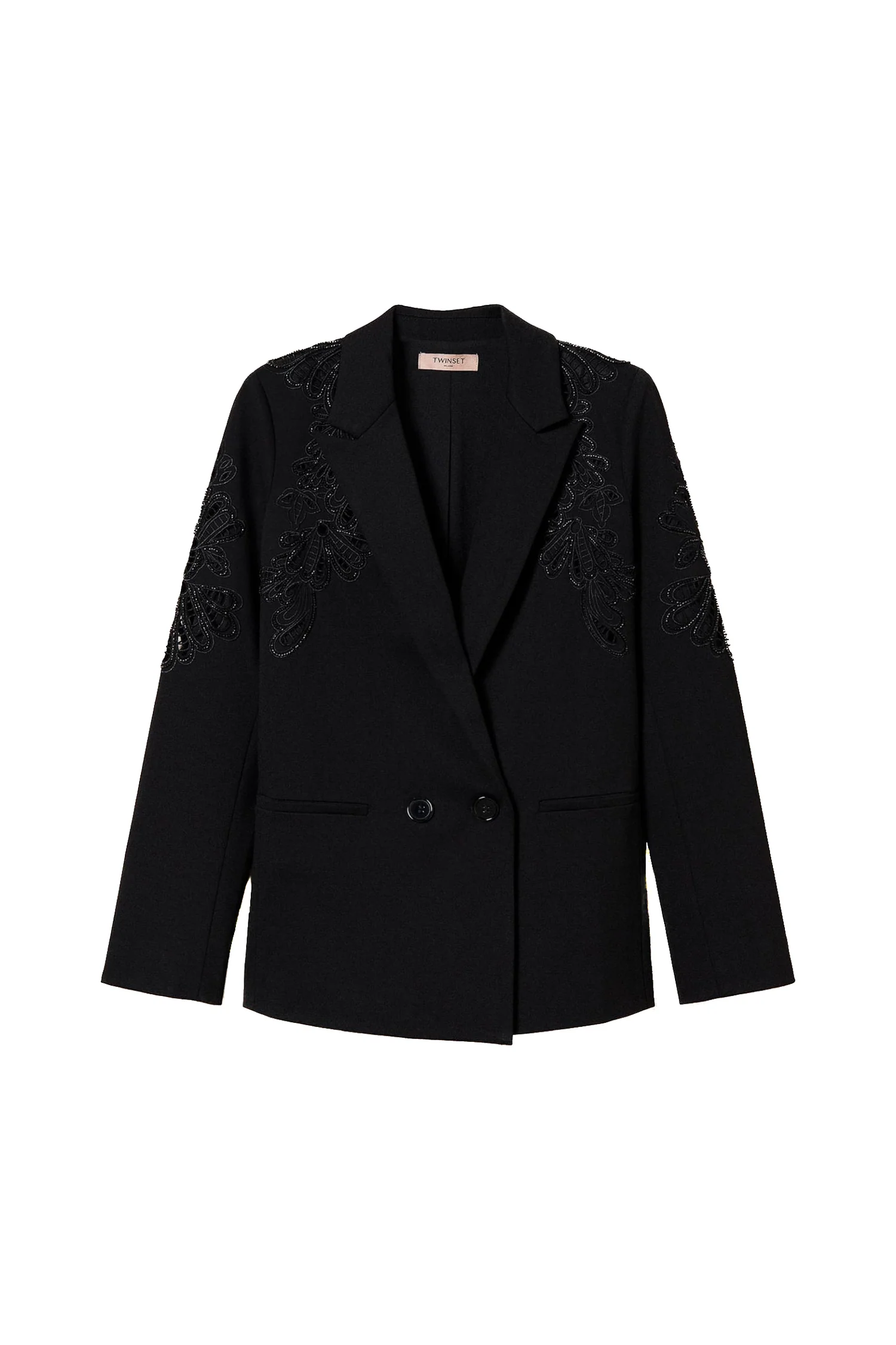 Giacca blazer in punto Milano di misto viscosa stretch con ricami a filo a intaglio e perline ricamate a mano, chiusura doppiopetto.