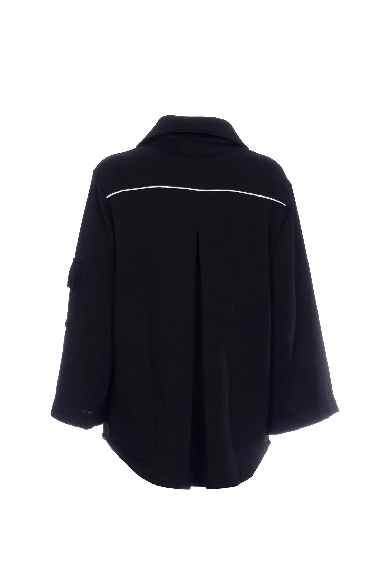 Questa giacca vanta un design raffinato con un colletto classico, una chiusura frontale con bottoni e due pratiche tasche applicate con bottoni a pressione. Le maniche ampie presentano un dettaglio con tasca laterale, conferendo un tocco moderno e funzionale.