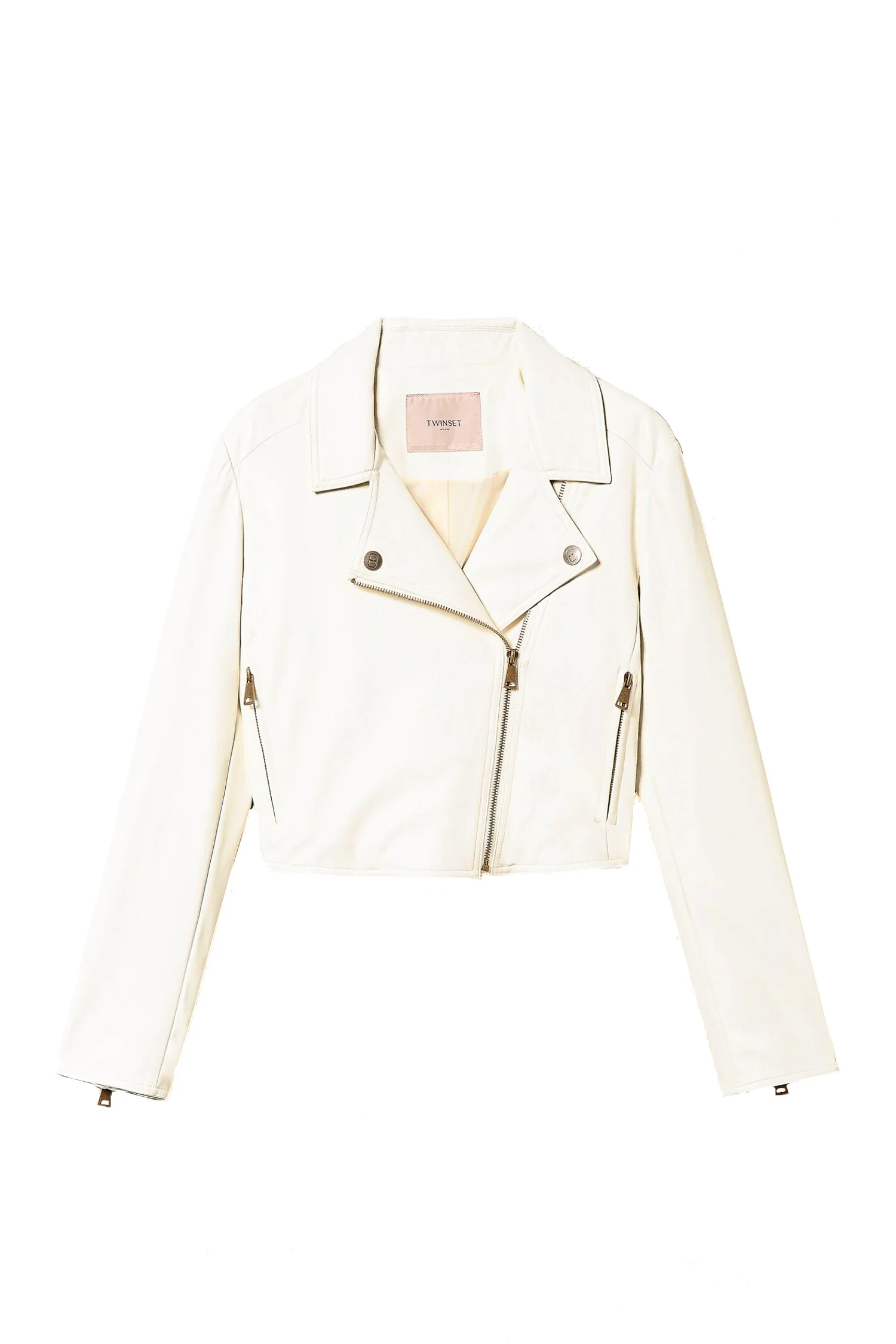 Twinset presenta la giacca biker effetto nappa plongé con chiusura doppiopetto con zip, tasche a filetto, maniche lunghe con zip, bottoni in metallo con logo Oval T, foderata. Questo capospalla sarà il completamento perfetto di tutti i tuoi look di stagione.