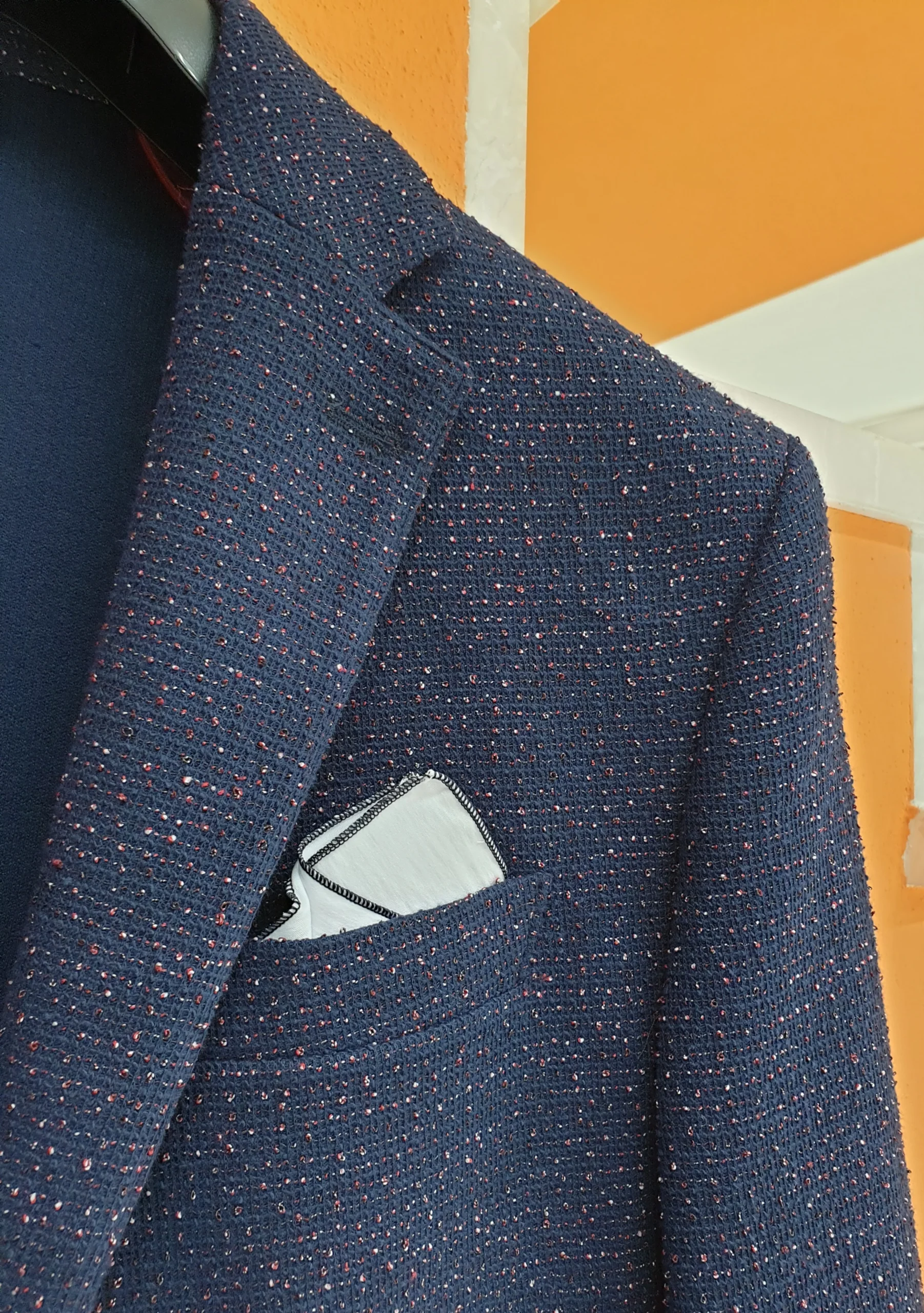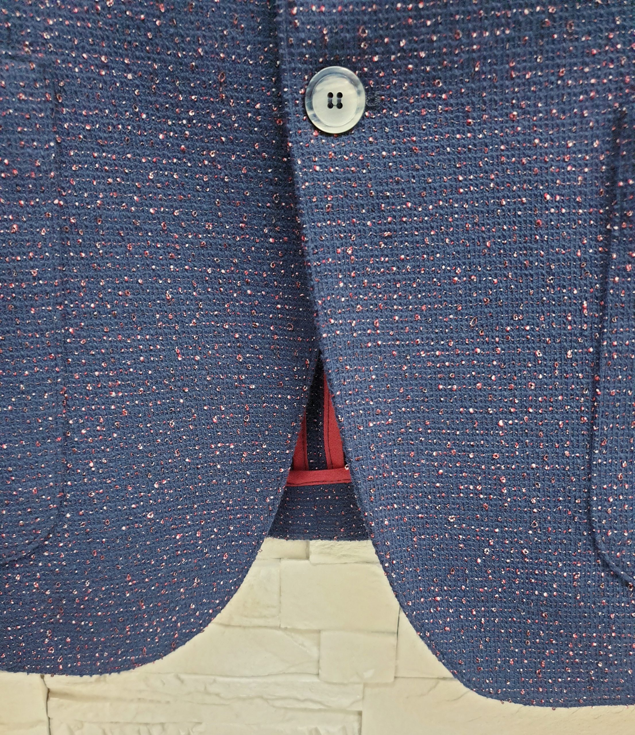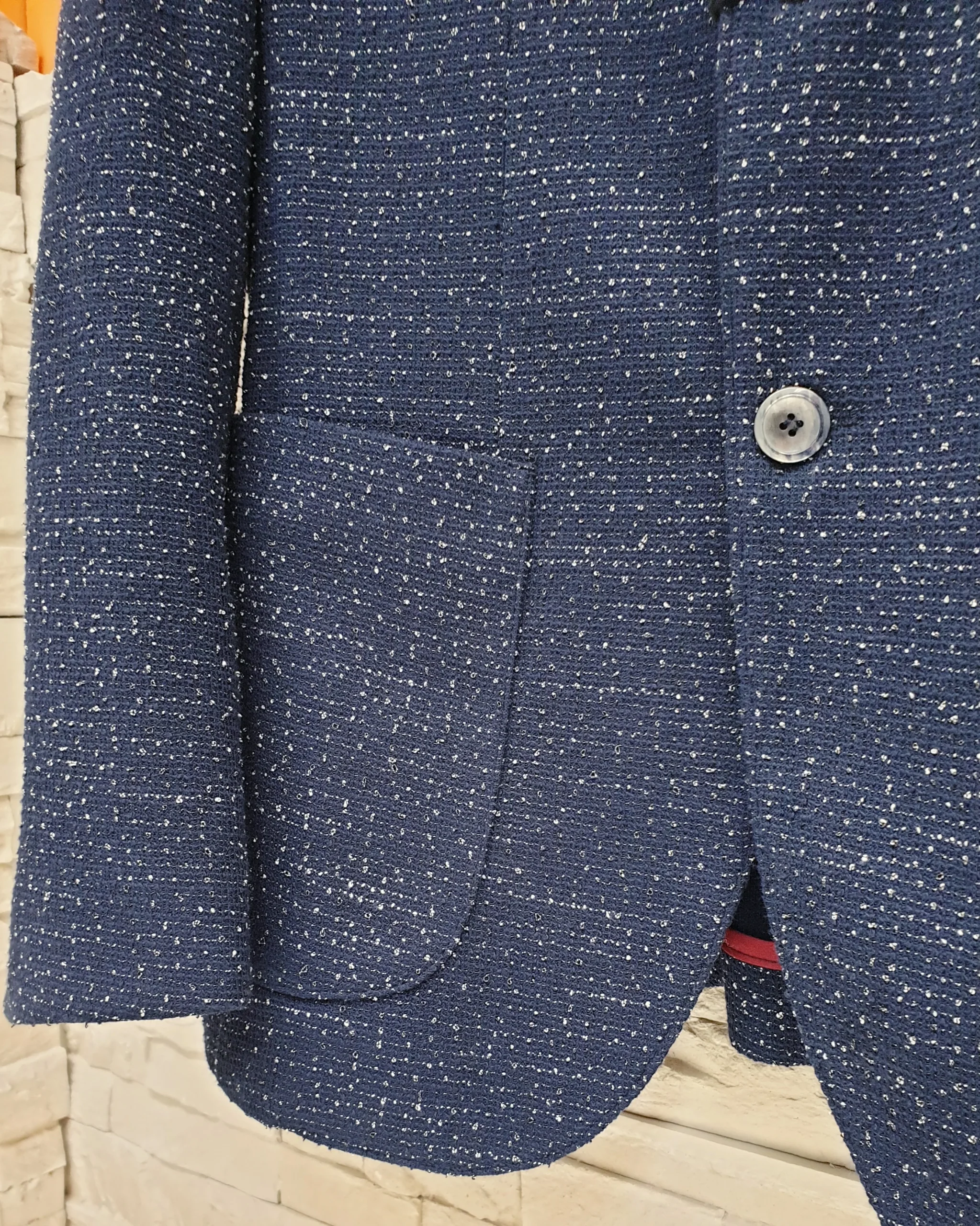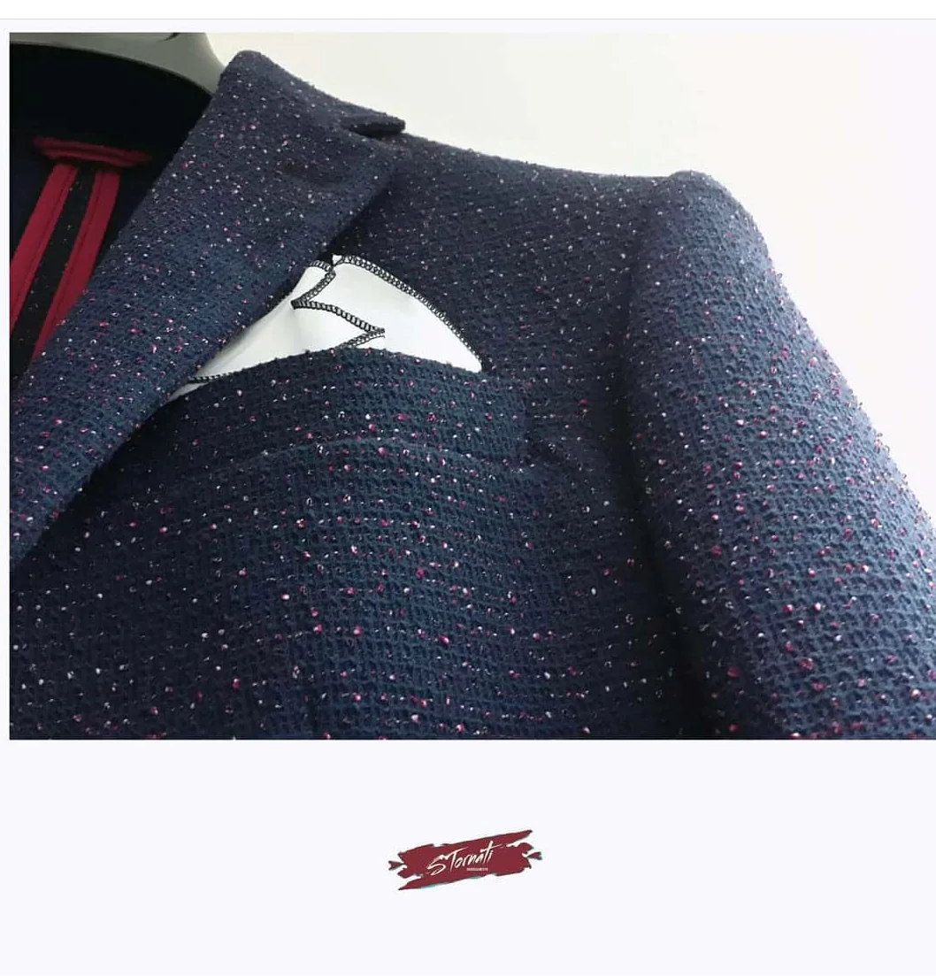 Giacca blu slim effetto graffiato con fili in rilievo. Composizione: 60% Poliestere 40% Cotone MADE IN ITALY