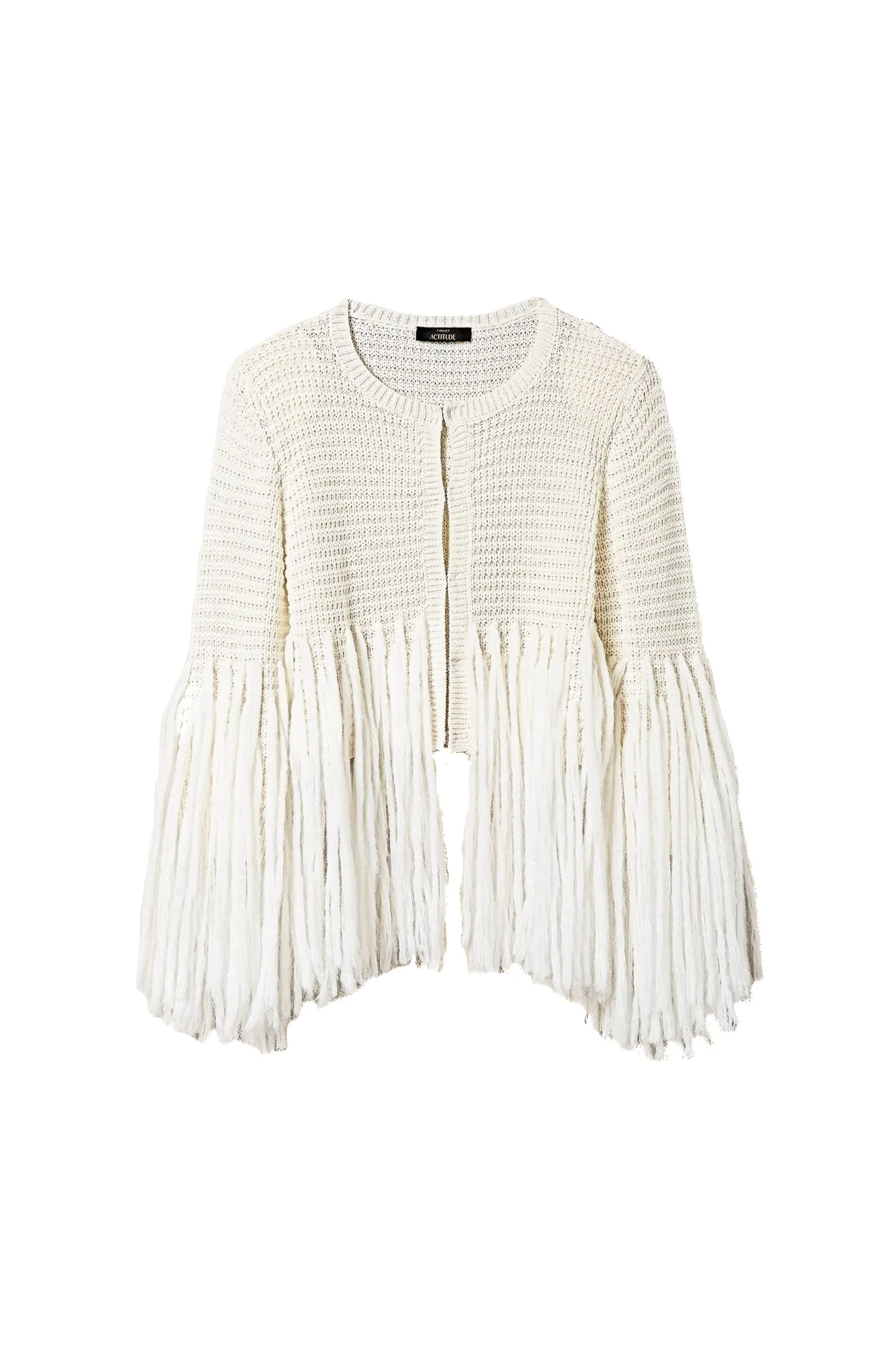 Knitwear stand out. Giacca boxy in misto lana con lavorazione punzonata e frange lunghe con lurex applicate a mano, maniche a tre quarti con spalline imbottite, chiusura con gancetti. Da indossare a pelle o in layering.