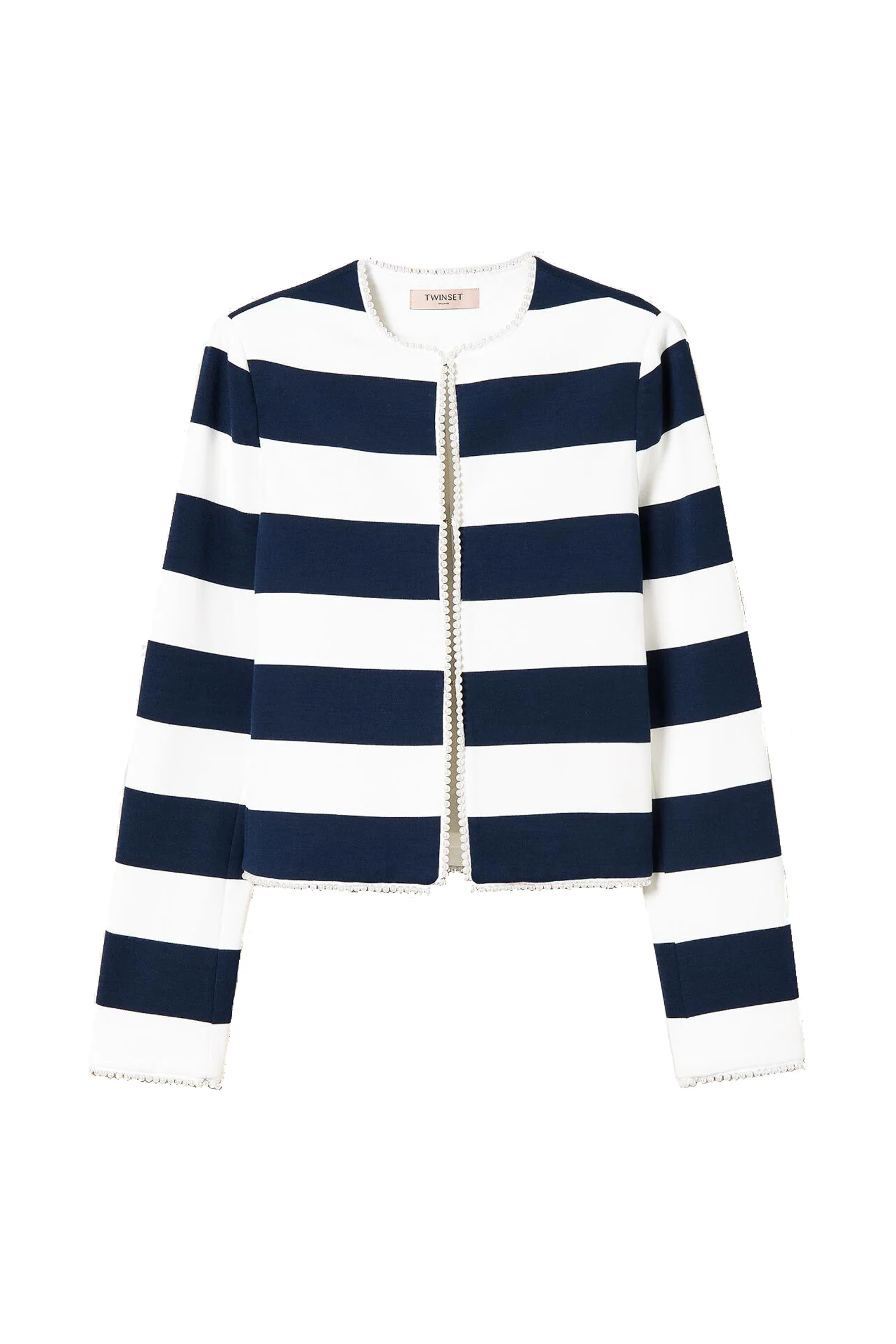 Giacca in punto Milano stretch tinto filo a righe bicolore con profili rifiniti da perle, chiusura combaciata con gancetti.