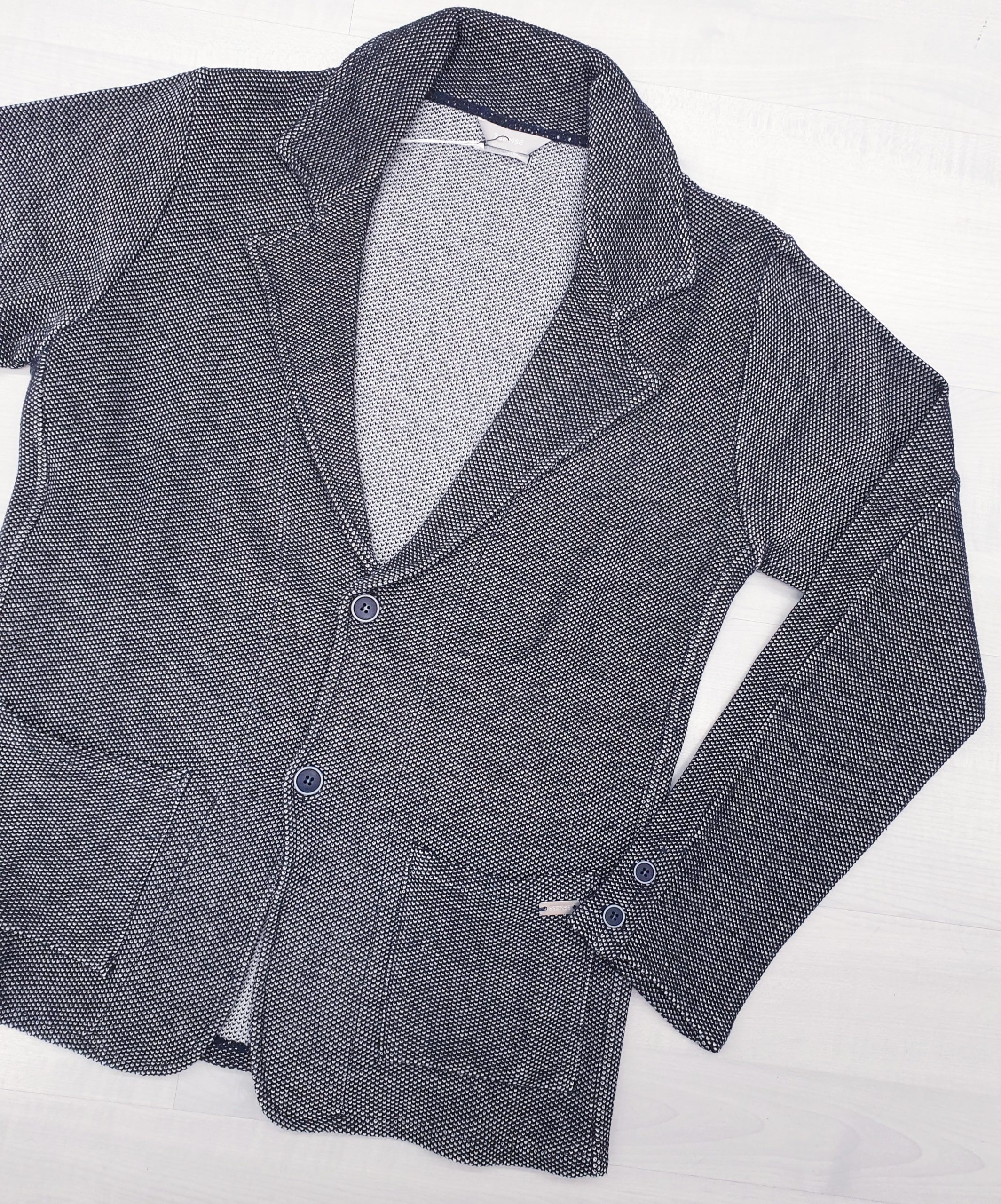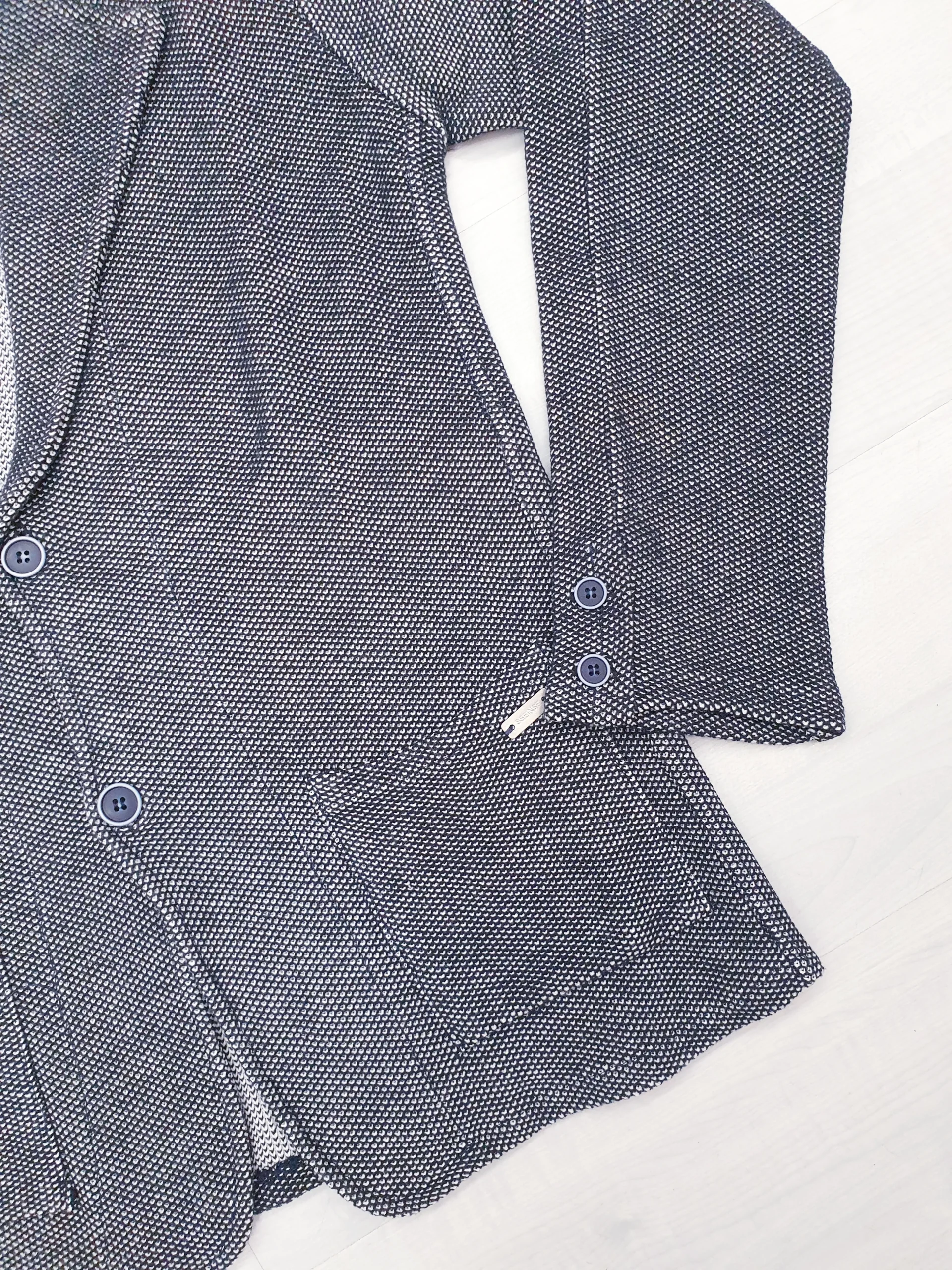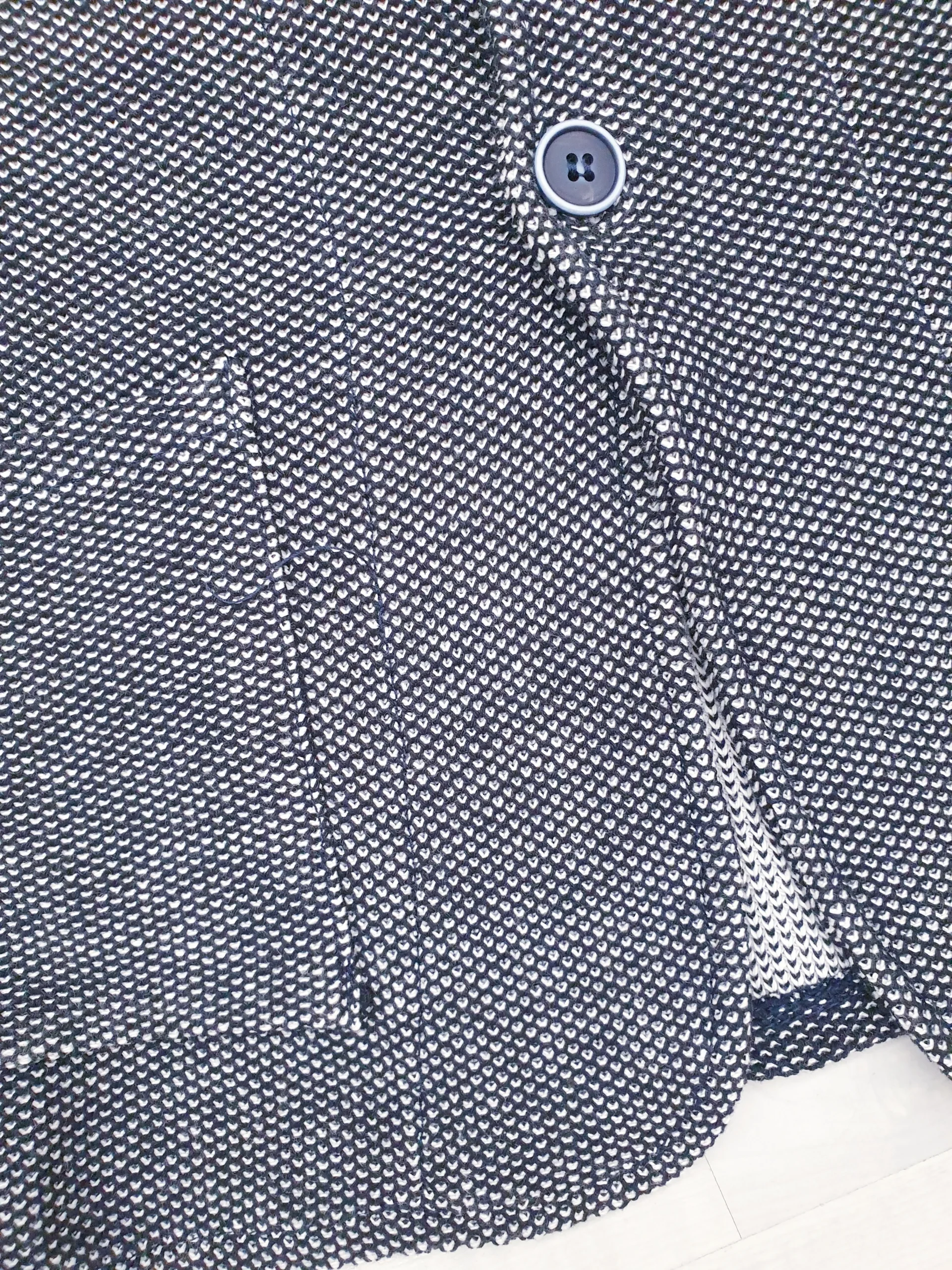 Giacca in maglia tramatura blu/bianco vestibilità sfiancata con bottoni.