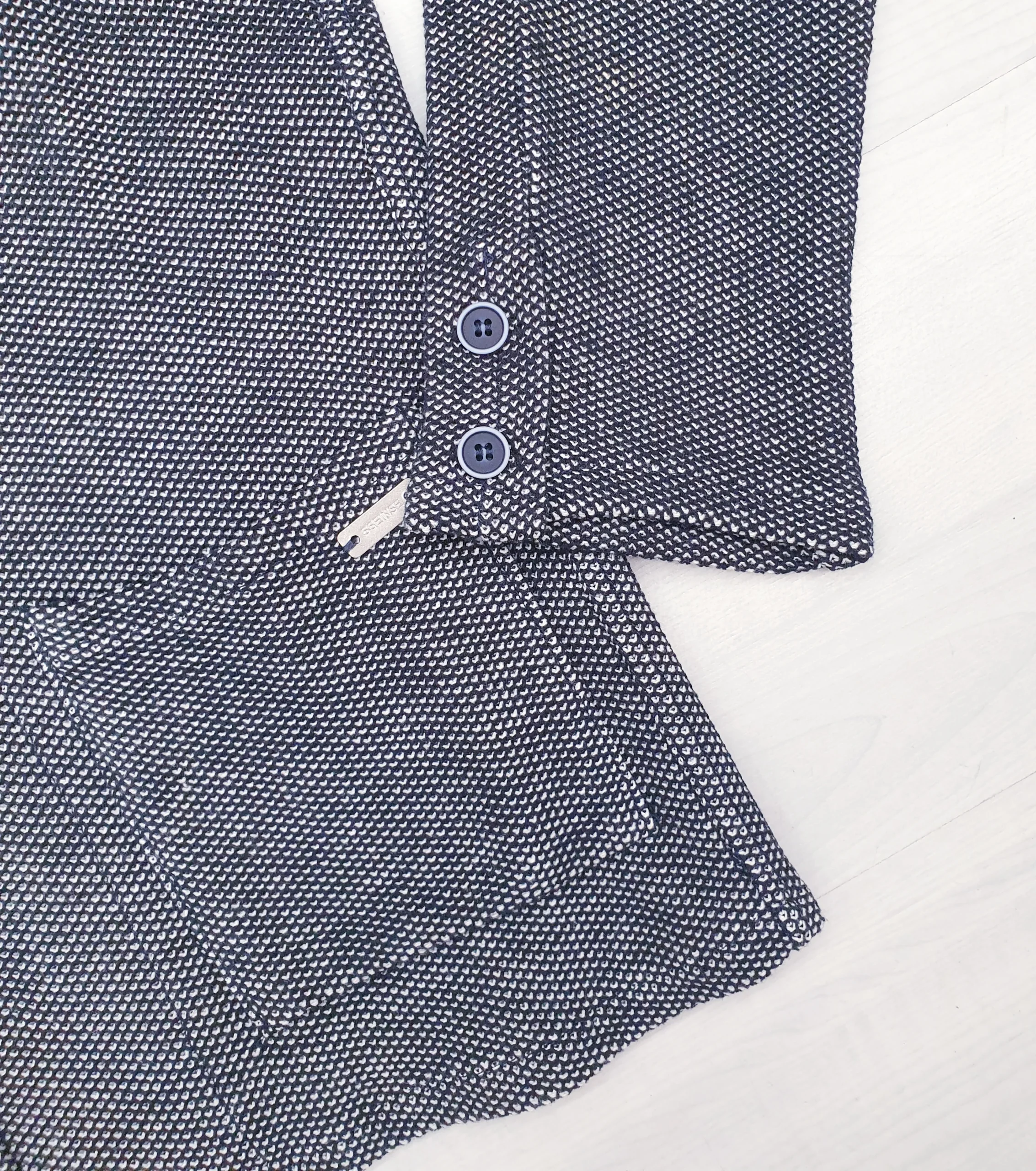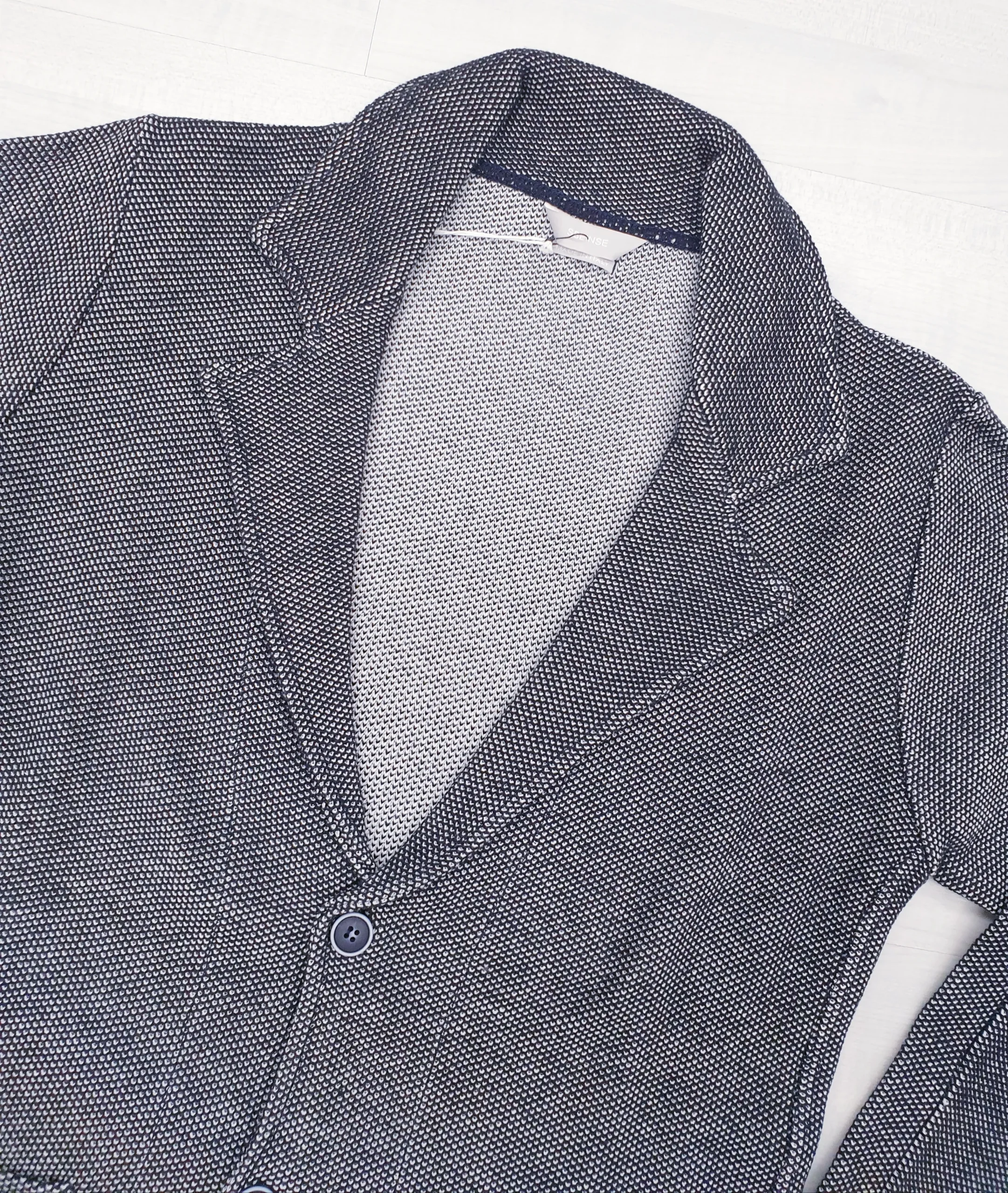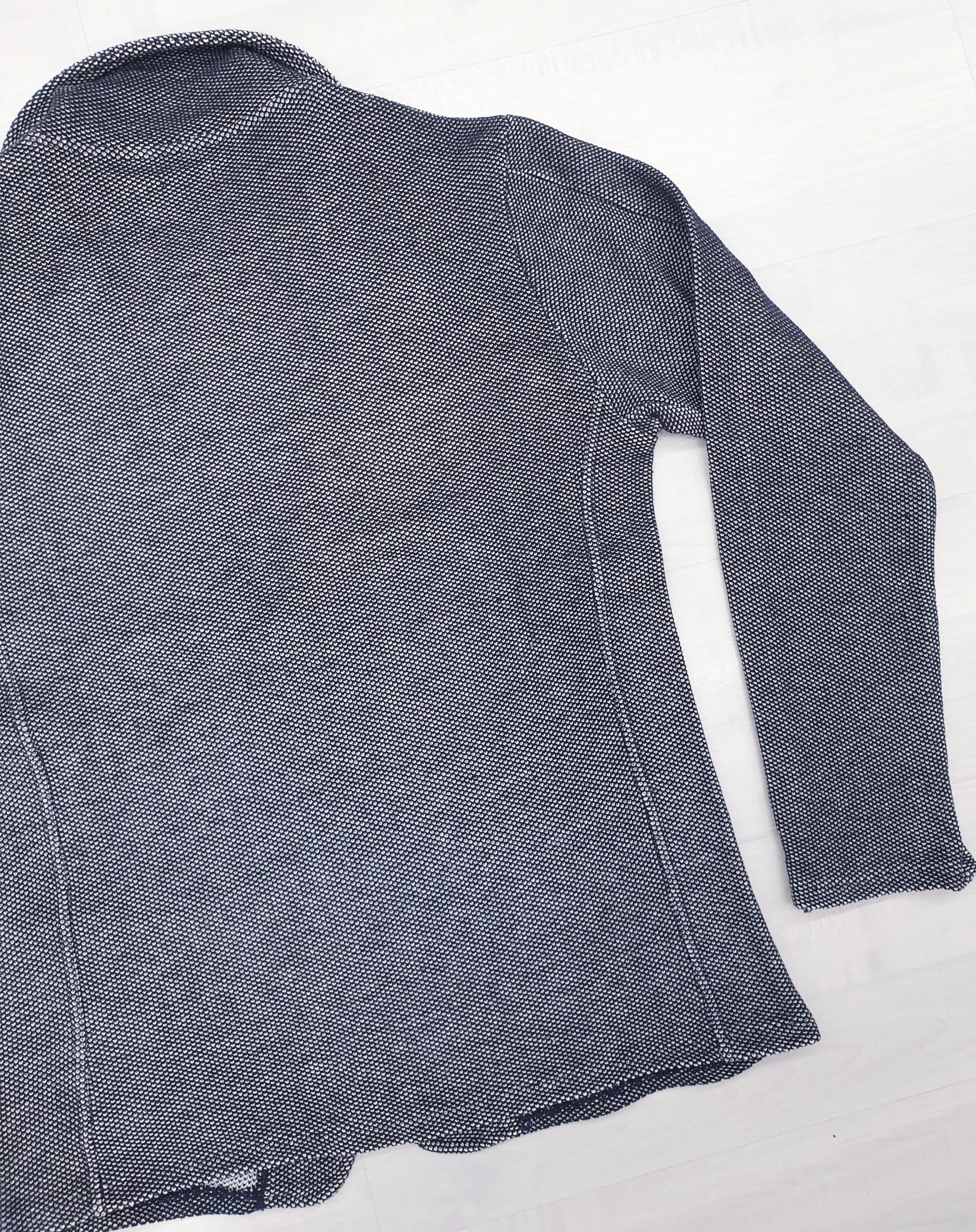 Giacca in maglia tramatura blu/bianco vestibilità sfiancata con bottoni.