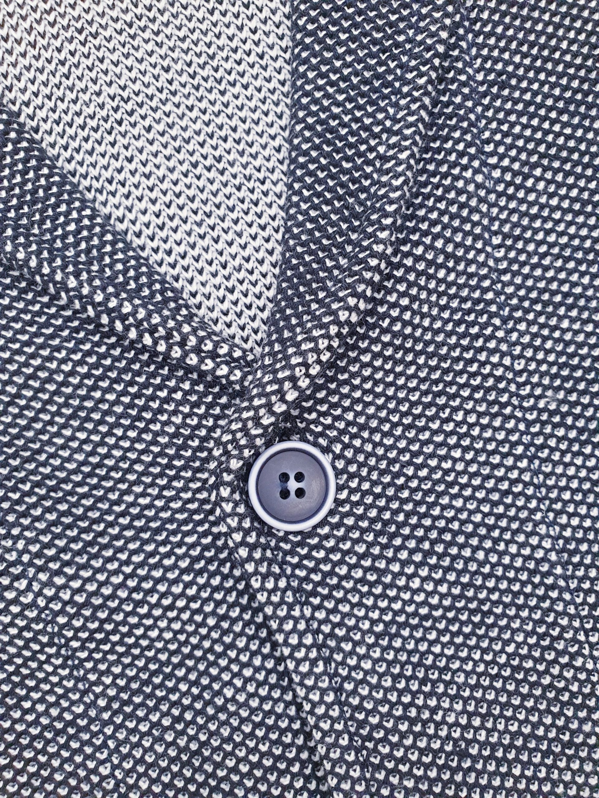 Giacca in maglia tramatura blu/bianco vestibilità sfiancata con bottoni. Composizione: 50% Cotone 50% Acrilica MADE IN ITALY