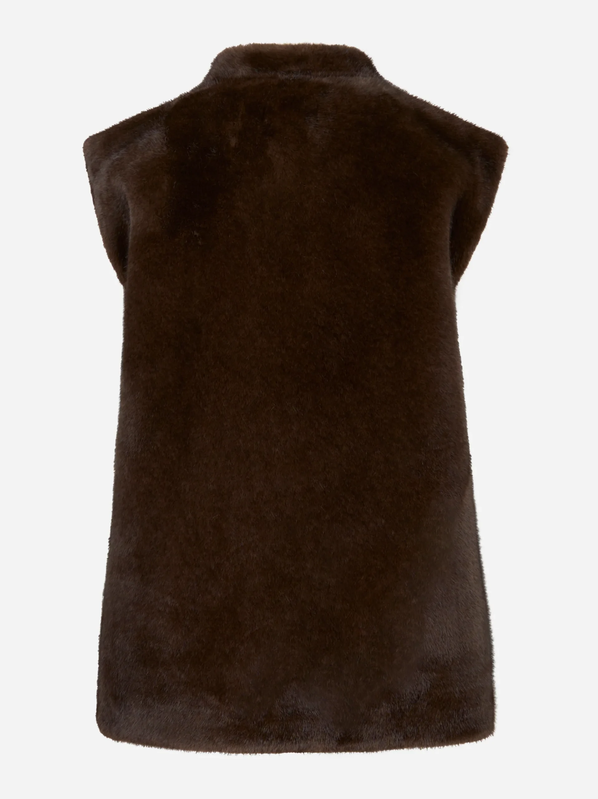 ITEM INFO Giacca marrone smanicata in ecofur Realizzata in eco-pelliccia morbida e liscia Collo alto e chiusura nascosta frontale Linea dritta e moderna Struttura leggera ma calda Ideale per look stratificati Dettagli sartoriali curati Composizione: 100% Poliestere Made in Italy