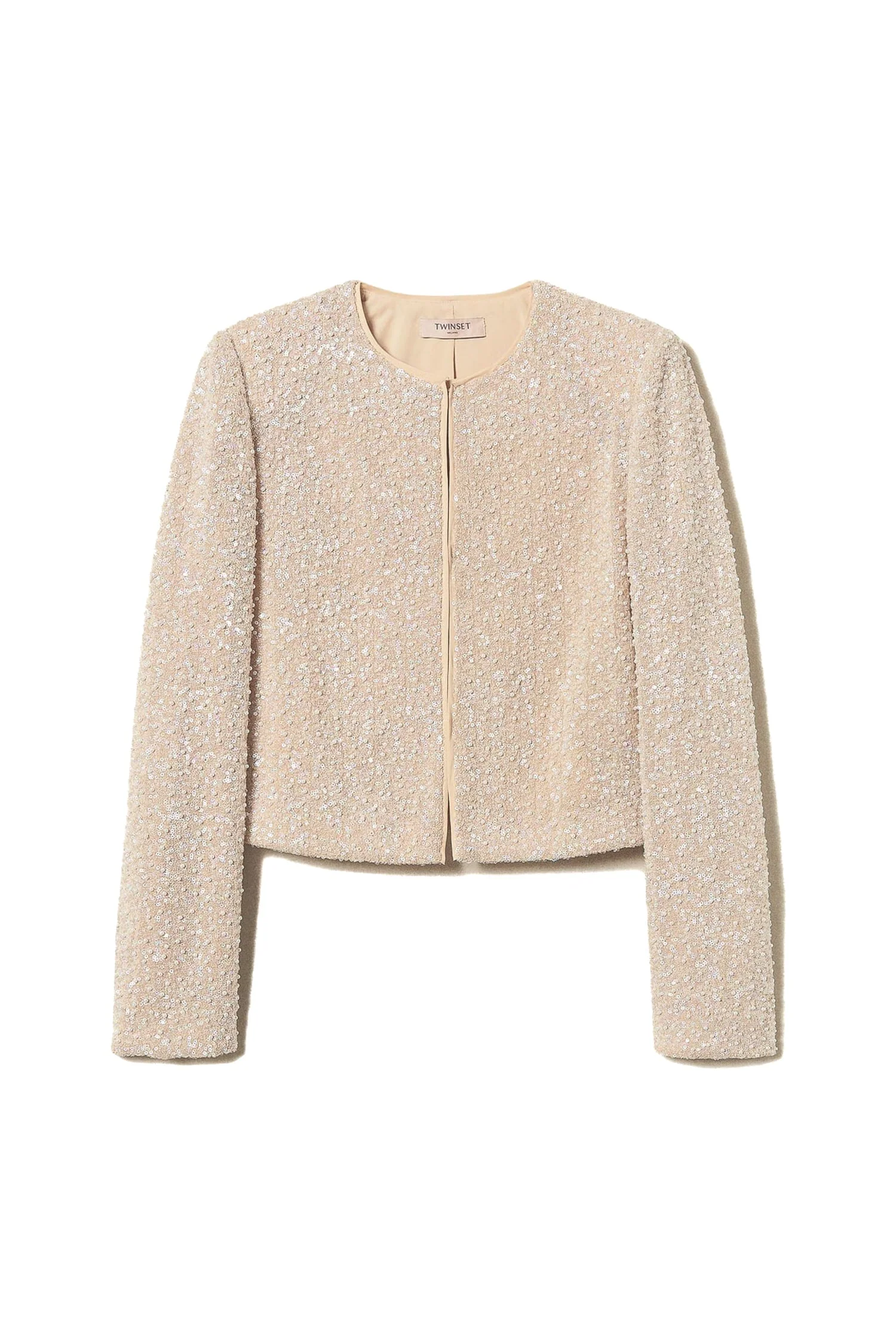 Giacca in georgette con ricamo all over di paillettes e di piccole perle dal colore naturale per un ricercato effetto tridimensionale e cromatico. Ha collo tondo, chiusura con piccoli uncinelli invisibili, profili in piping di georgette in tinta, maniche lunghe e affusolate sostenute da spalline, fodera in georgette, placchetta logo Oval T sul retro.