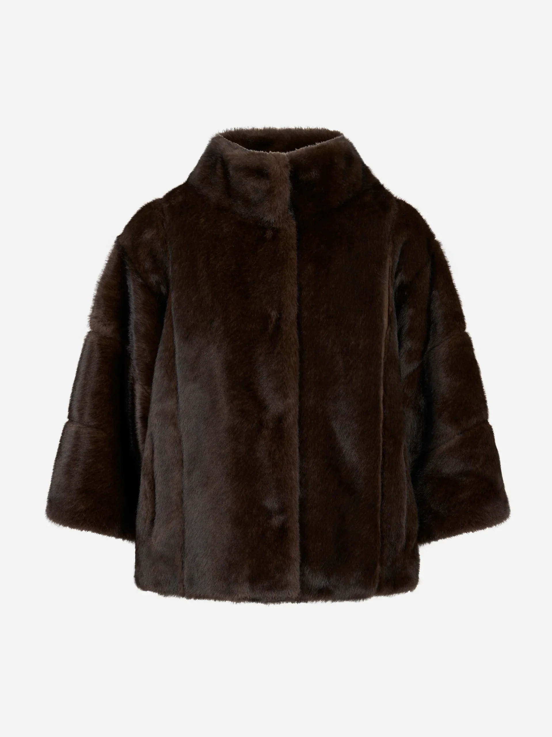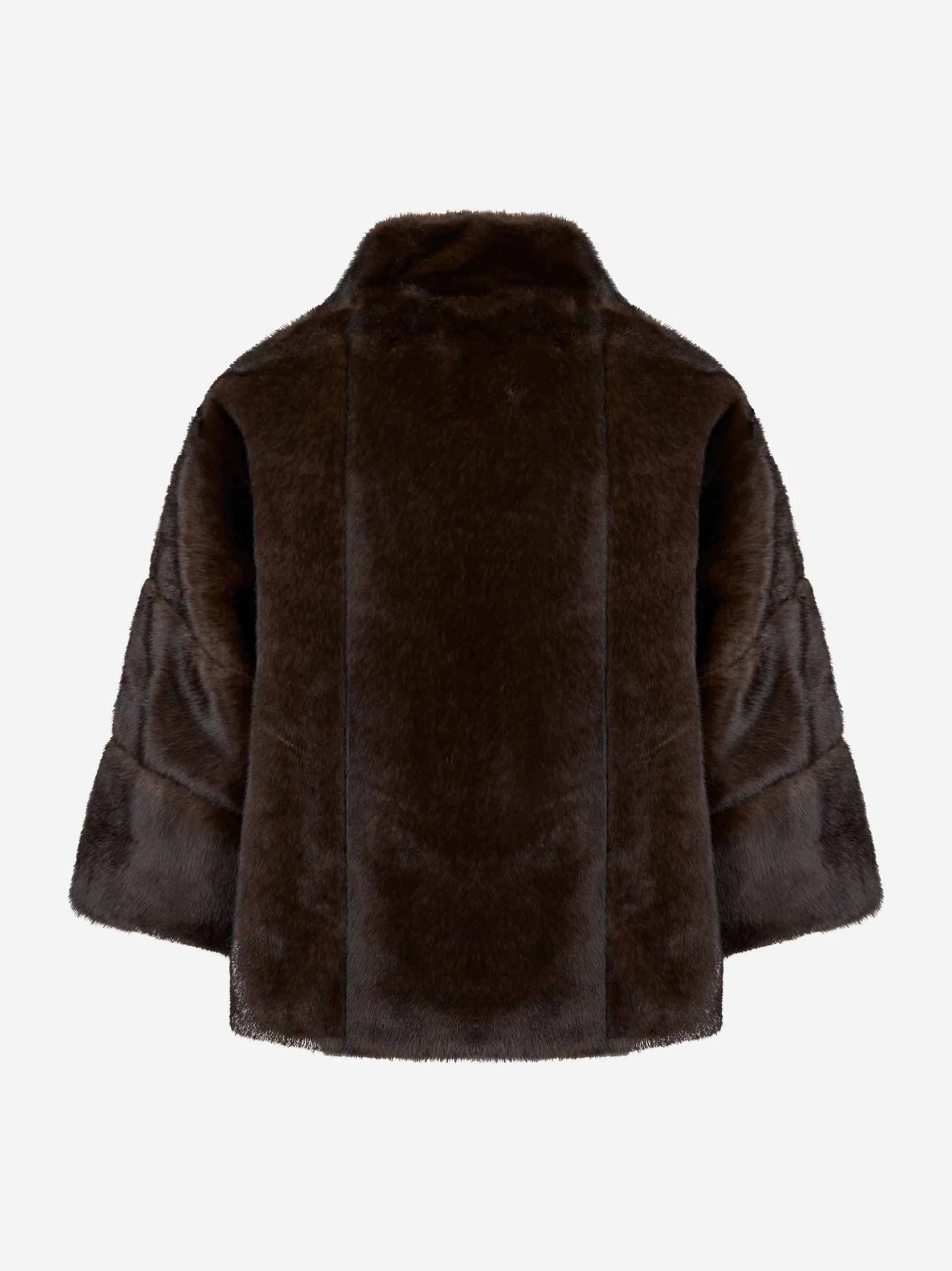 ITEM INFO Giacca tre quarti marrone in ecofur Tessuto effetto pelliccia lucida e soffice Collo alto strutturato Chiusura frontale nascosta Maniche tre quarti dal taglio elegante Vestibilità morbida e femminile Perfetta per look sofisticati da giorno Composizione: 100% Poliestere Made in Italy