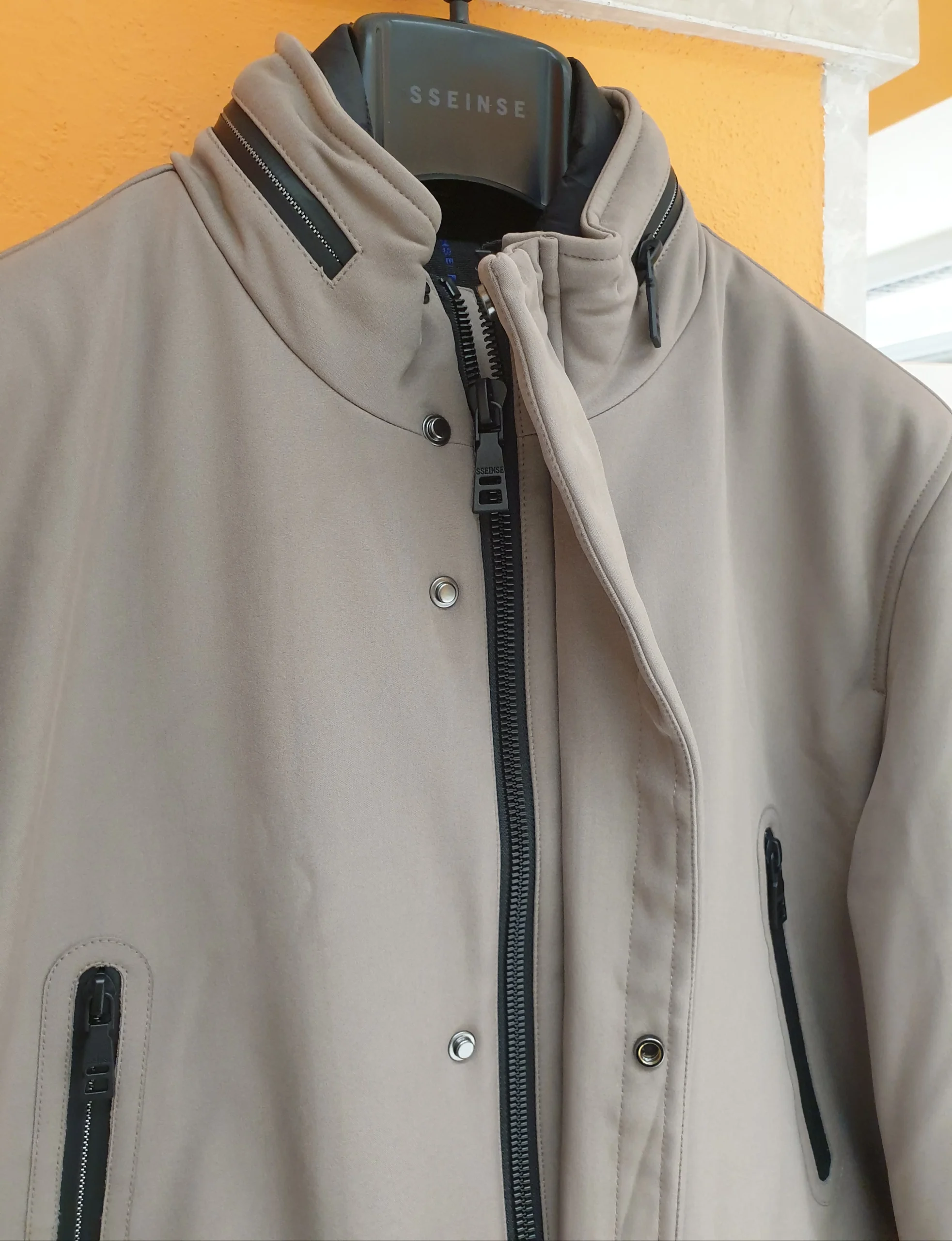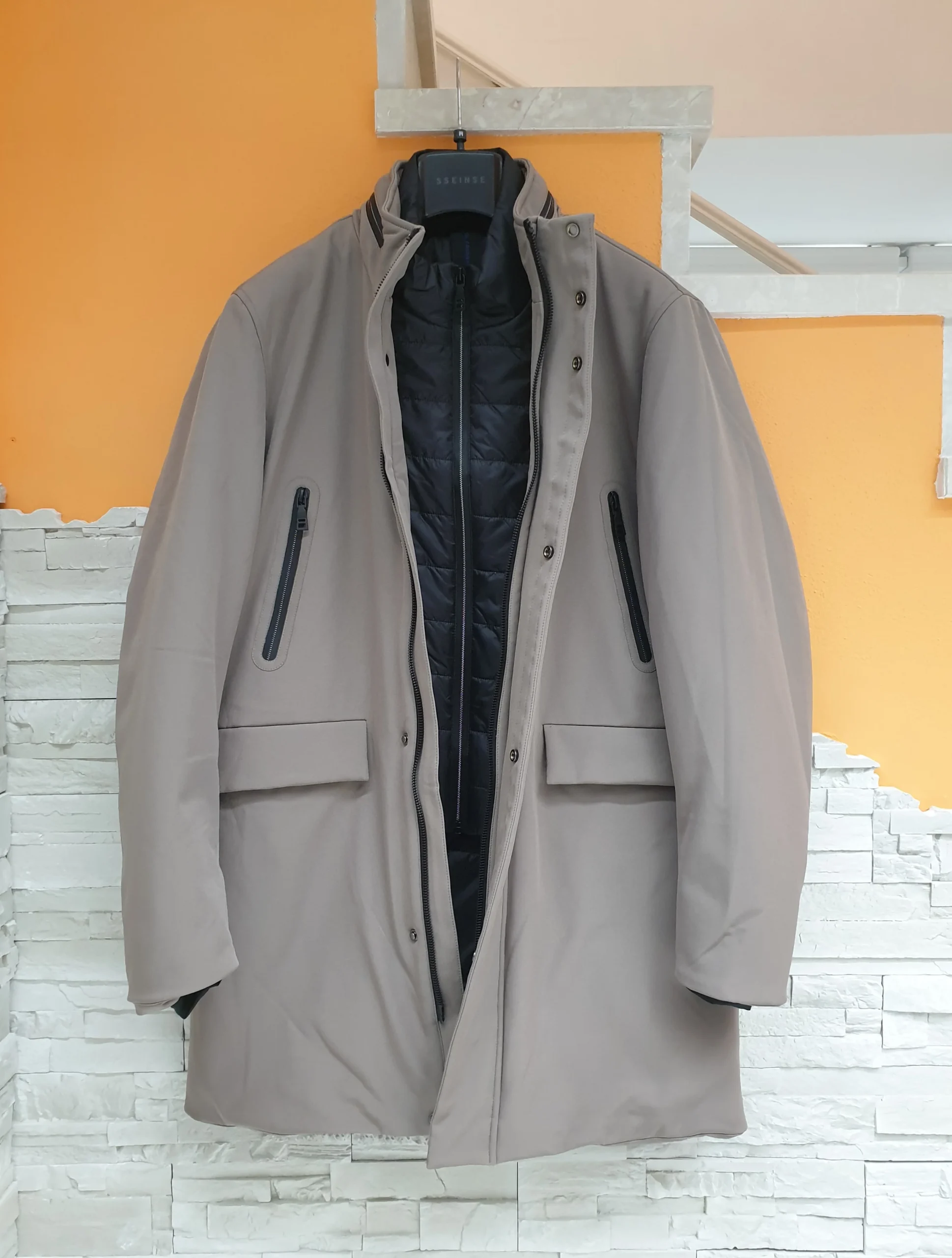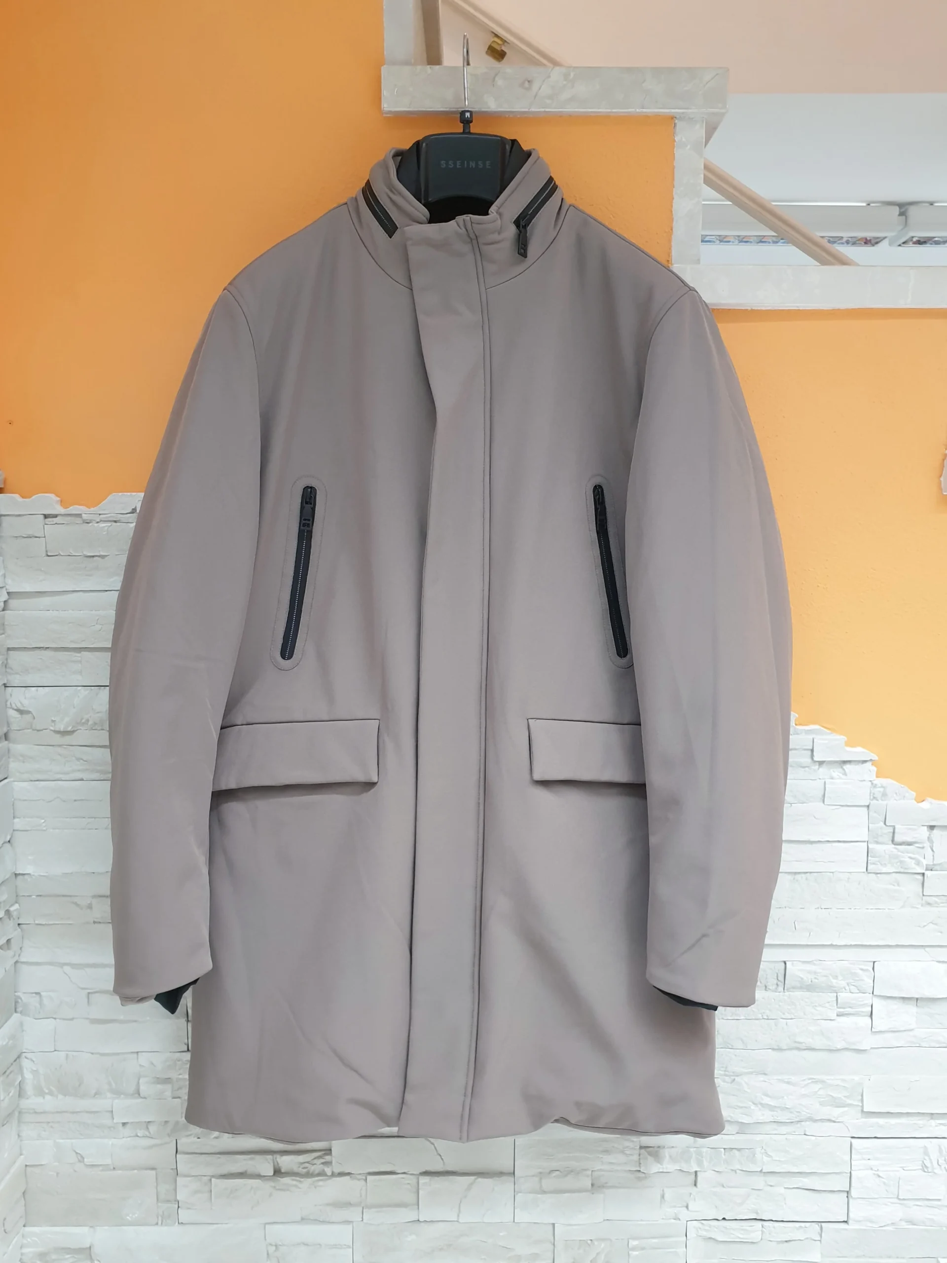 Giaccone liscio tortora con pettorina nera removibile. Giaccone con zip e bottoni automatici, tasche profilate verticali e tasche grandi con patella. Interno trapuntato con tasche zip, spacco retro con bottone automatico. Composizione: 100% Poliestere
