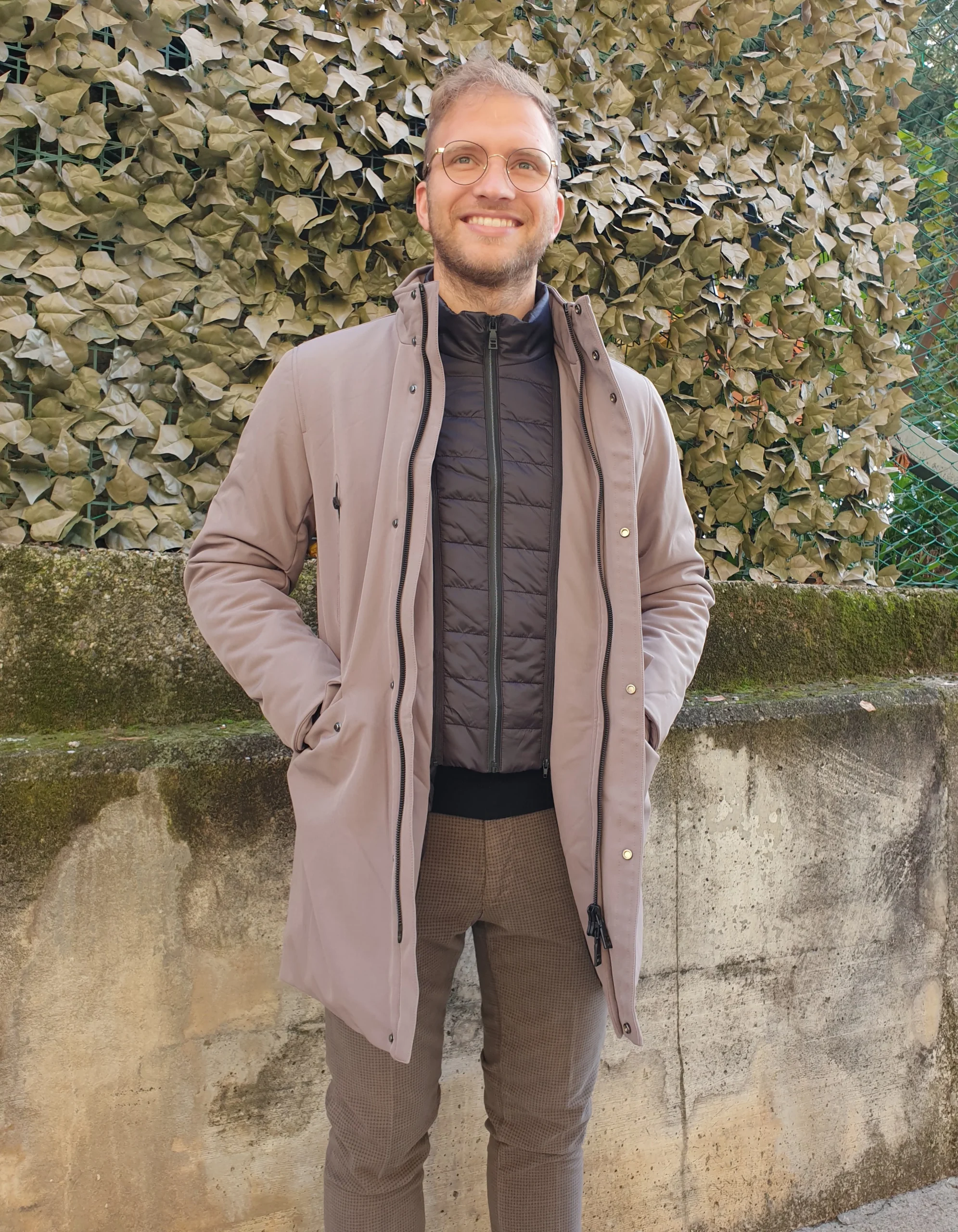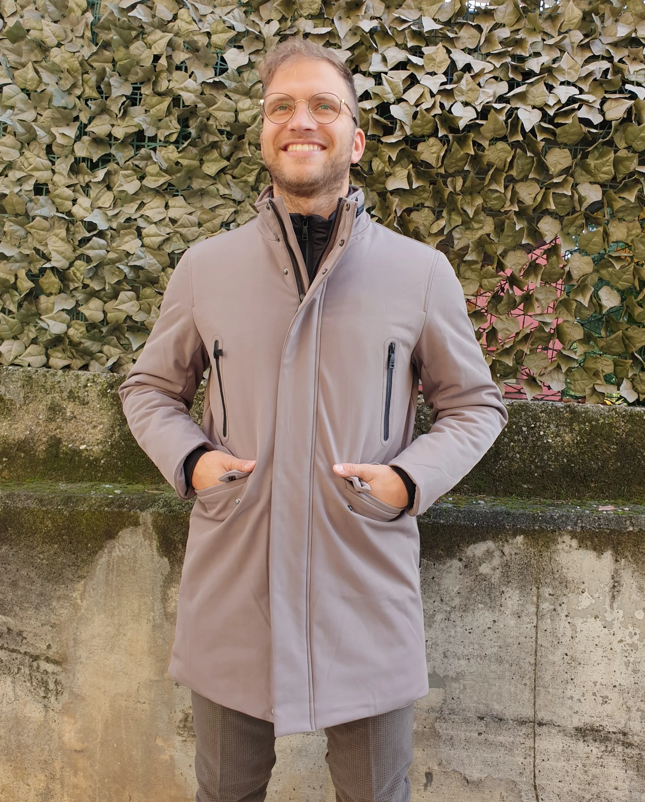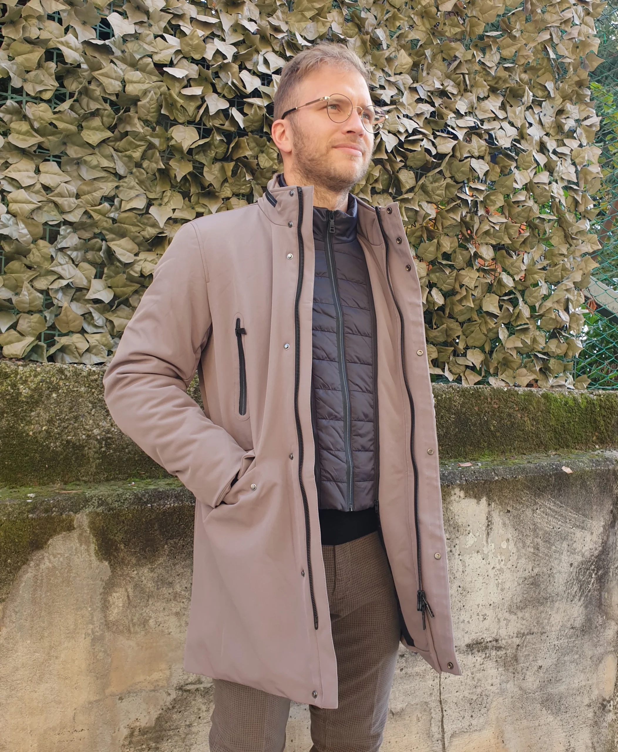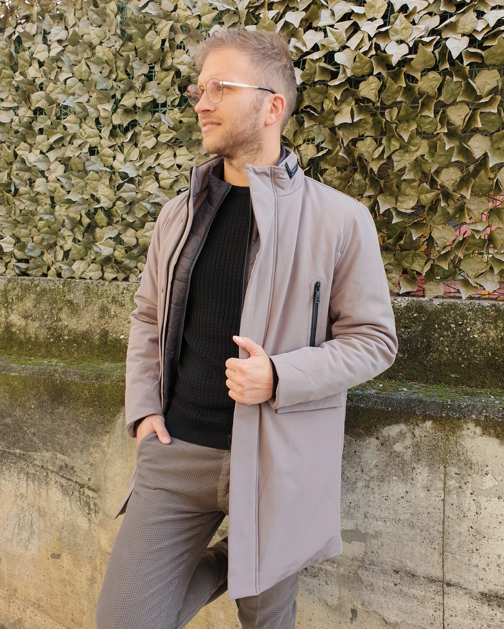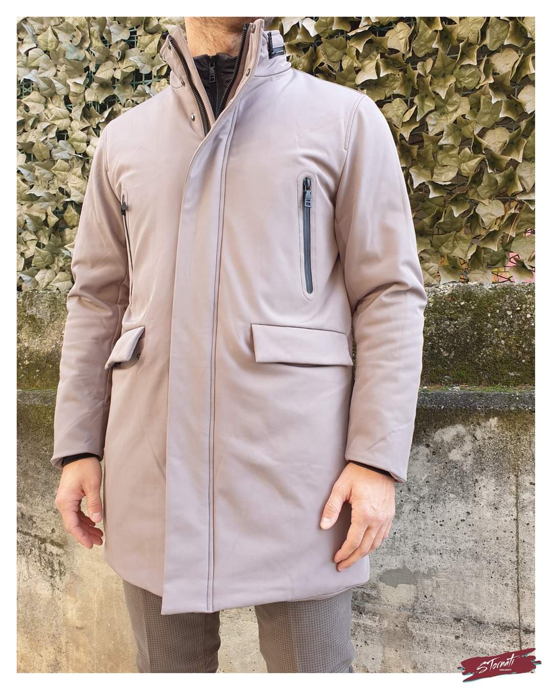 Giaccone liscio tortora con pettorina nera removibile. Giaccone con zip e bottoni automatici, tasche profilate verticali e tasche grandi con patella. Interno trapuntato con tasche zip, spacco retro con bottone automatico.