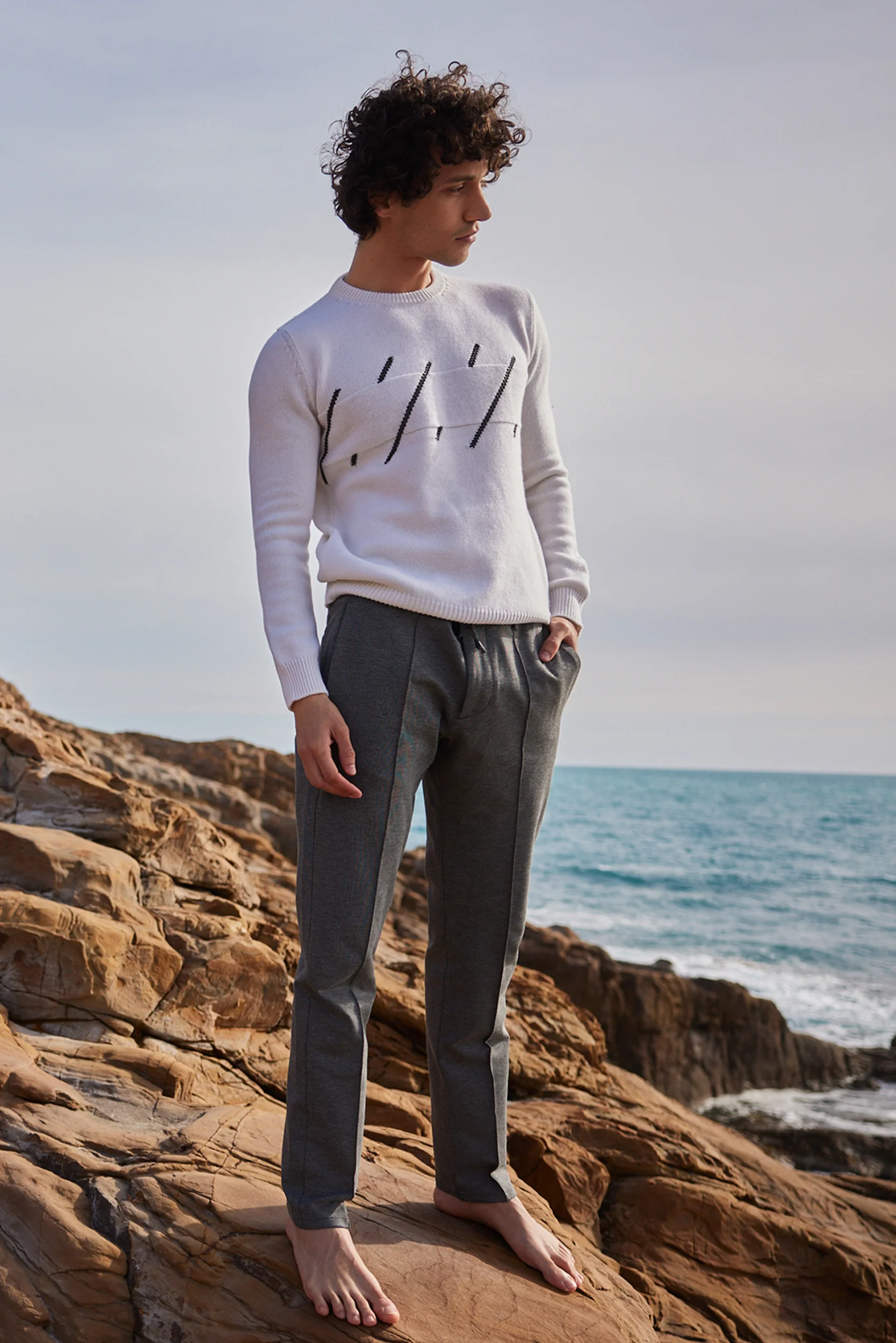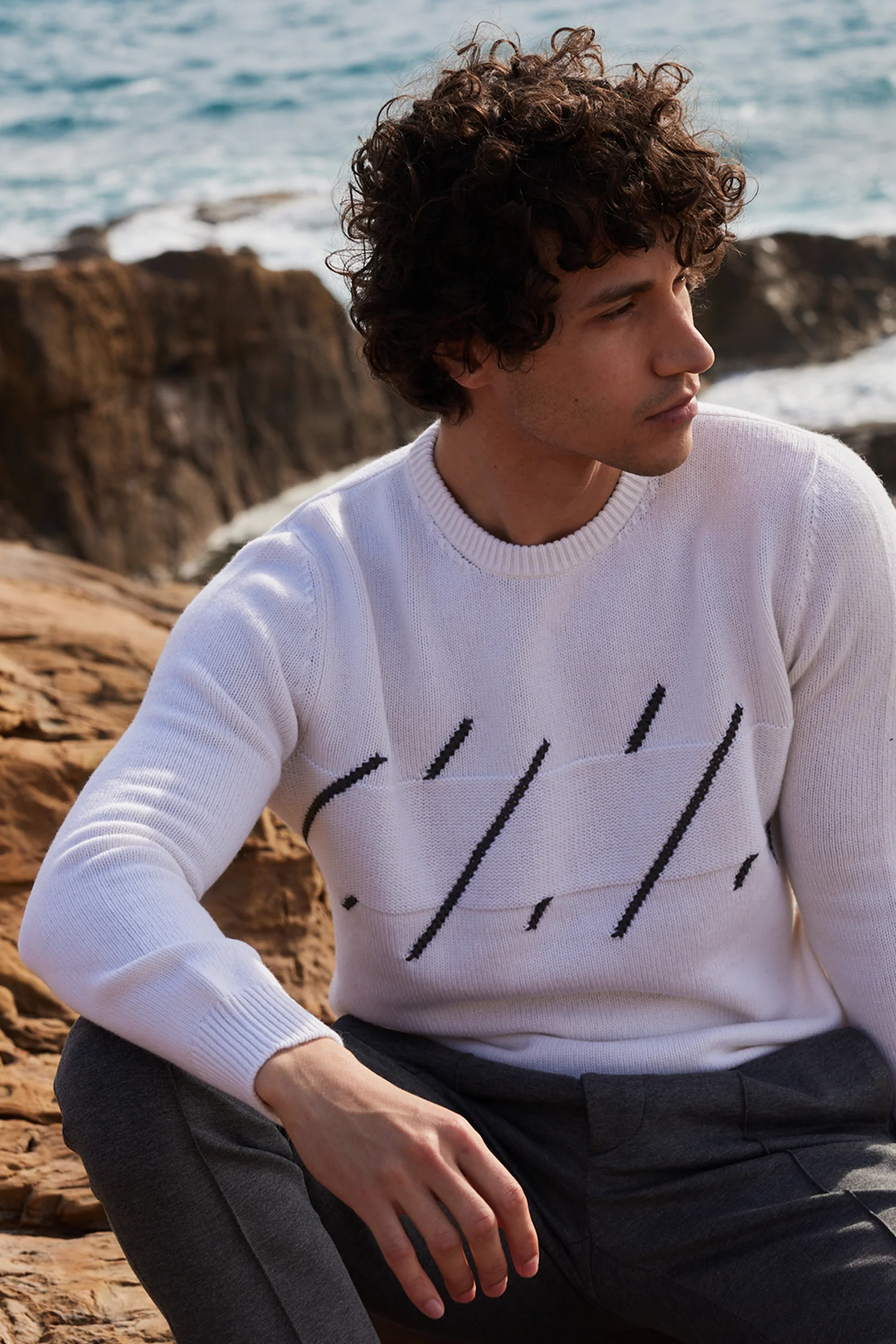 Girocollo in cashmere con stampa moderna, realizzata mediante un ricamo in pelle. Variante in colore bianco con dettagli in nero.