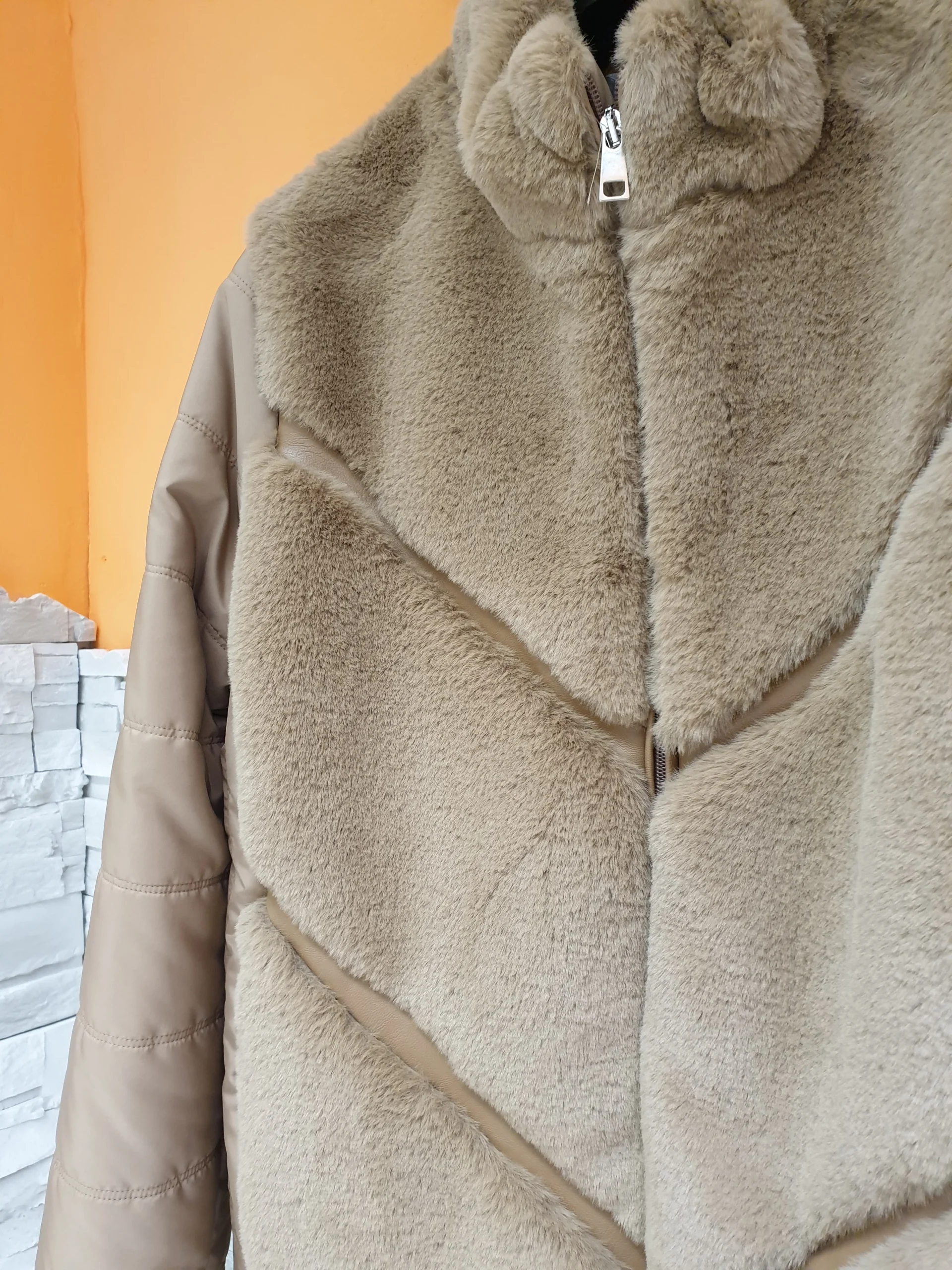 Giubbino cammello con inserto ecopelo frontale effetto gilet. Fronte in ecopelo con lavorazione a V profili ecopelle, retro e maniche in nylon.