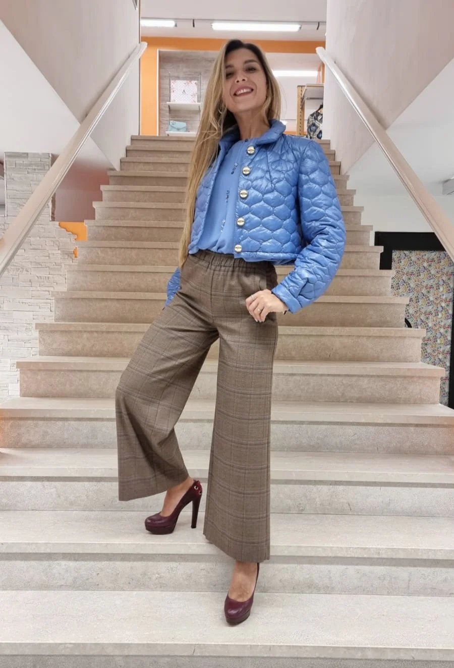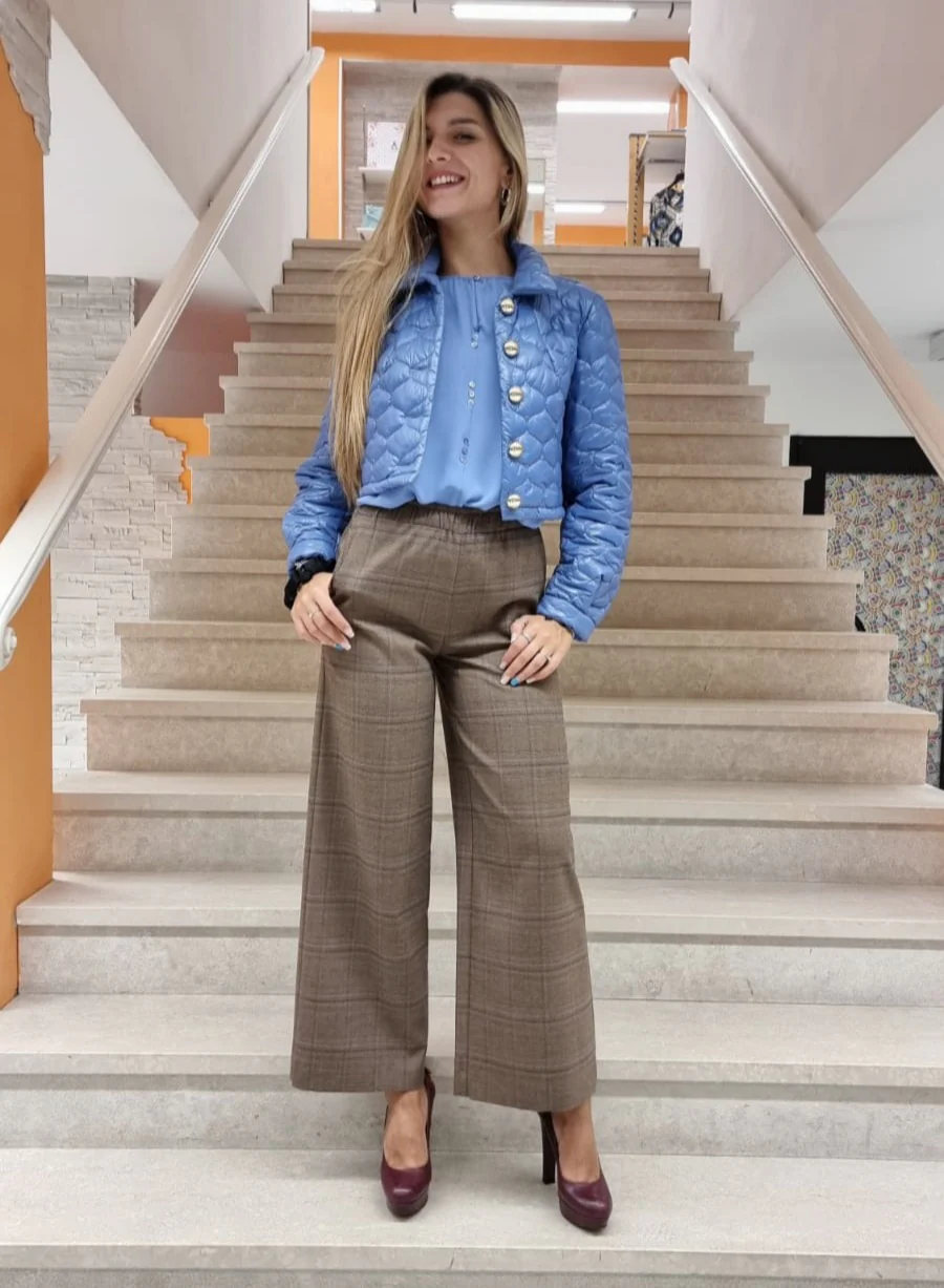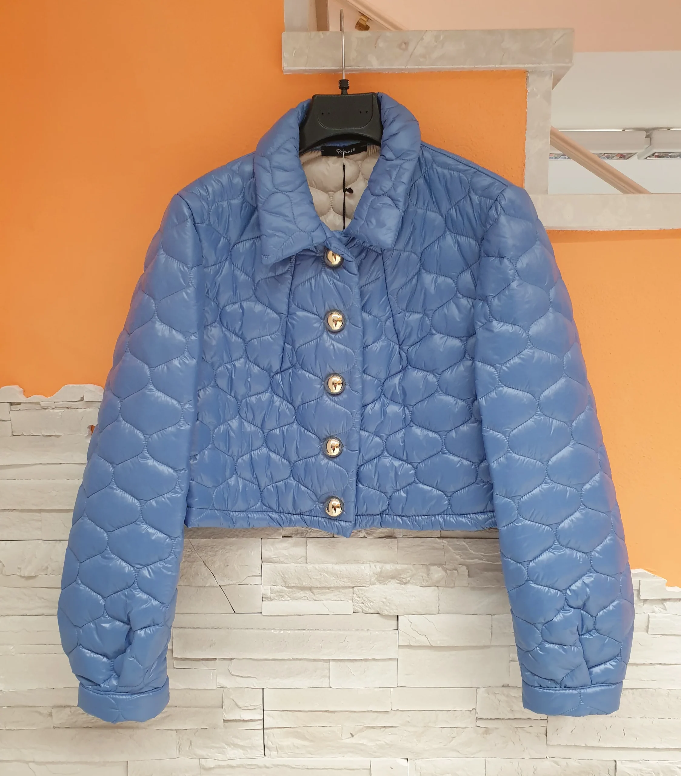 Giubbino corto trapuntato celeste con colletto e bottoni metallo tondi. Maniche con soffietto finale. >> La modella in foto indossa la tg.S Composizione: 100% Poliestere MADE IN ITALY