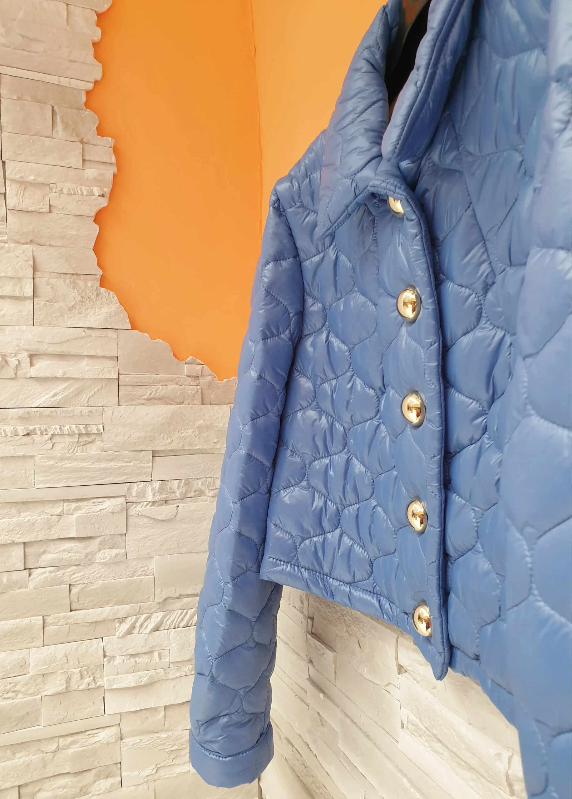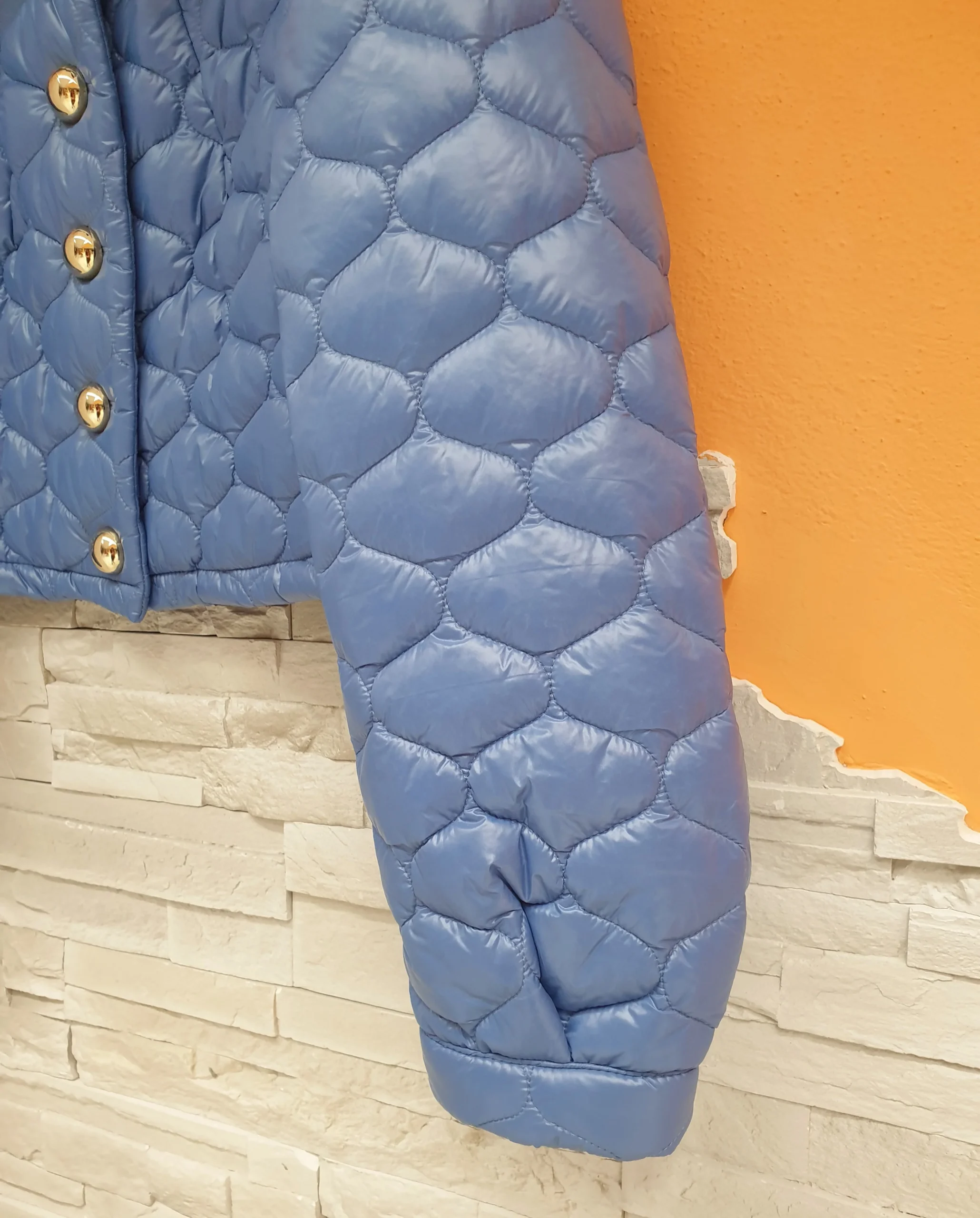 Giubbino corto trapuntato celeste con colletto e bottoni metallo tondi. Maniche con soffietto finale.