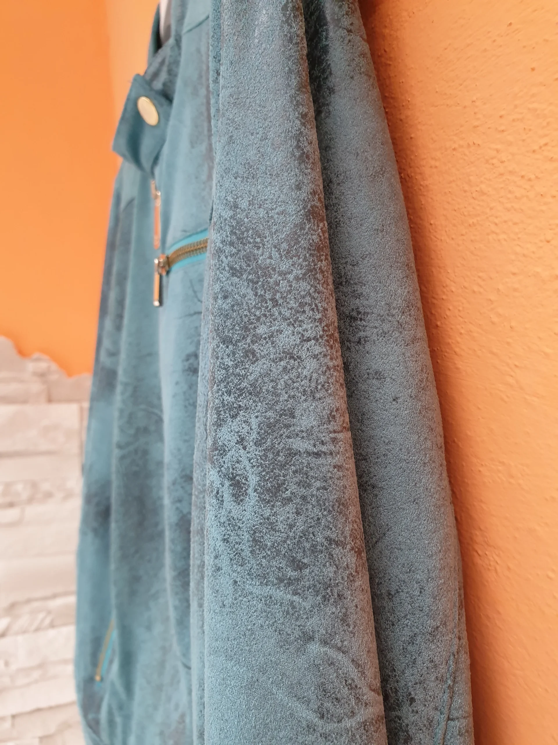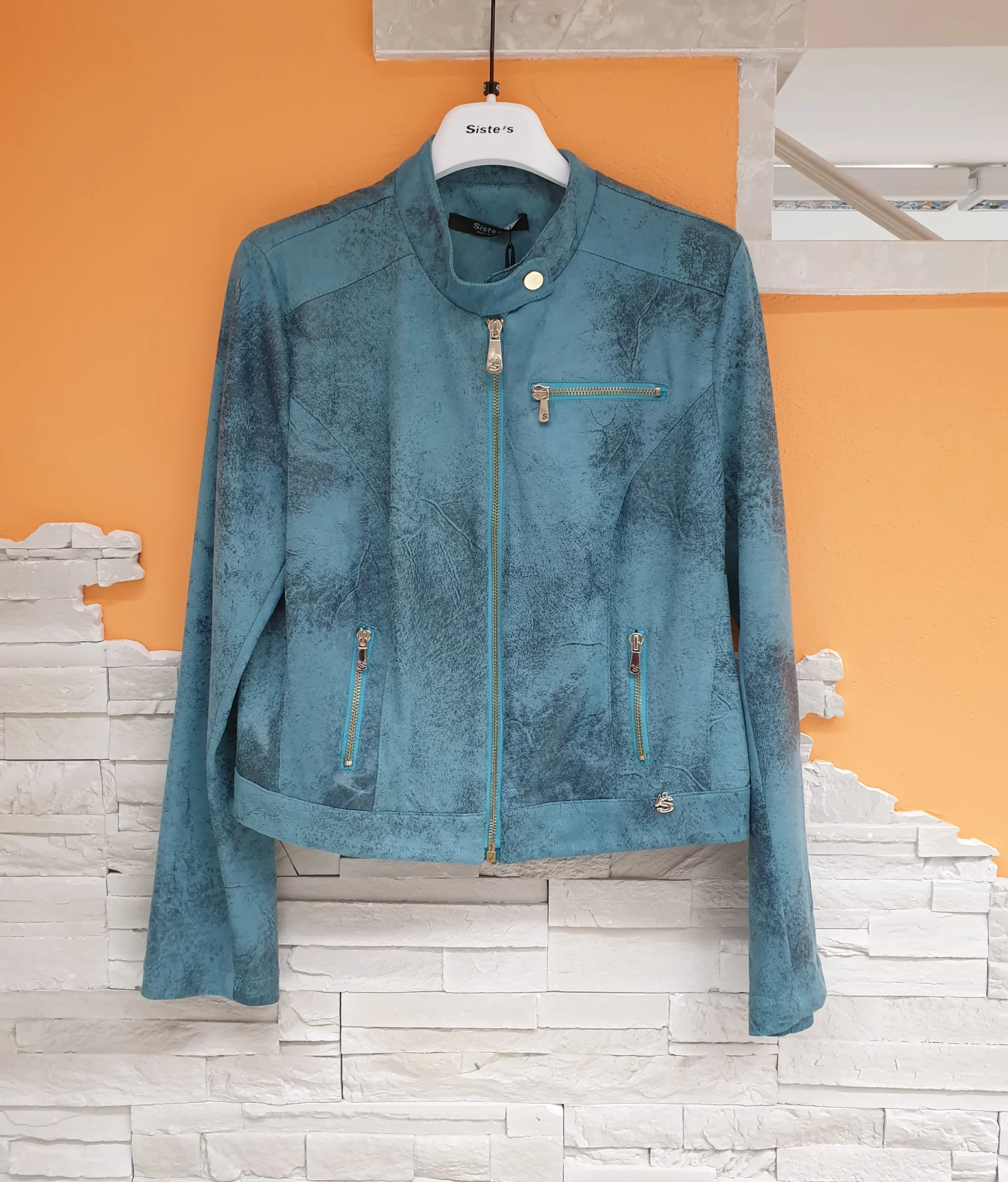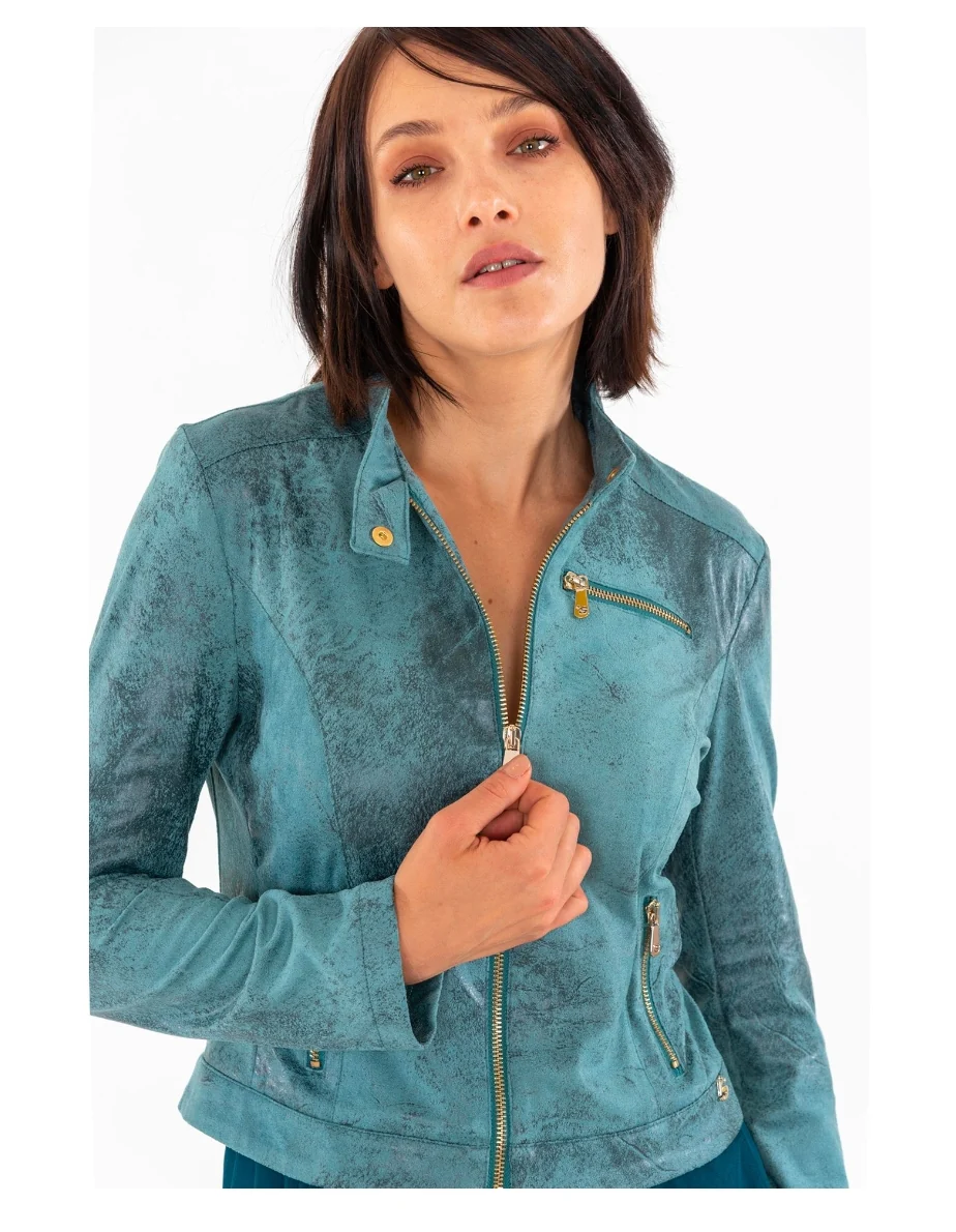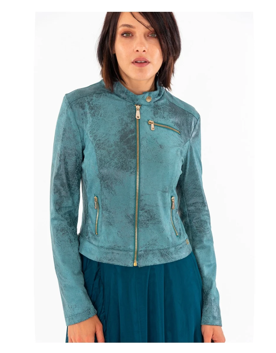 Giubbino ecodaino elasticizzato con zip colore gold e colletto coreana con bottone automatico. Modello con tasche zip, tessuto effetto used in manopesca. Composizione: 88% Poliestere 12% Elastan MADE IN ITALY