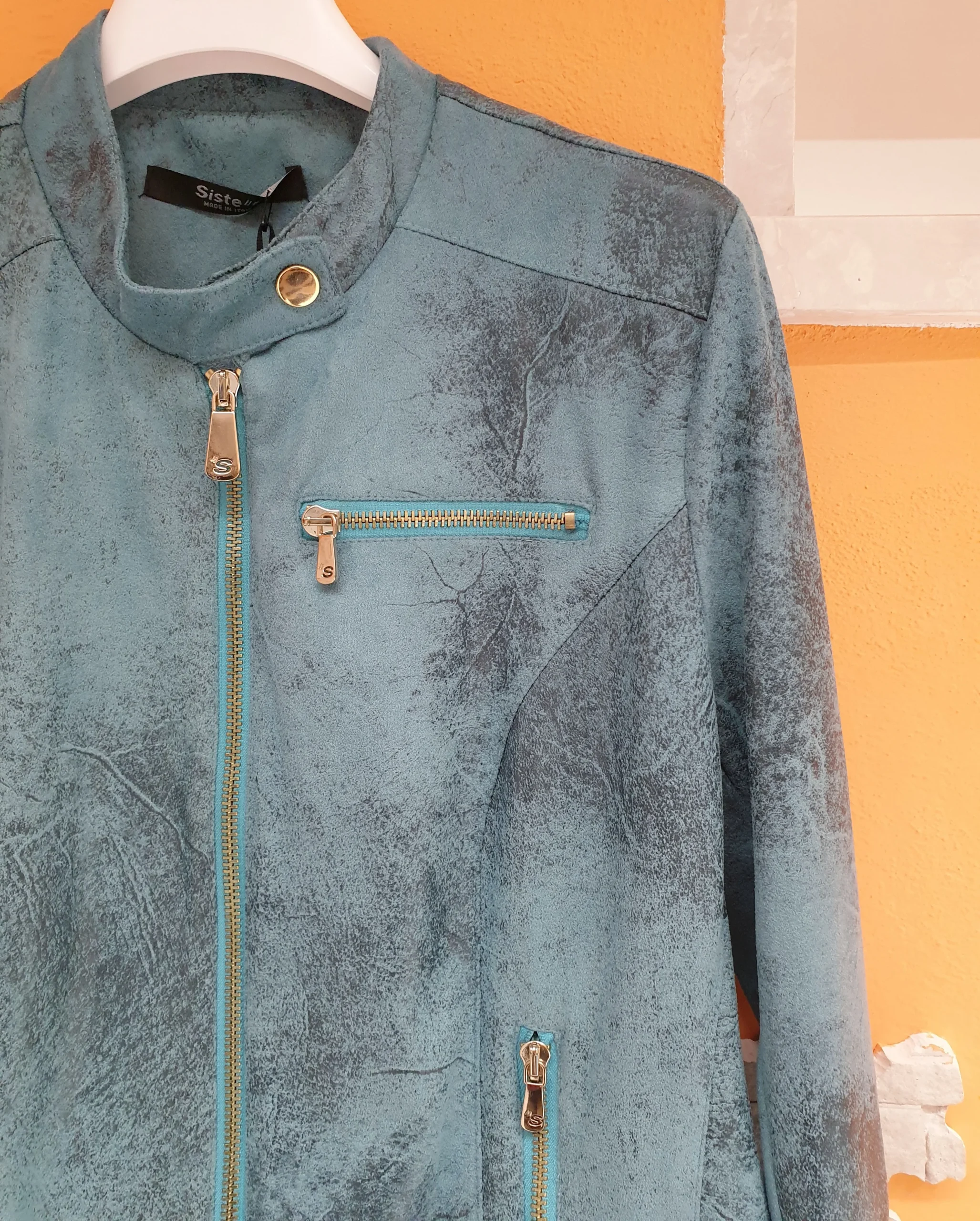 Giubbino ecodaino elasticizzato con zip colore gold e colletto coreana con bottone automatico. Modello con tasche zip, tessuto effetto used in manopesca.
