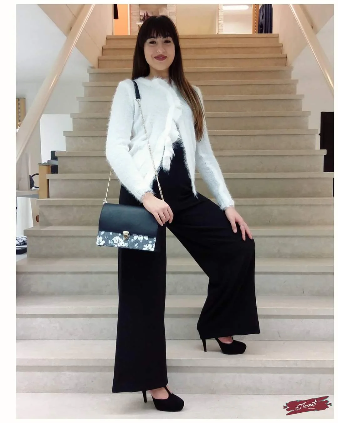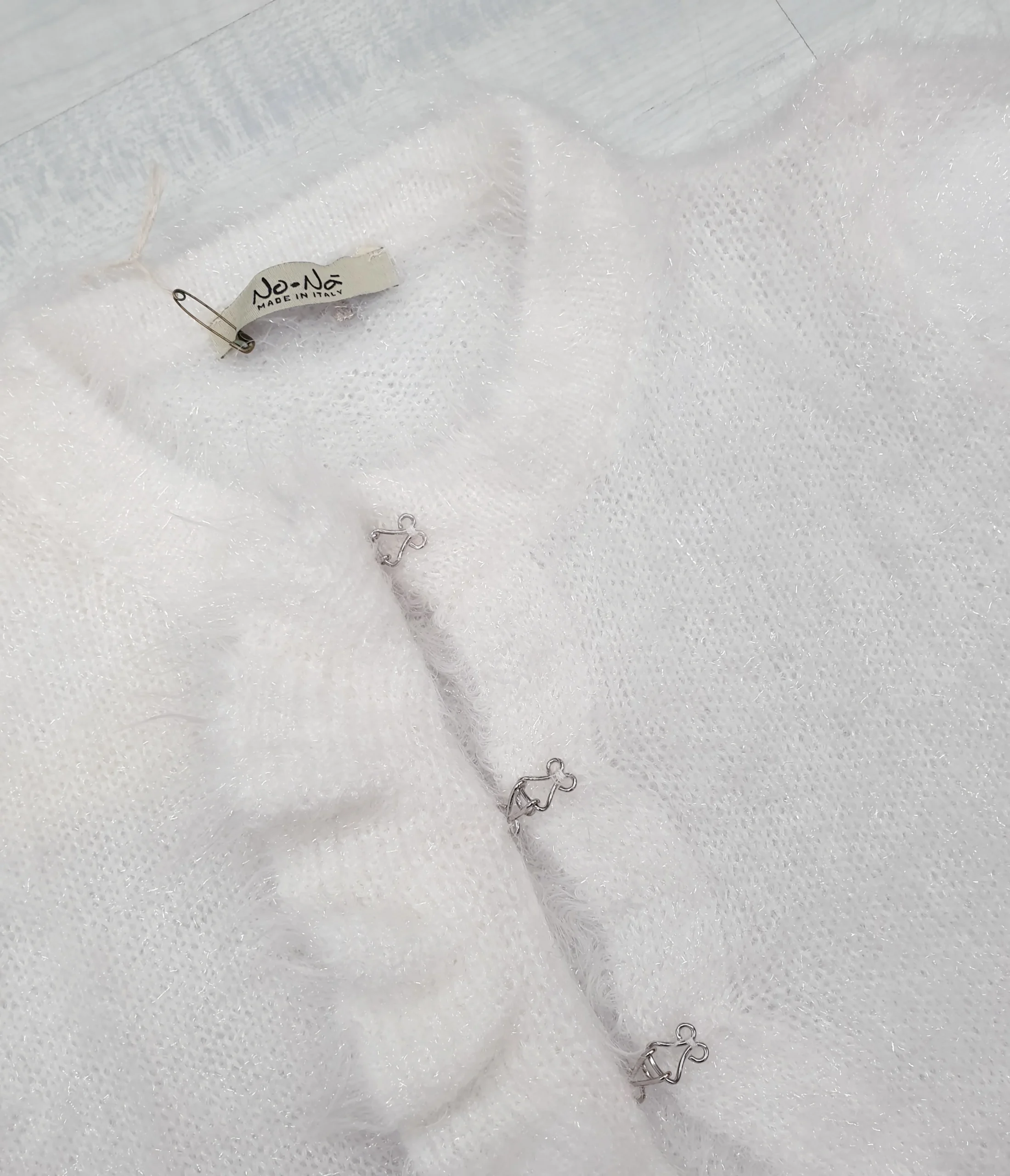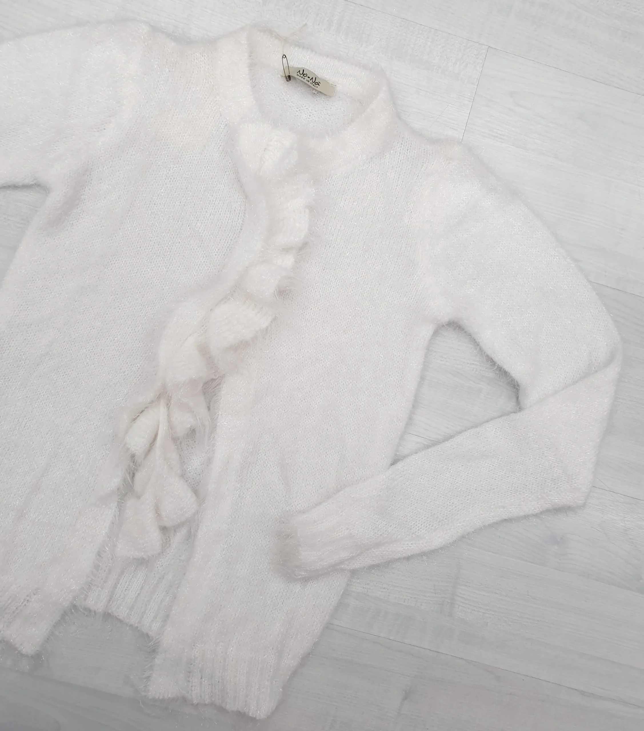 Golfino latte effetto lurex con tre gancetti nascosti da striscia rouge.