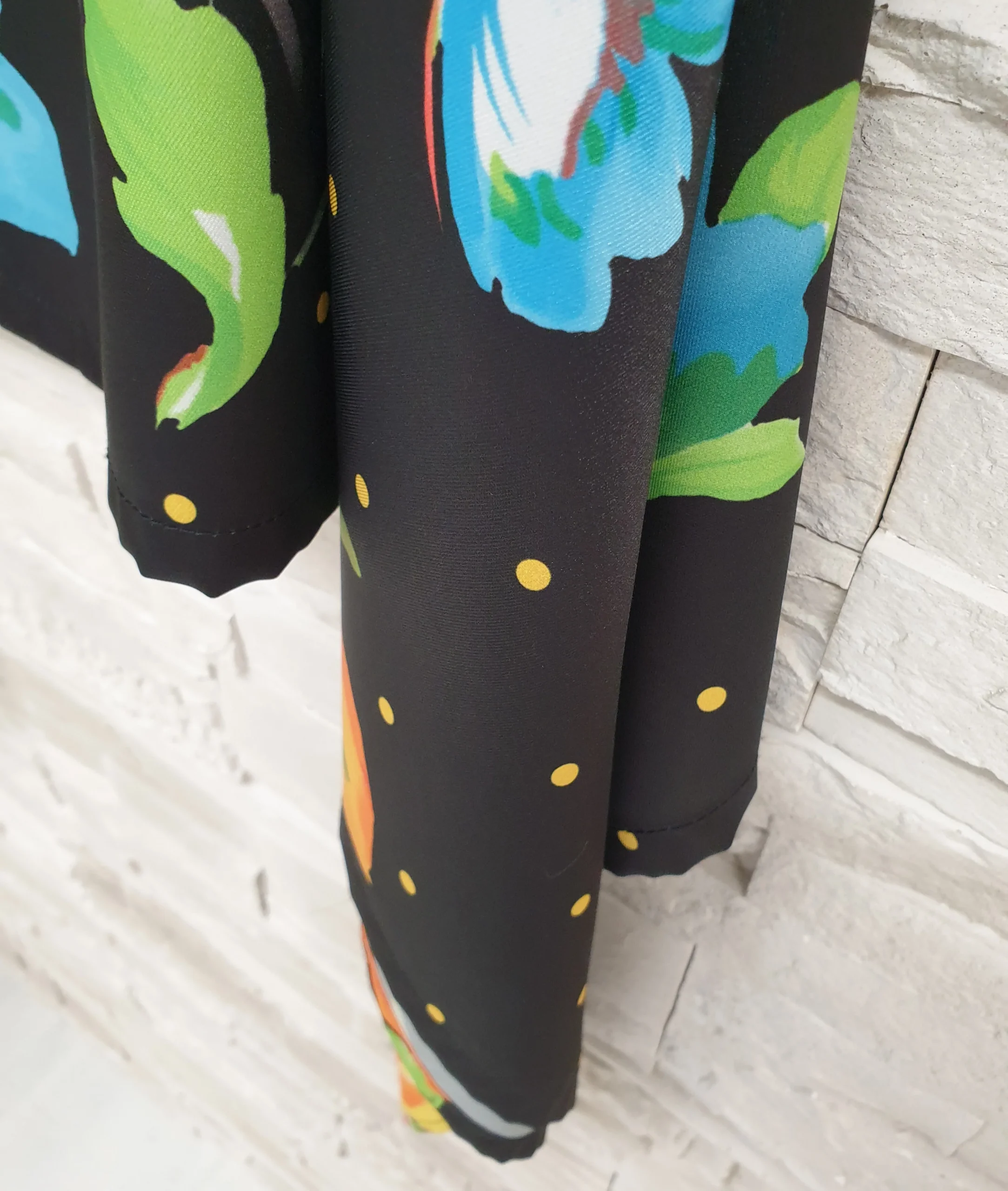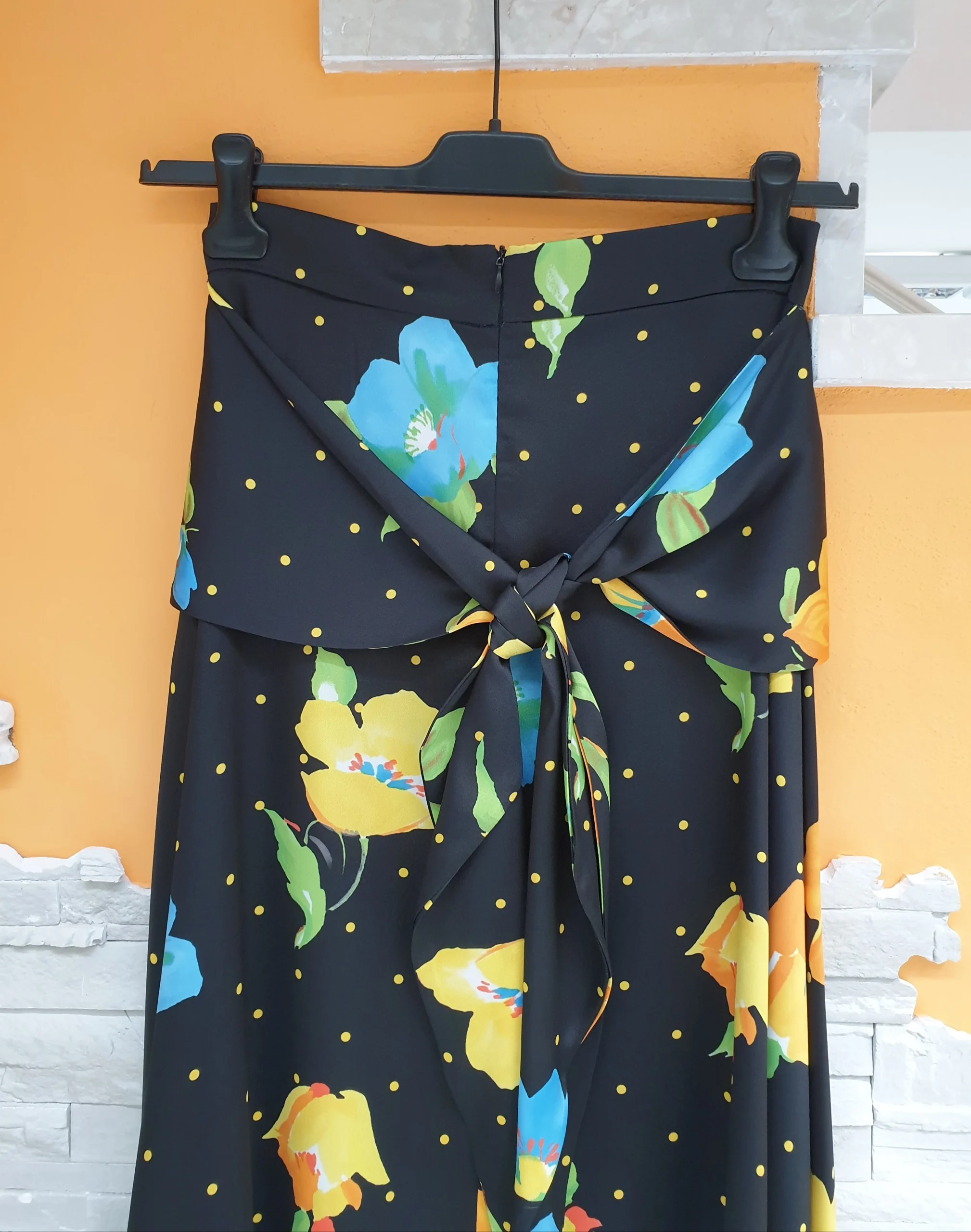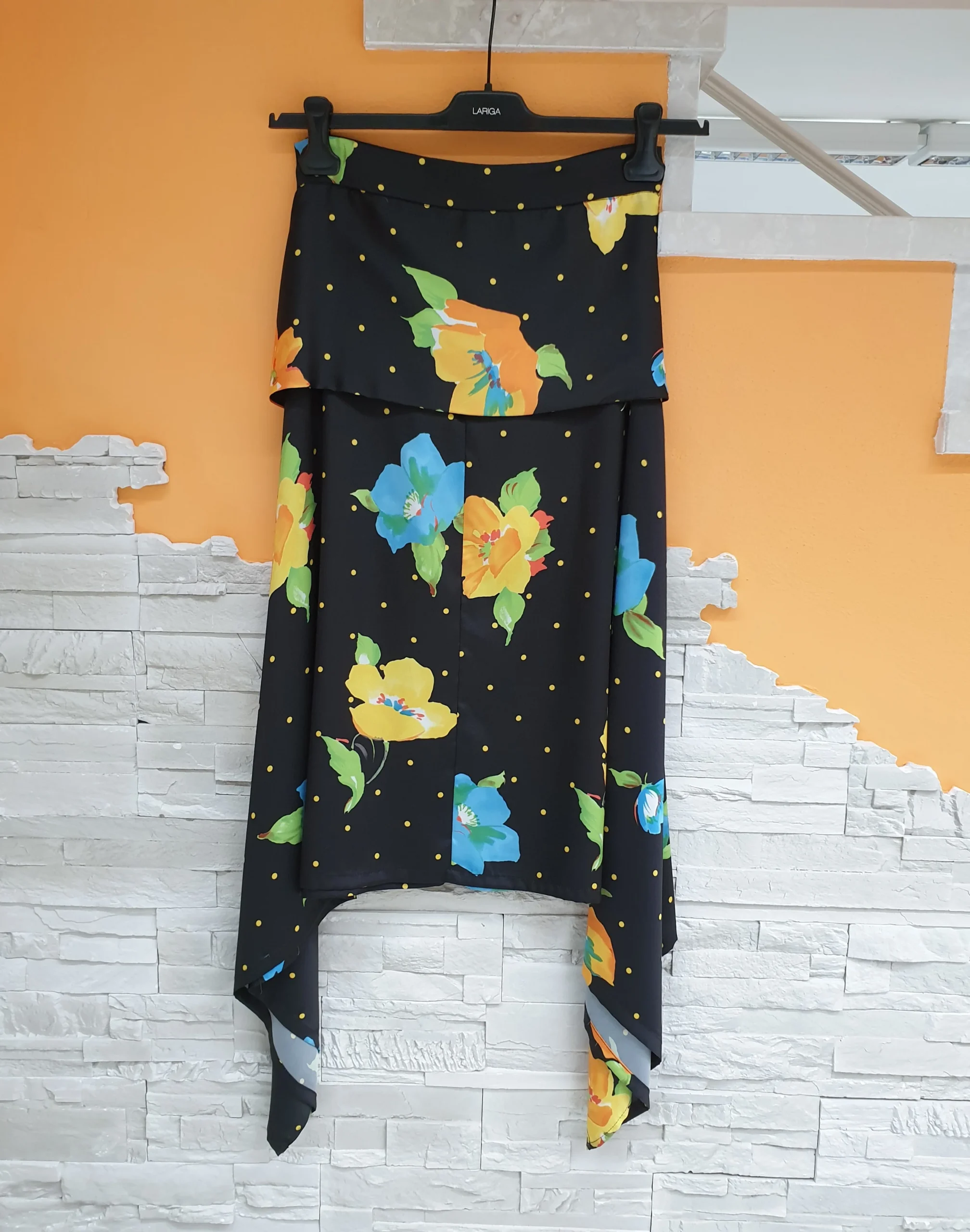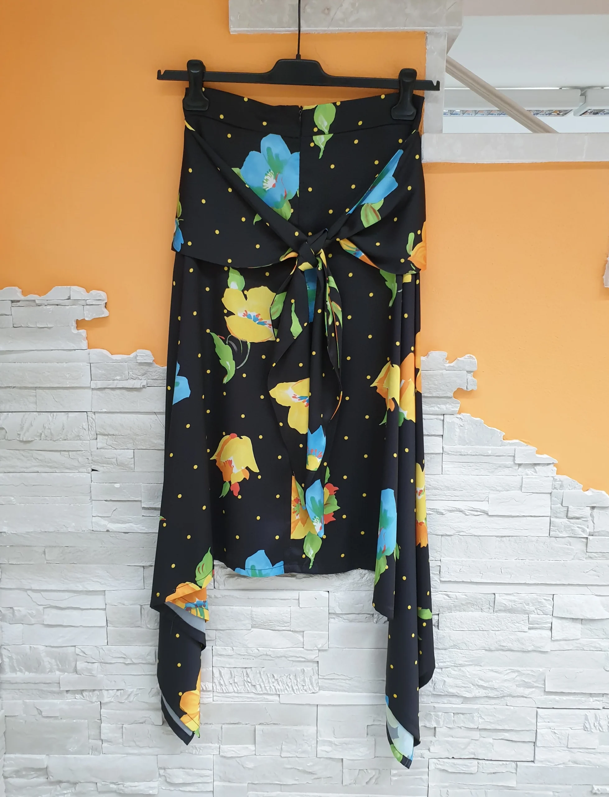 Gonna lunghezza sotto ginocchio asimmetrica con punte con spacchi laterali, fondo nero fant pois e fiori color. Pannello sovrapposto attaccato alla cintura con nodo/fiocco retro; chiusura con zip retro.
