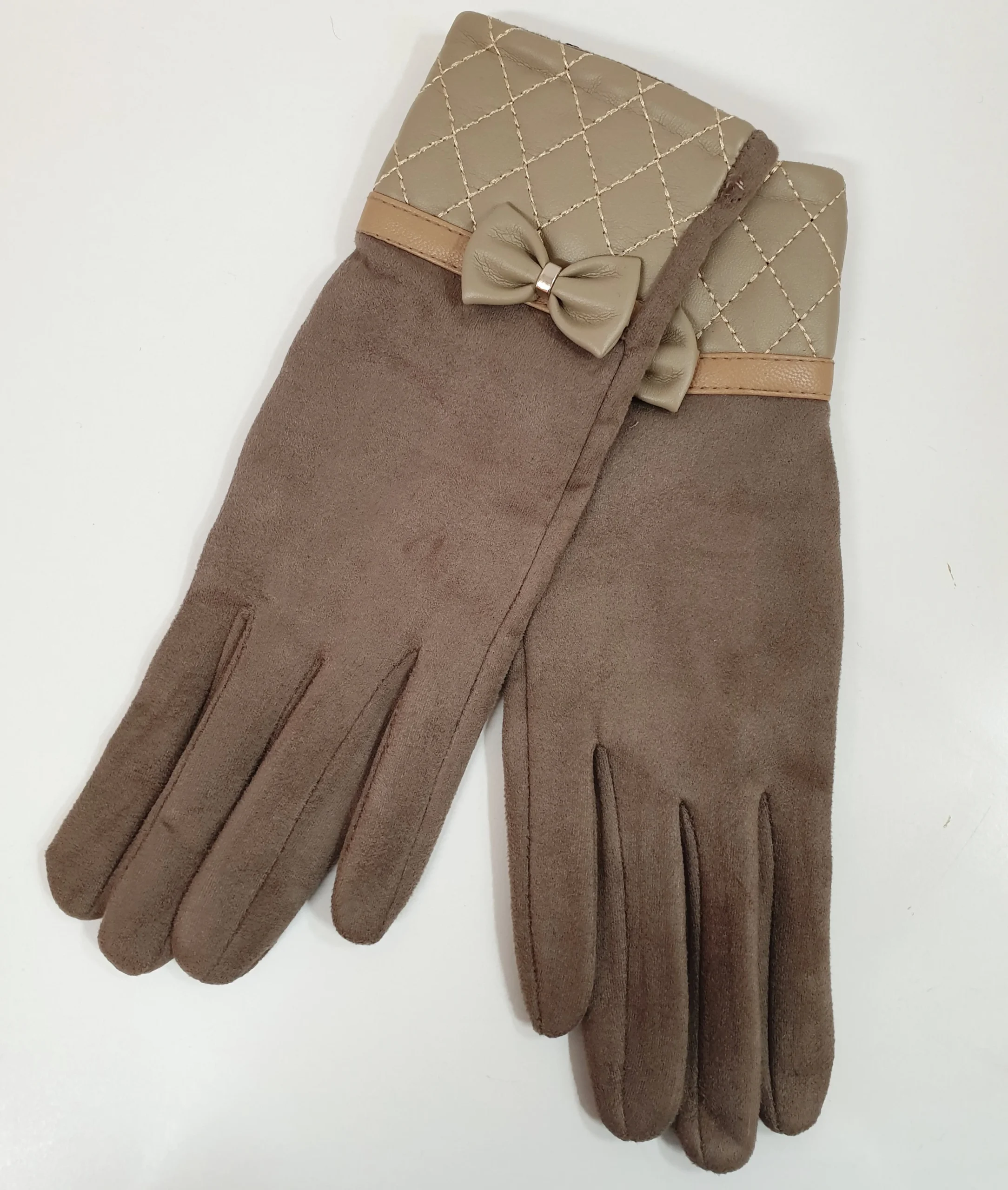 Guanti mano pesca tortora con polsino ecopelle lavorazione a rombi e fiocchetto. Interno leggermente felpato.