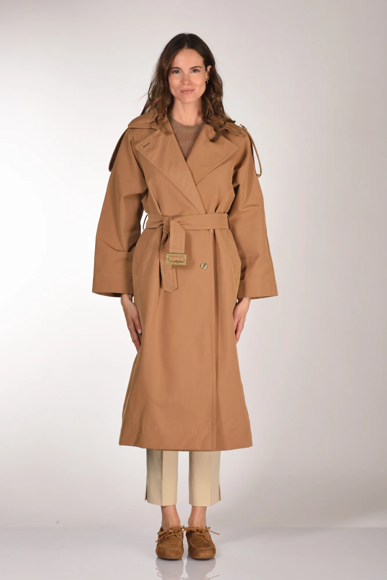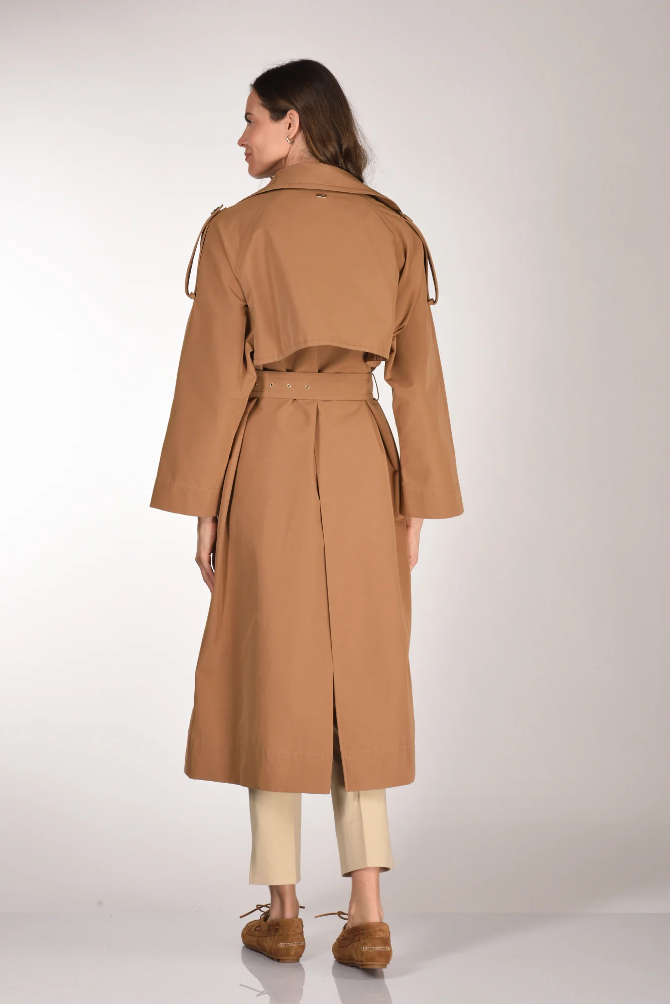 Trench Lungo, Linea Relaxed, Cintura In Vita, Tasche Laterali Inserite, Chiusura Doppio Petto Con Bottoni A Vista, Sfoderato, Spalla Raglan, Alamari Sulle Spalle, Spacco Centrale Posteriore, Vestibilita’ Fluida, Composizione 59 Cotone, 41 Poliestere, Made In Romania