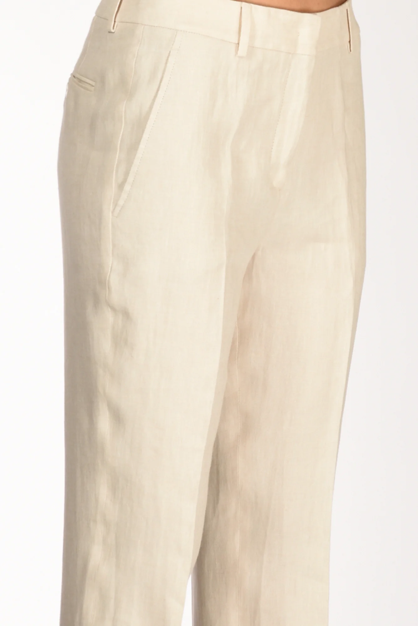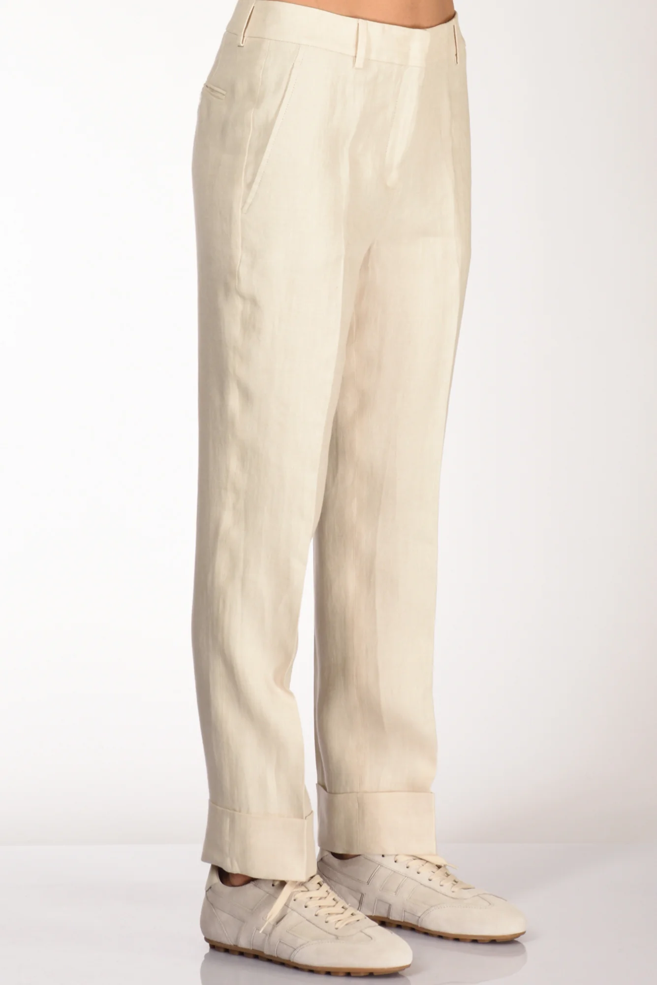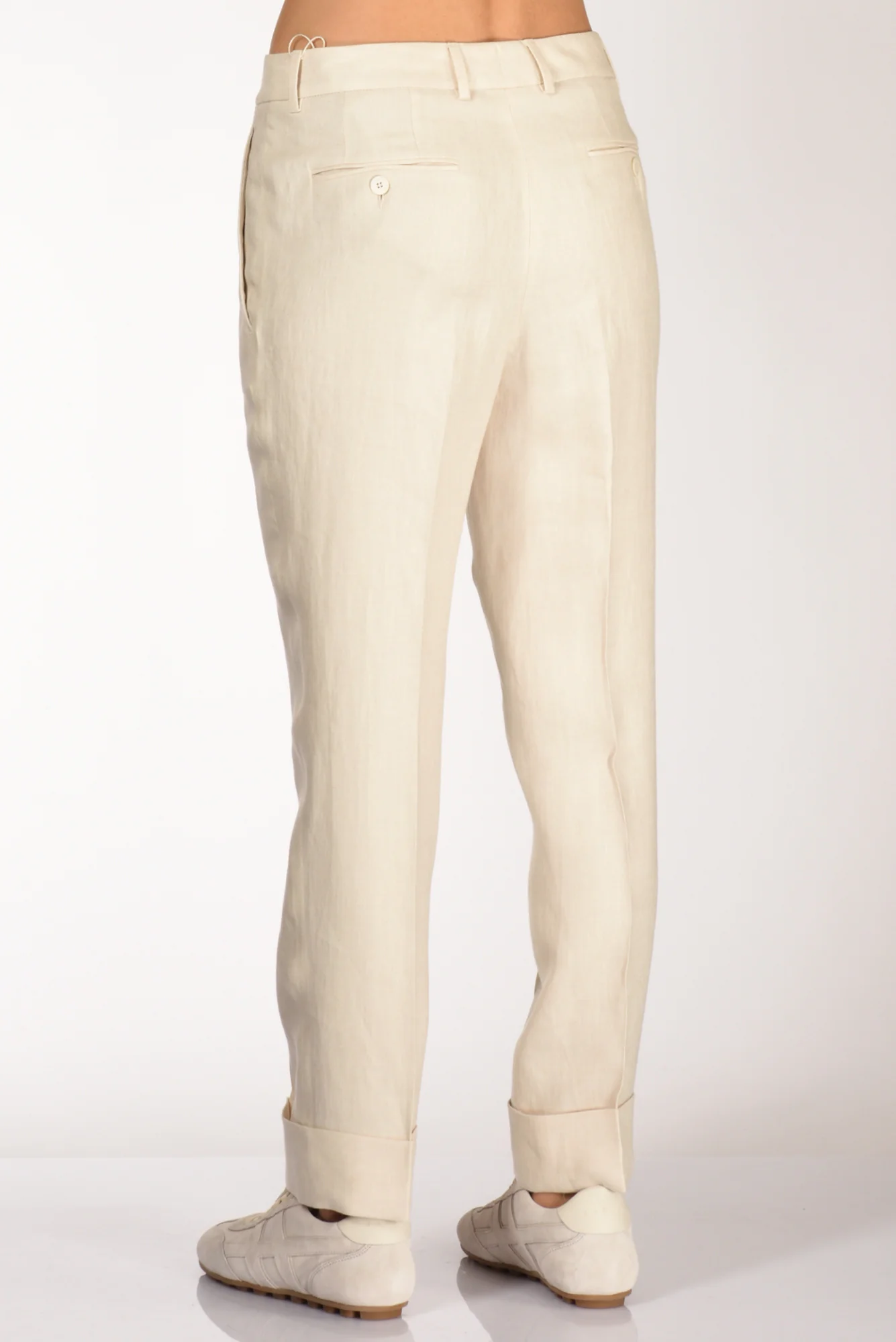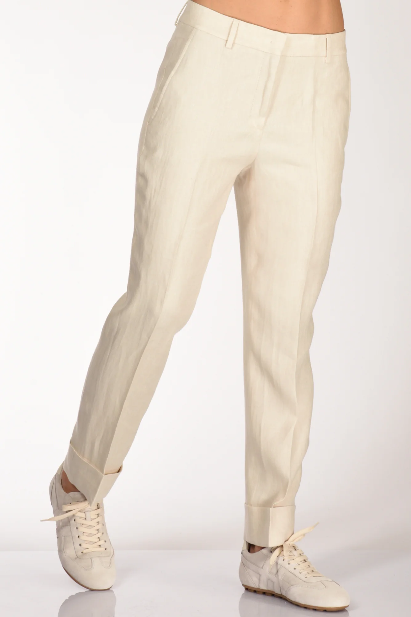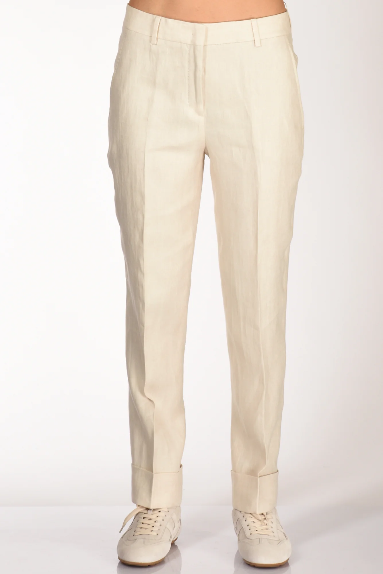 Pantaloni Sigaretta Con Risvolto Al Fondo,tasche Laterali Inserite E Posteriori A Filetto Con Bottone, Passanti In Vita, Chiusi Da Zip Nascosta, Gancio Metallico E Bottone, Vestibilita’ Regular, Composizione 100 Lino, Made In Portogallo