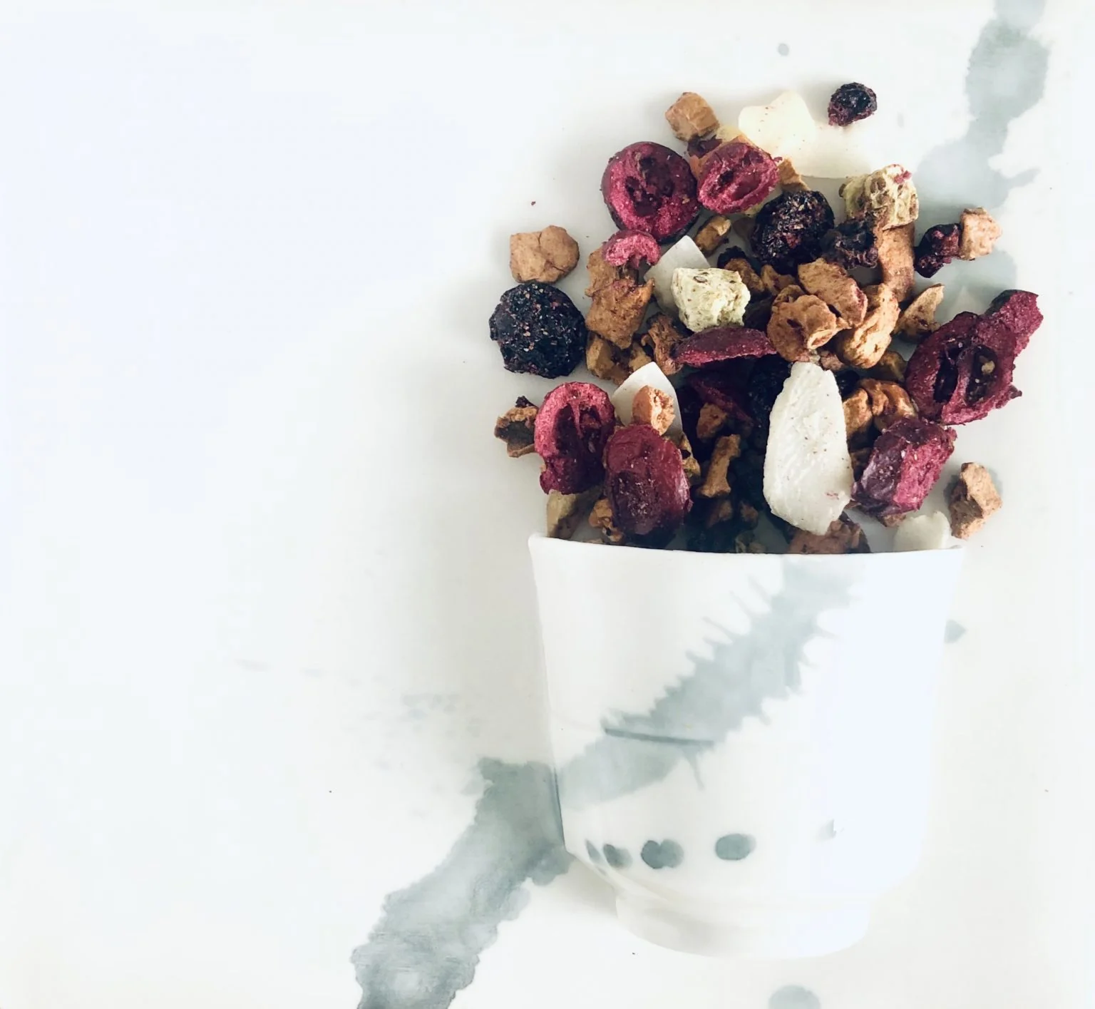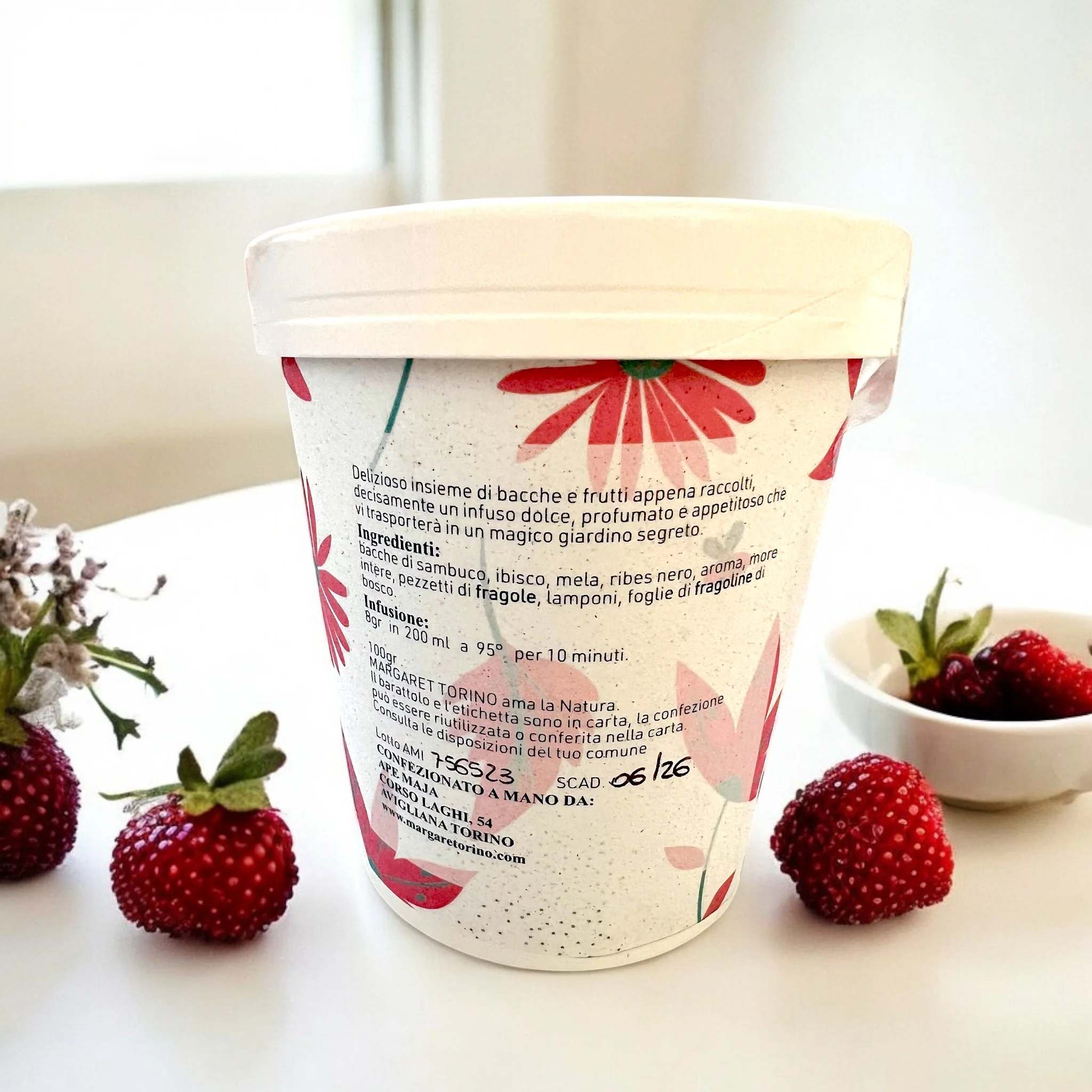 Infuso di frutta GIARDINO SEGRETO. Un delizioso infuso dolce, grazie all’insieme di bacche e frutti appena raccolti. delicatamente profumato e appetitoso ti trasporterá in un magico giardino segreto. Squisito caldo ma anche come bevanda fredda.