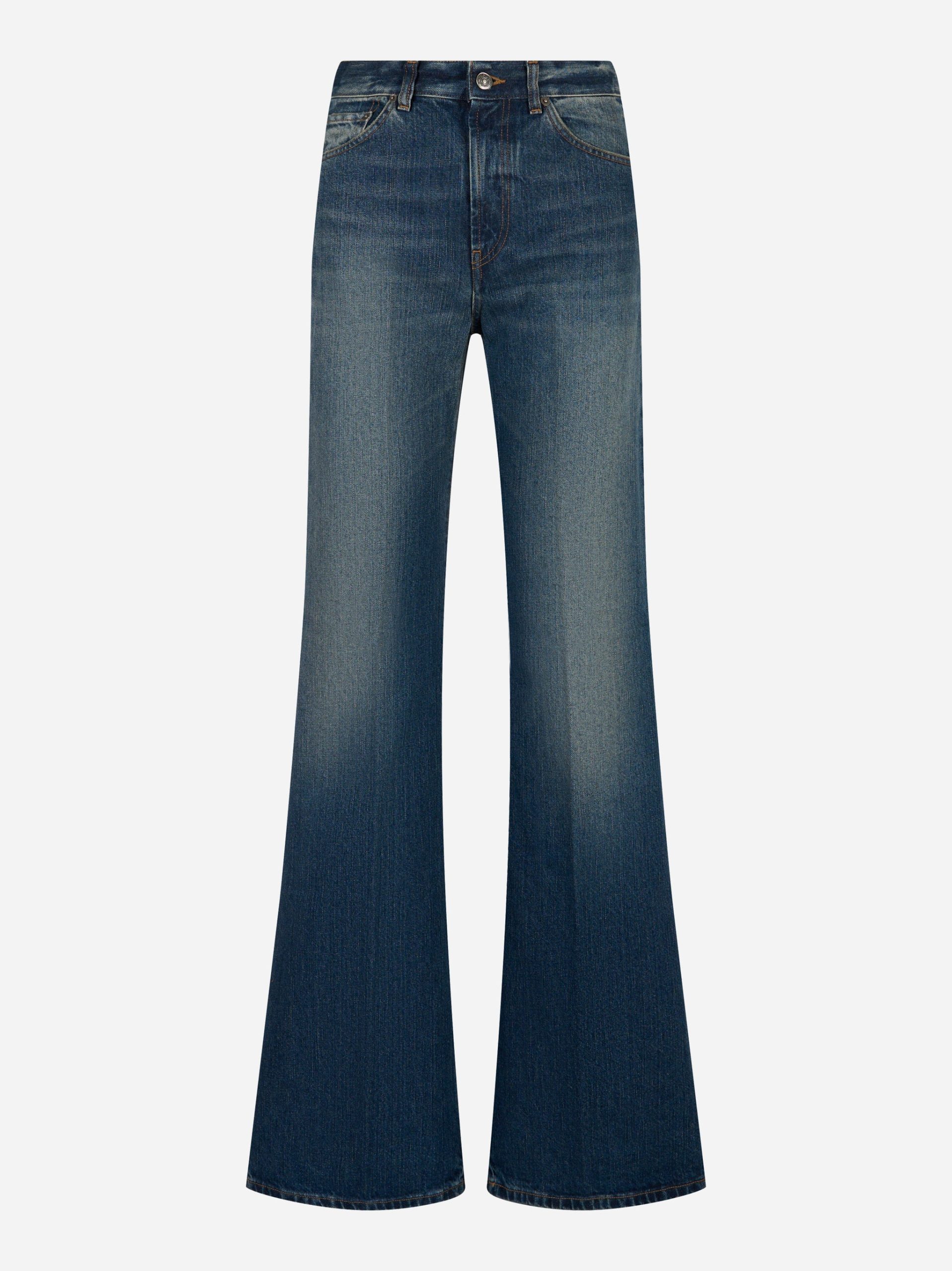 ITEM INFO Jeans Amber a gamba ampia in denim blu slavato Design a vita alta con passanti per cintura Chiusura frontale con bottone in metallo e zip nascosta Classiche cinque tasche con ricamo arcuato sul retro Taglio svasato dal ginocchio con fondo leggermente sfrangiato Etichetta logata in pelle applicata sul retro Composizione: 100% Cotone Made […]