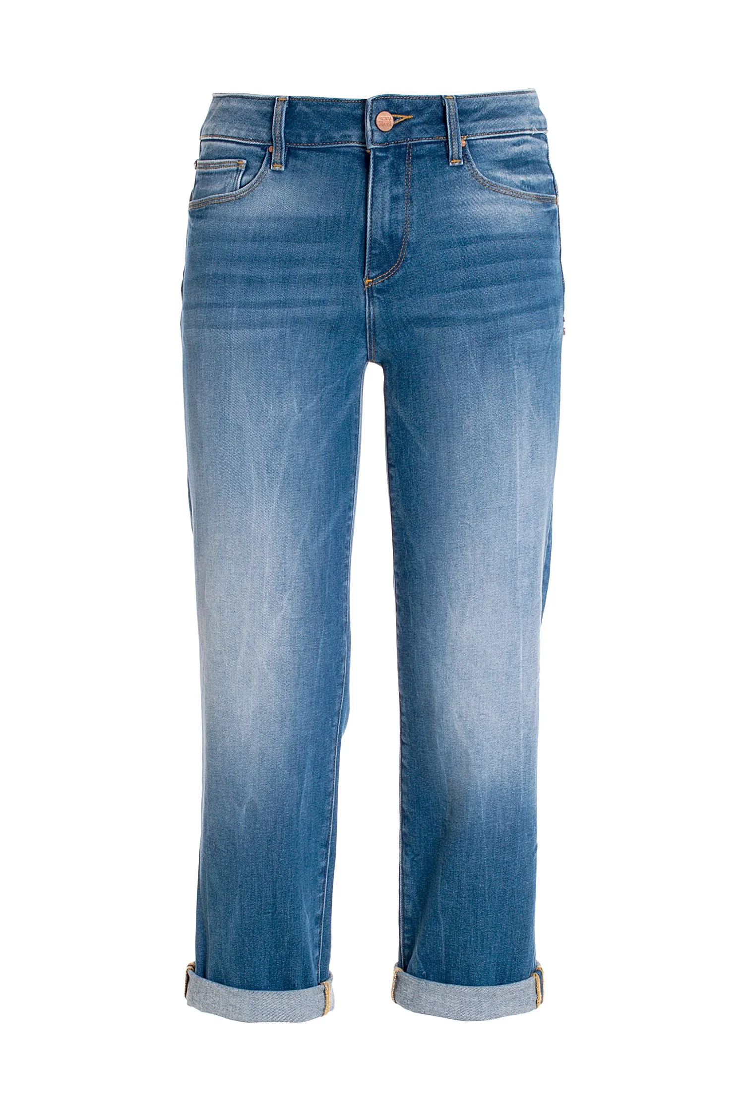 Jeans boyfriend cropped in denim con lavaggio medio, vita bassa, 5 tasche, e con fondo dritto.