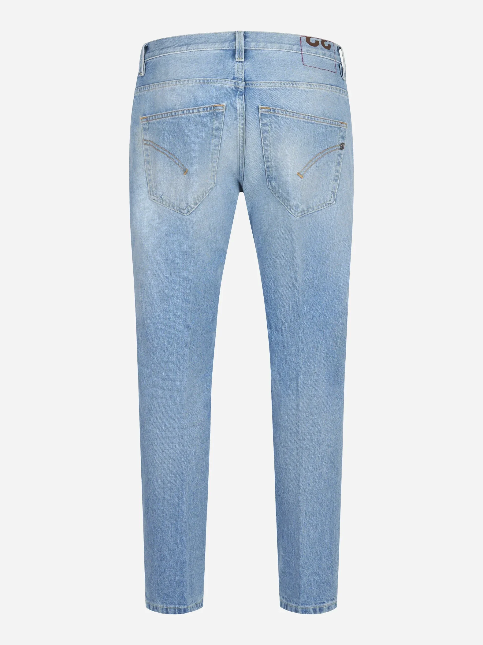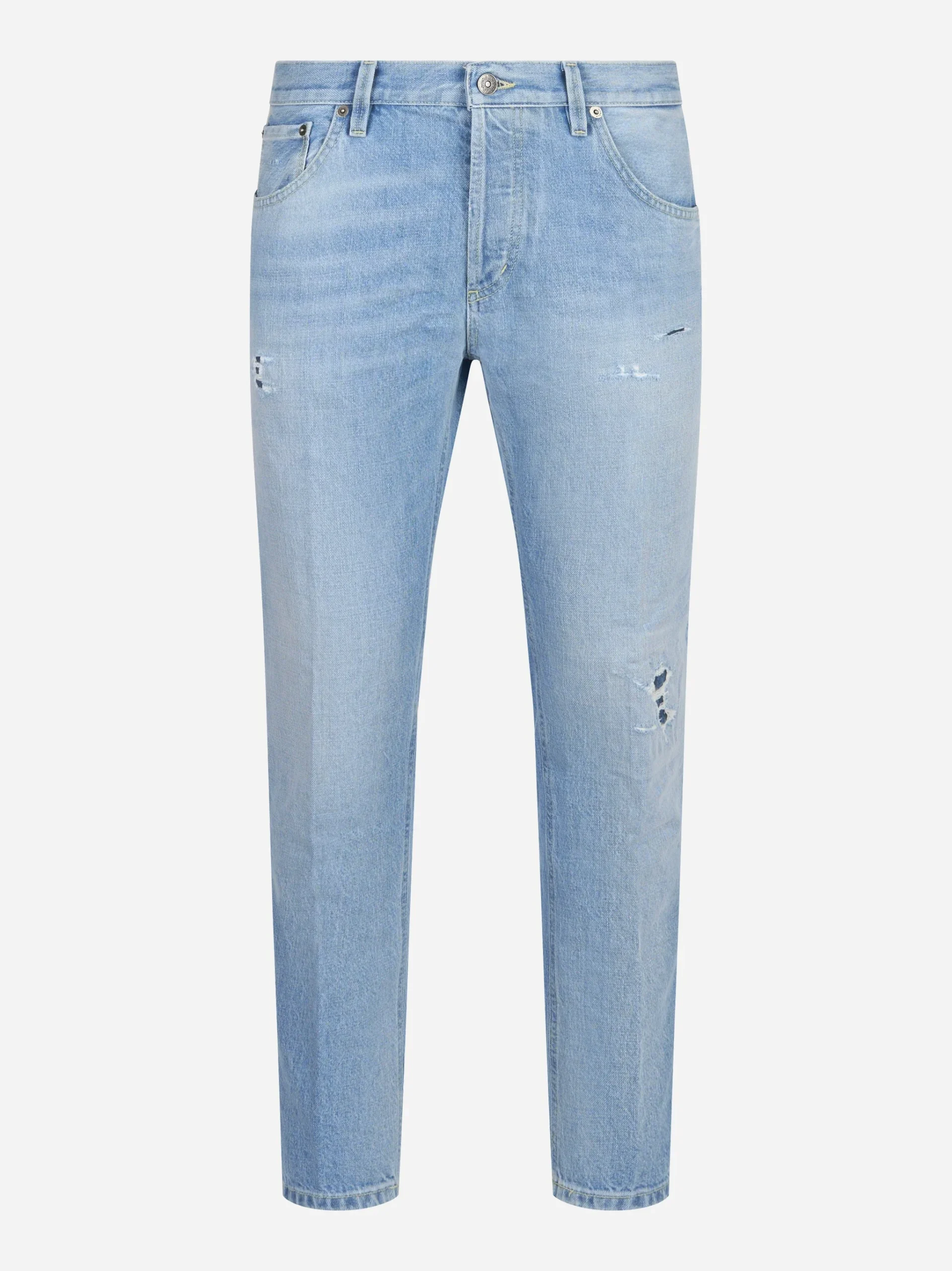 ITEM INFO Jeans carrot fit Brighton in denim fermo Costruzione 5 tasche con rivetti Chiusura con bottone e patta con zip Gamba affusolata Lavaggio con leggere rotture/abrasioni localizzate Collezione Uomo Primavera Estate 2026 Composizione: 100% Cotone Made in Italy