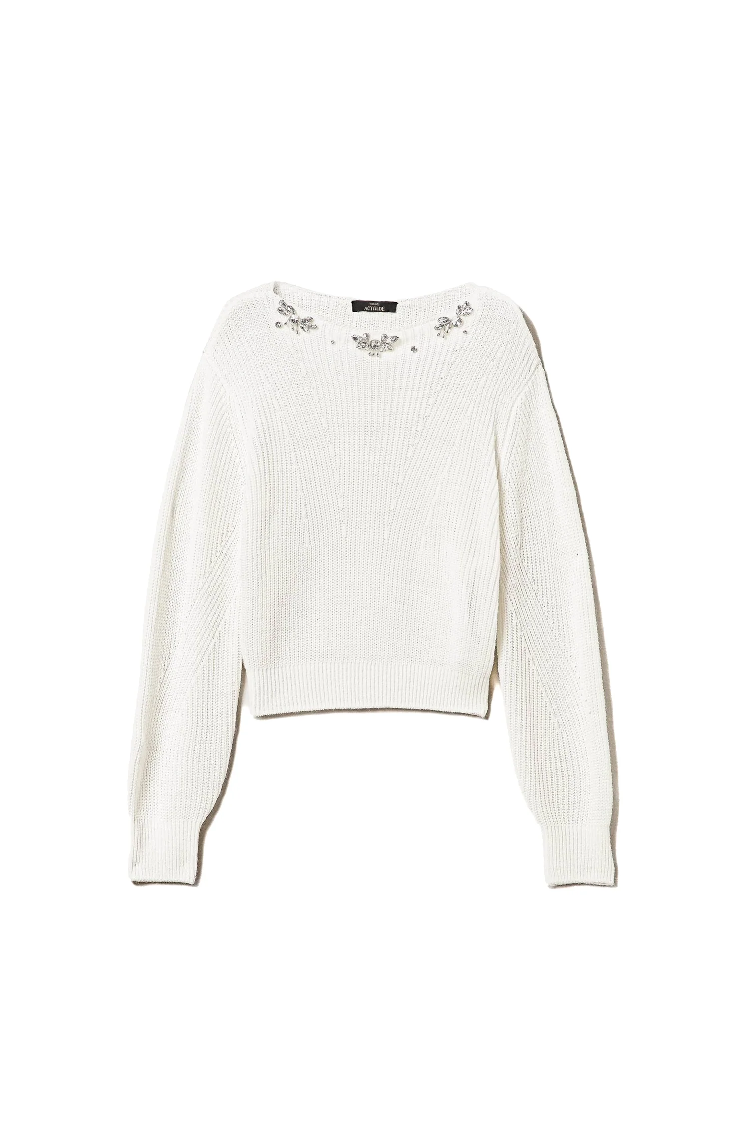 Maglia collezione Actitude con lavorazione a punto pannocchia e ricami fatti a mano. Ha i profili rifiniti a costine, scollo a barchetta, maniche lunghe, logo in metallo al centro dietro, linea regular.