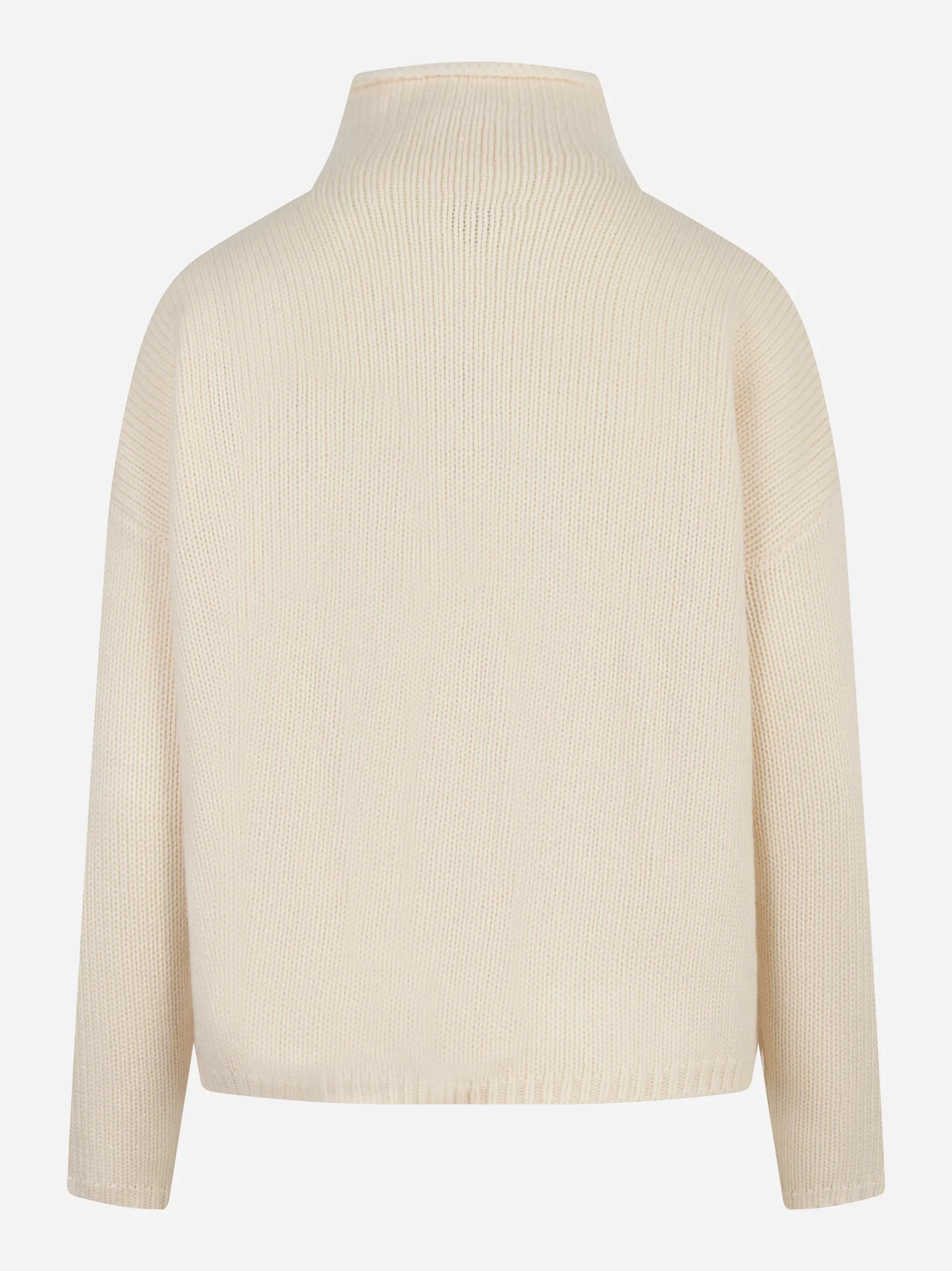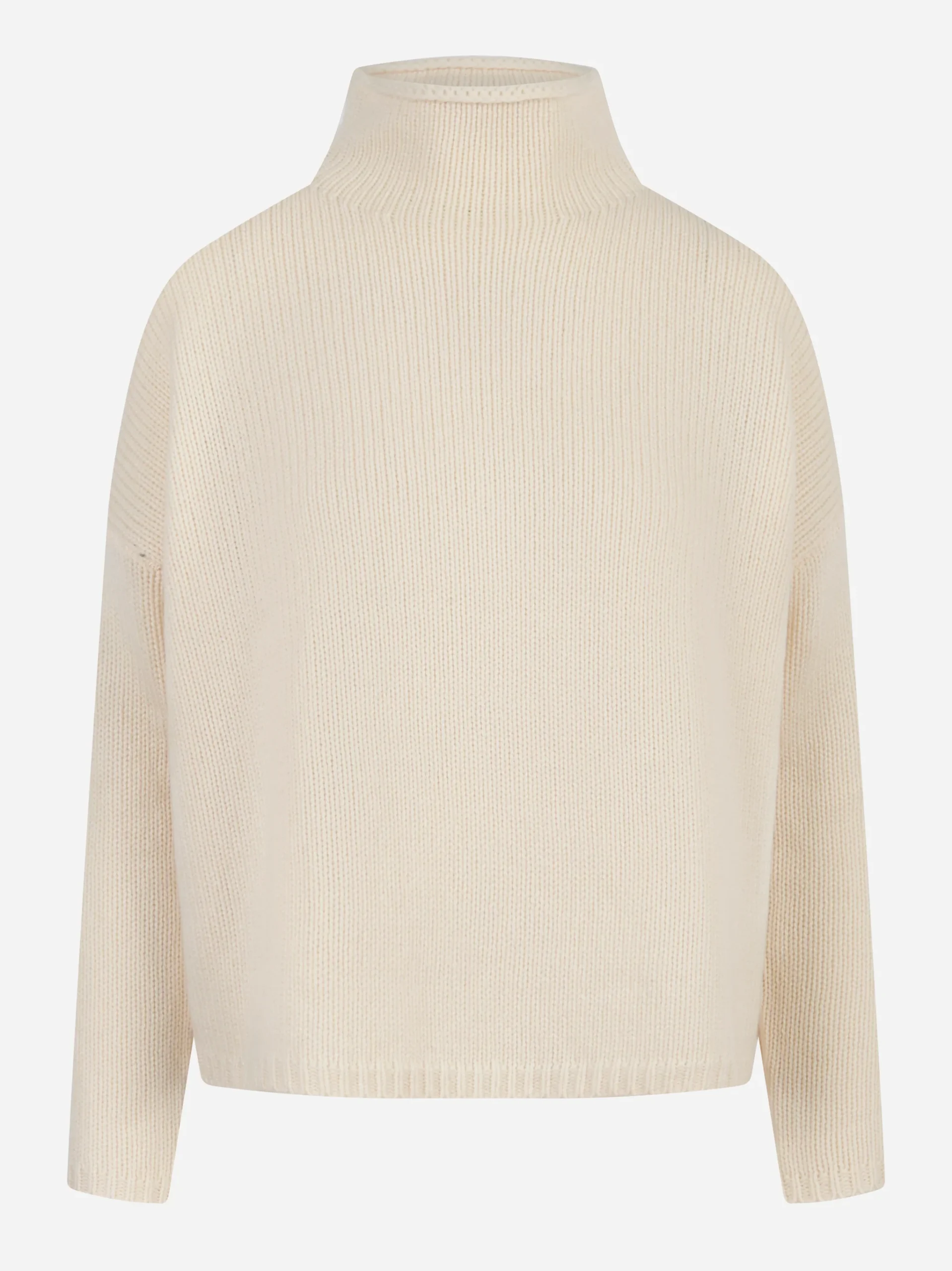 ITEM INFO Maglia collo alto in lana e cashmere Bianco Vestibilità morbida con linea regolare Maniche lunghe con polsini elasticizzati Collo alto avvolgente a coste Orlo a coste con finitura pulita Capo essenziale per look sofisticati Composizione: 70% Lana, 30% Kashmir Made in Italy