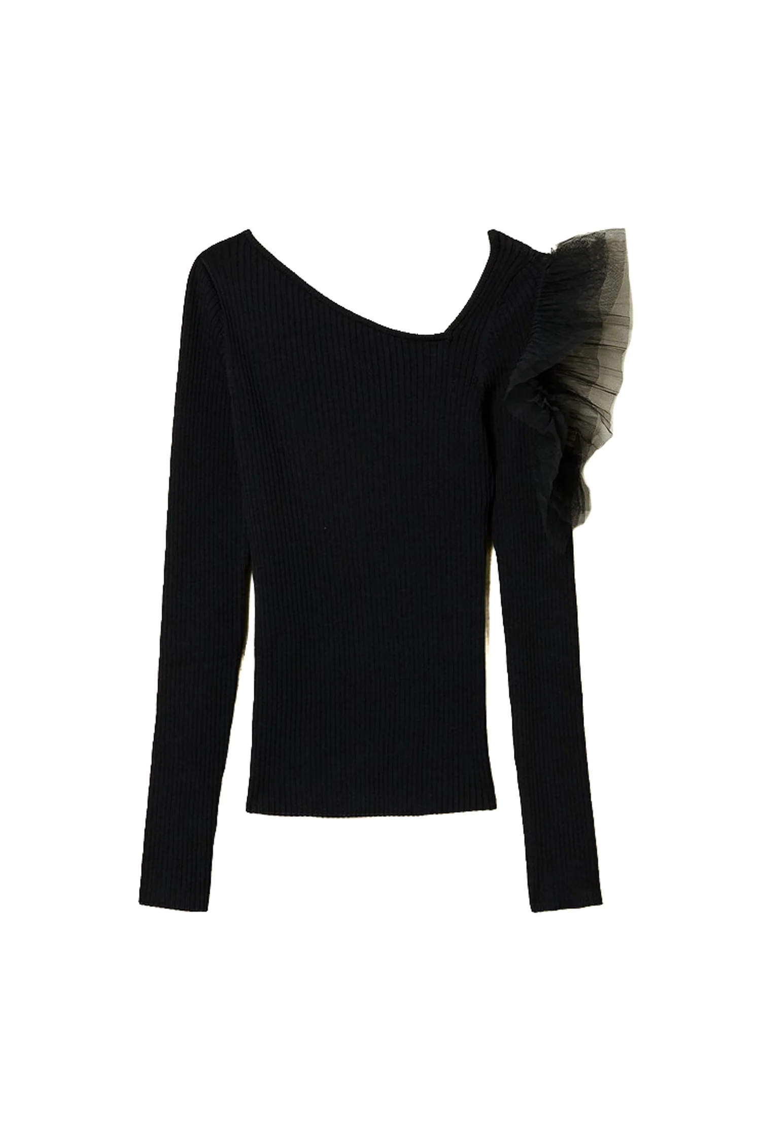 Maglia collezione Actitude in tessuto misto viscosa stretch lavorato a costine con scollo asimmetrico, cut-out sulla spalla rivestito con balze in tulle plissé, maniche lunghe, logo in metallo sul retro, linea fitted.