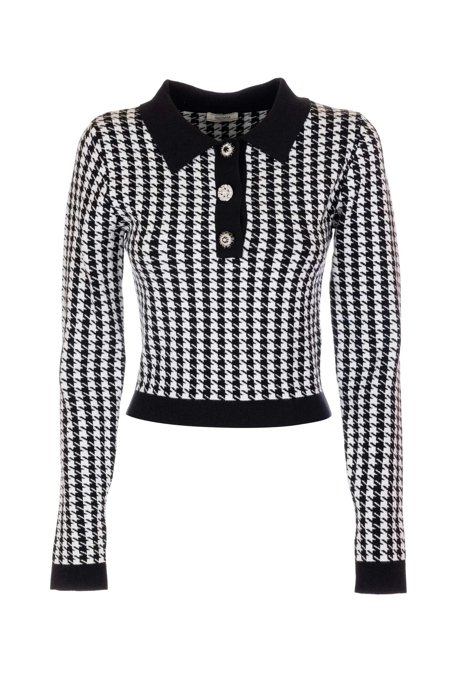Maglia slim in jacquard pied de poule, collo a polo con bottoni sul davanti, e con maniche lunghe.