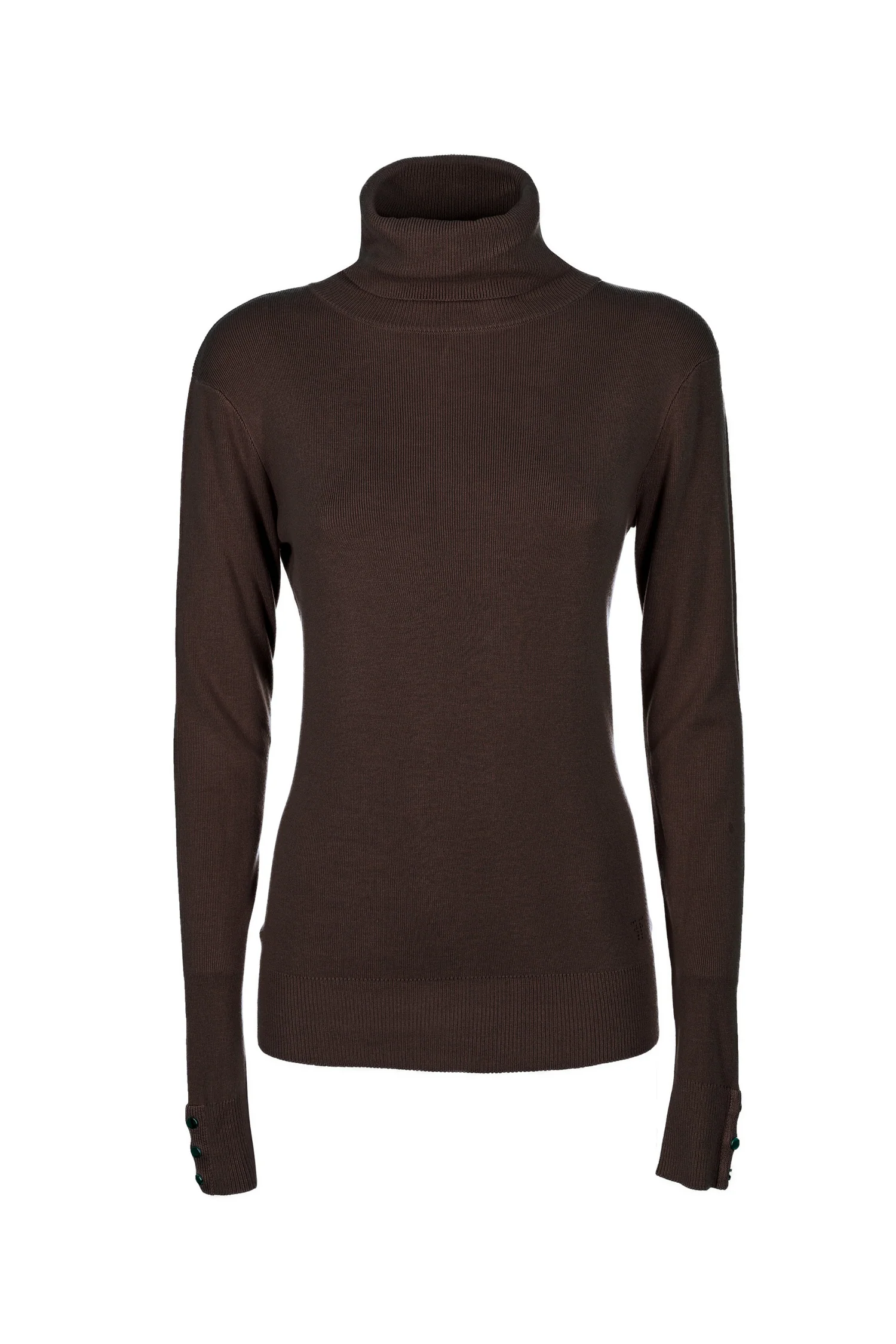 Maglia slim a costine, collo alto, e con maniche lunghe con bottoncini sui polsi.