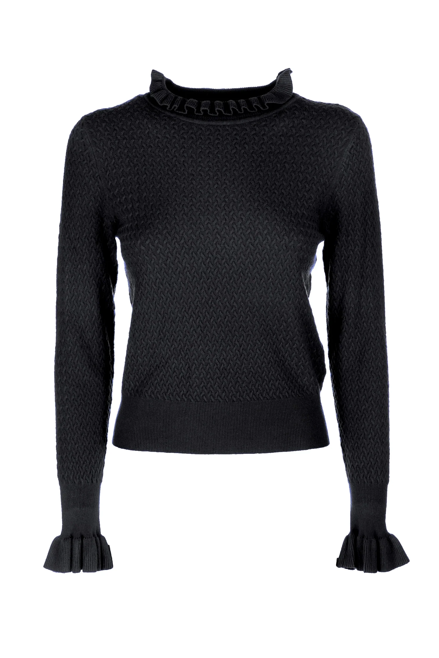 Maglia slim con punto intrecciato, collo con rouches, e con maniche lunghe.