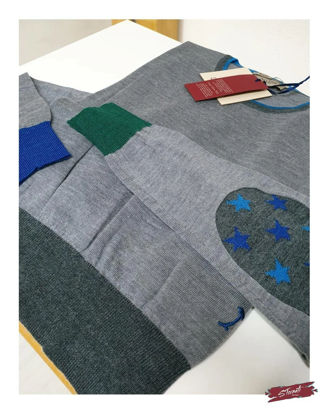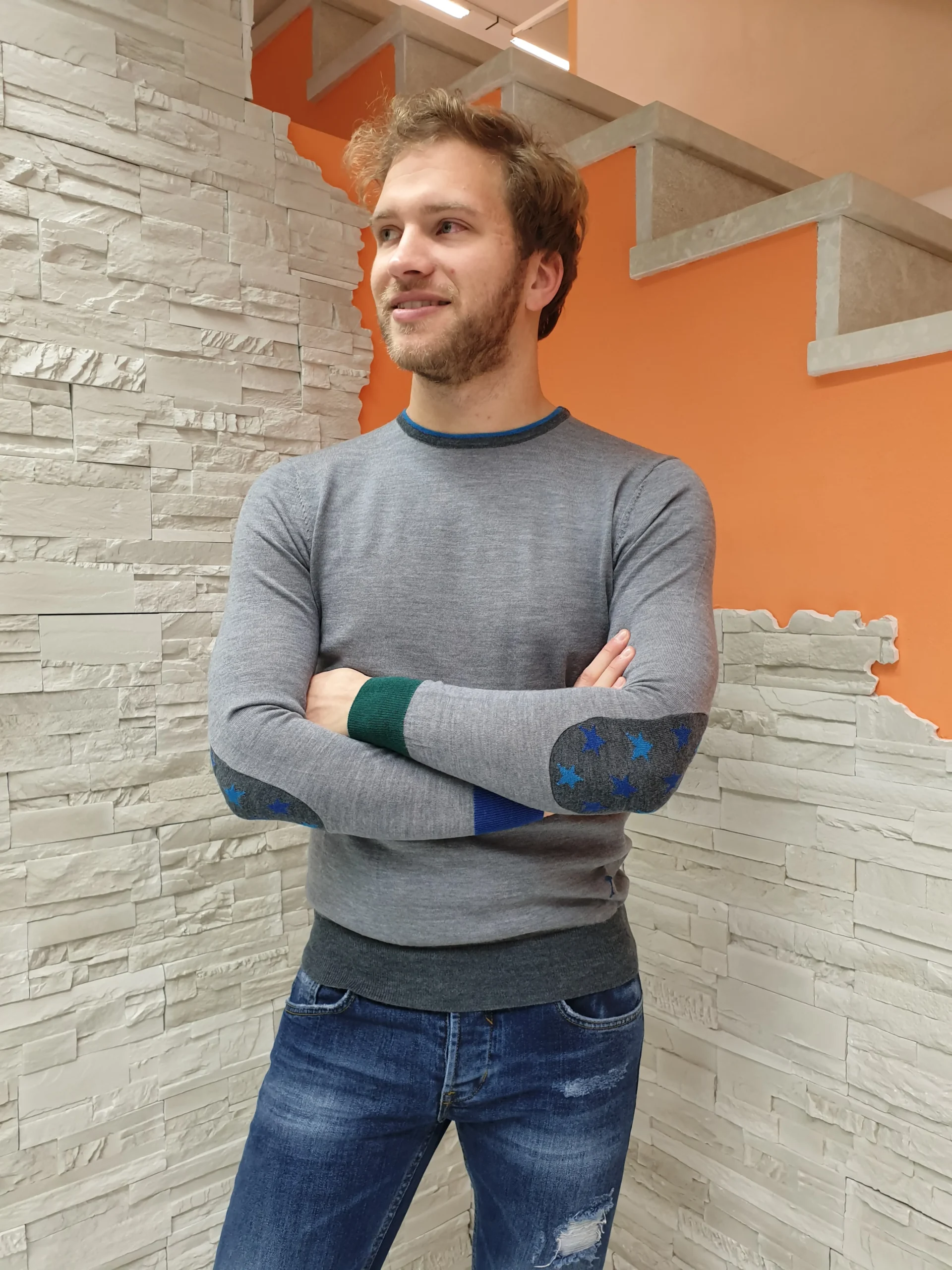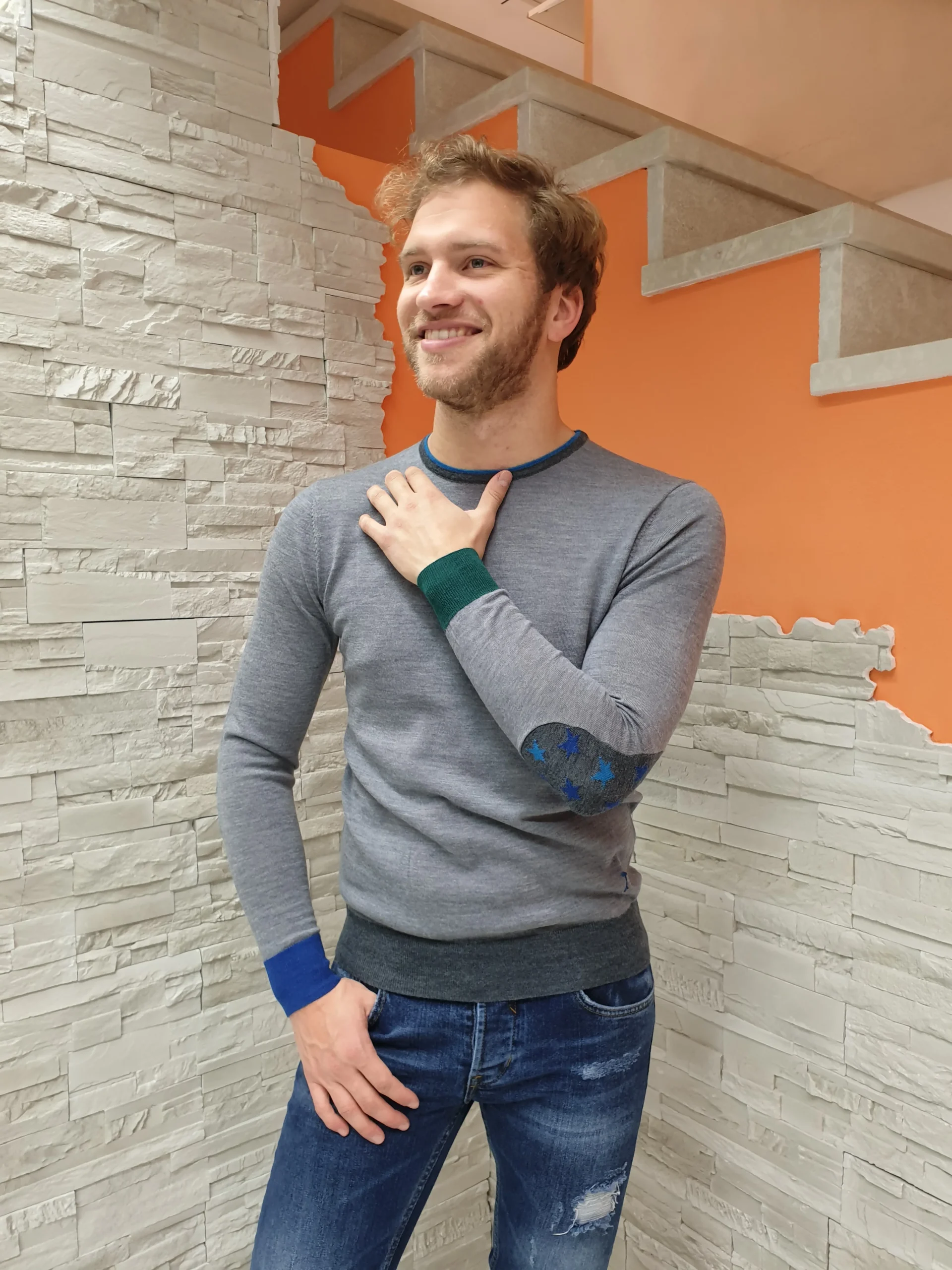 Maglioncino sottile girocollo grigio con toppe stelline e dettaglio polsini colore diverso. Il modello in foto indossa la tg. M Composizione: 100% Lana Merino MADE IN ITALY