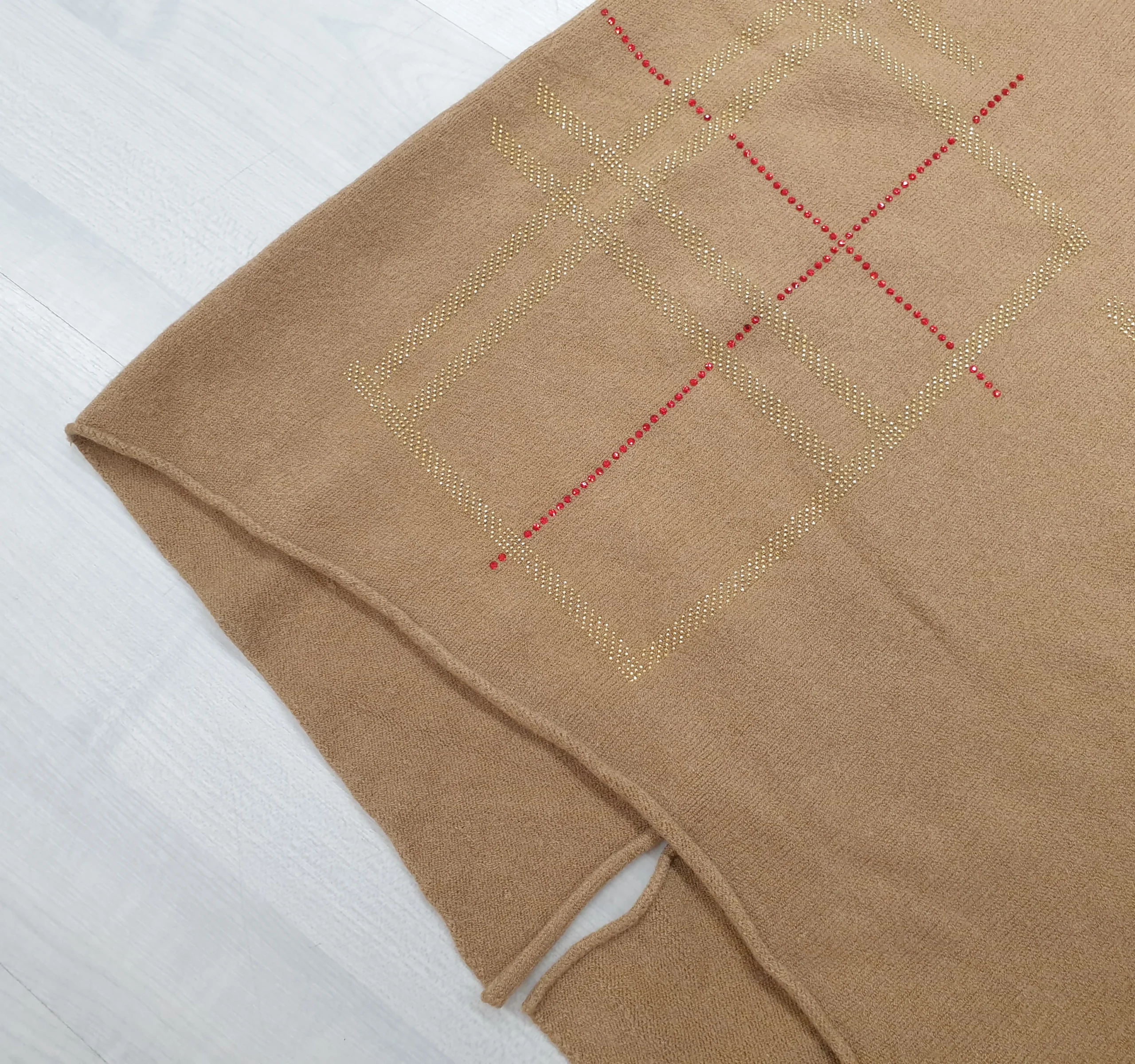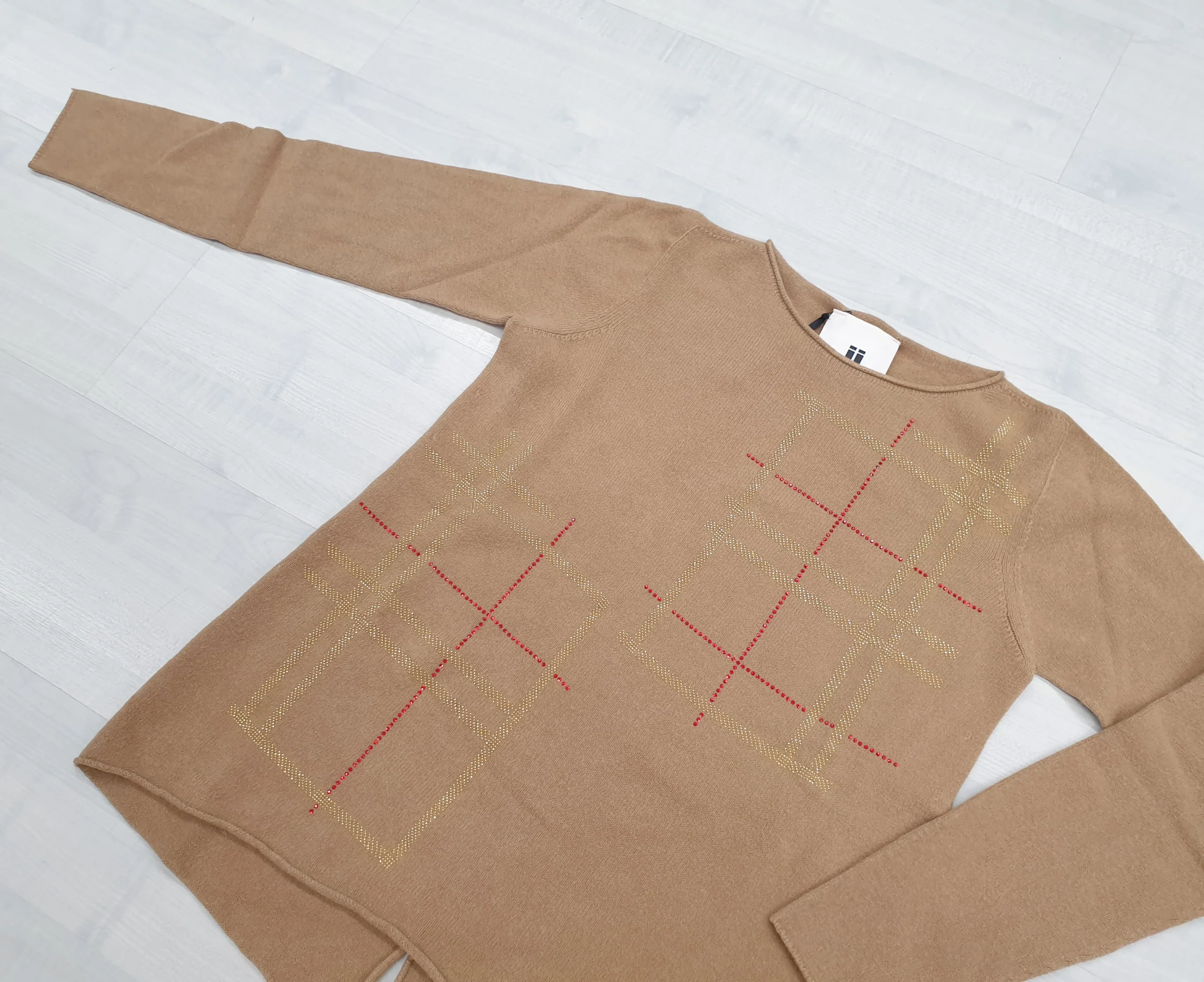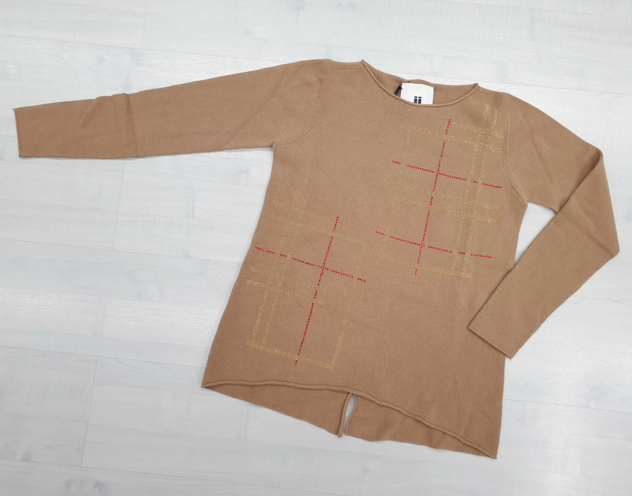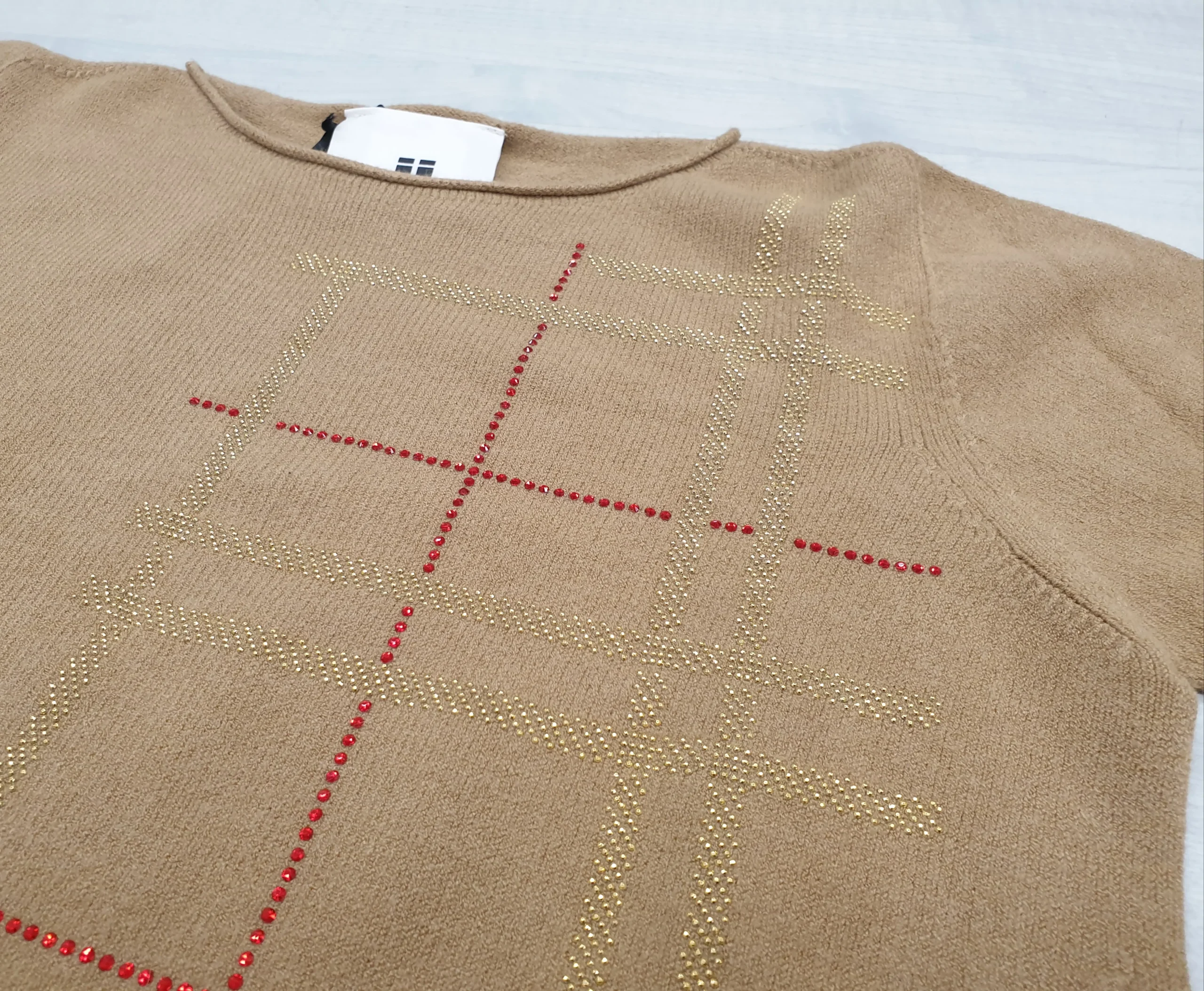 Maglincino cammello strass dorato e rosso motivo quadro, vestibilità sfiancata con retro più lungo stondato con spacchetto. Tessuto elasticizzato.