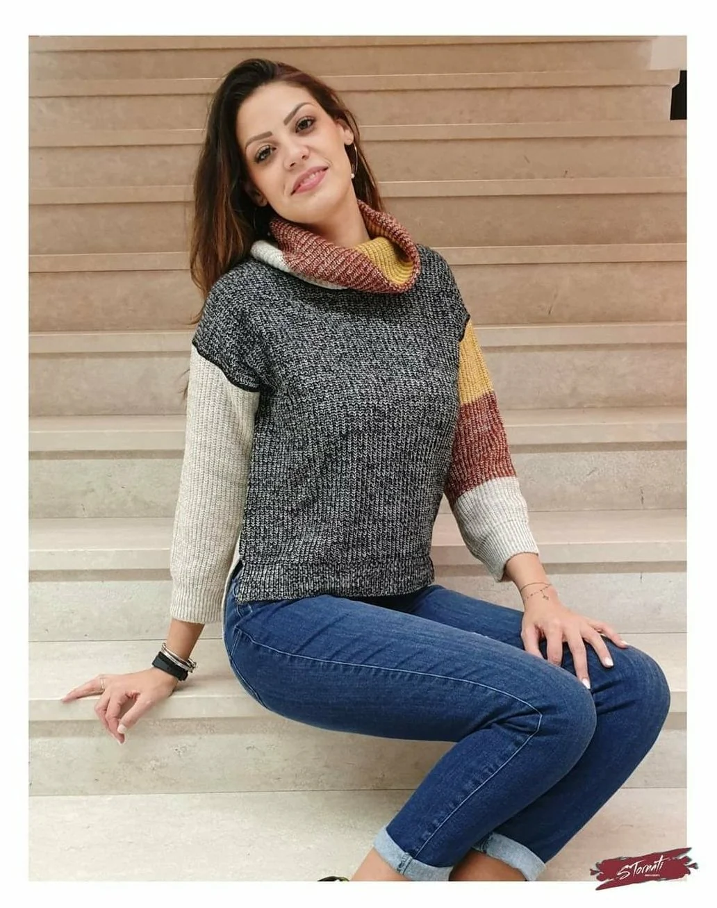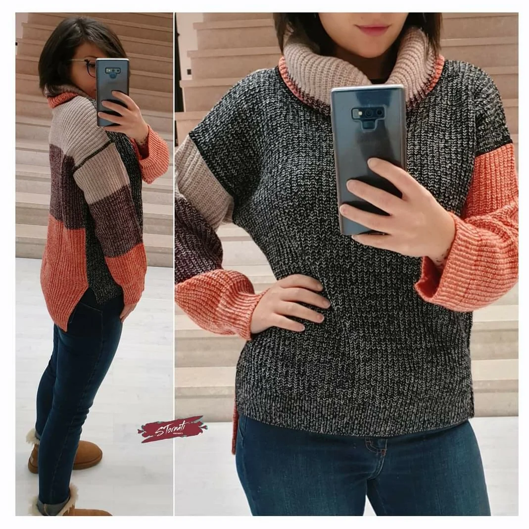 Maglione collo ciambella colorblock con colori a contrasto. Composizione: 10% Viscosa 10% Lana 5% Alpaca 75% Acrilica MADE IN ITALY