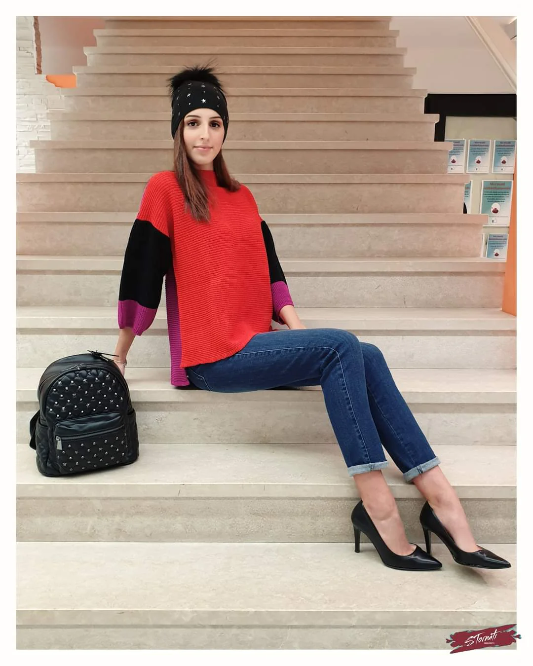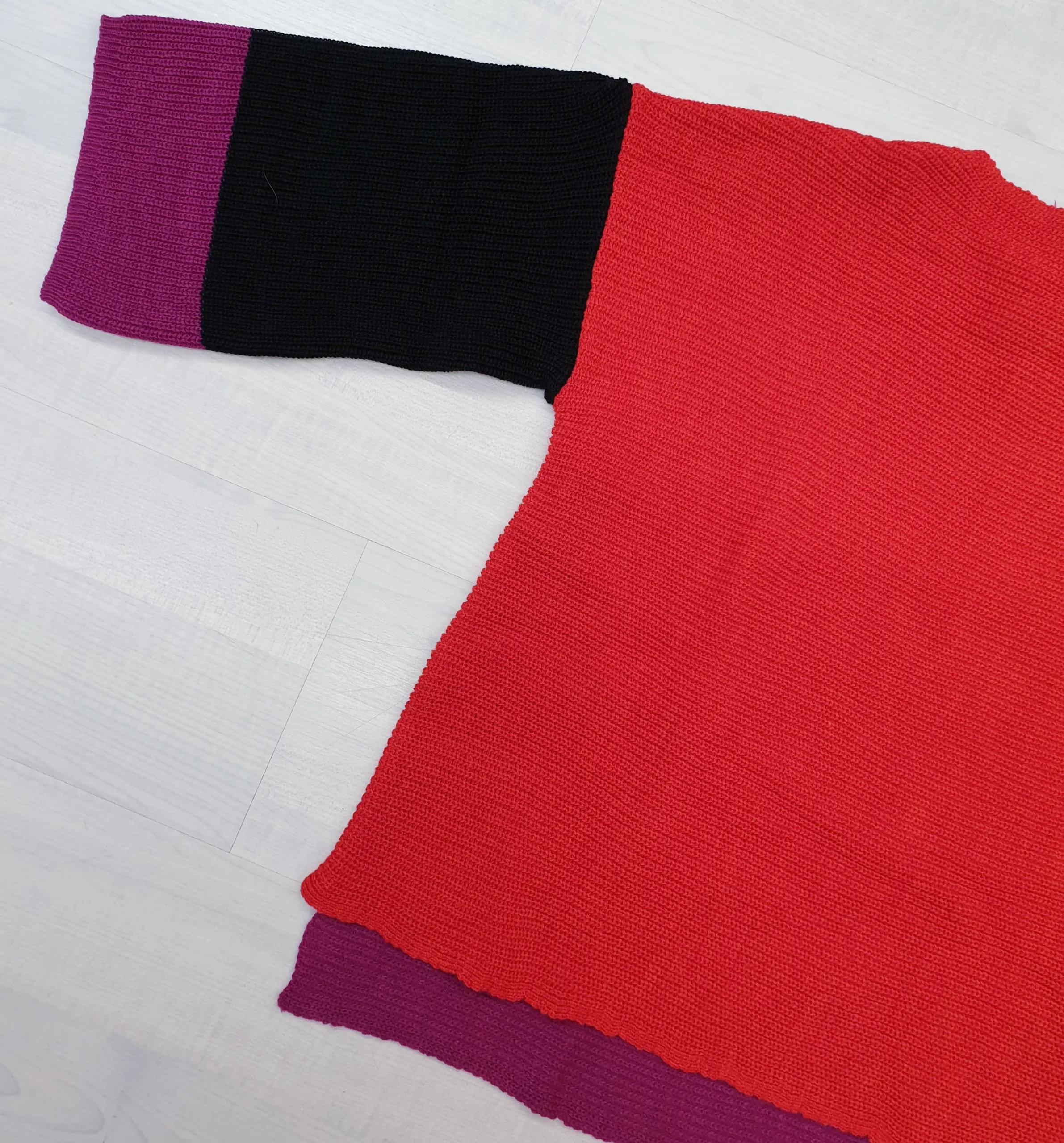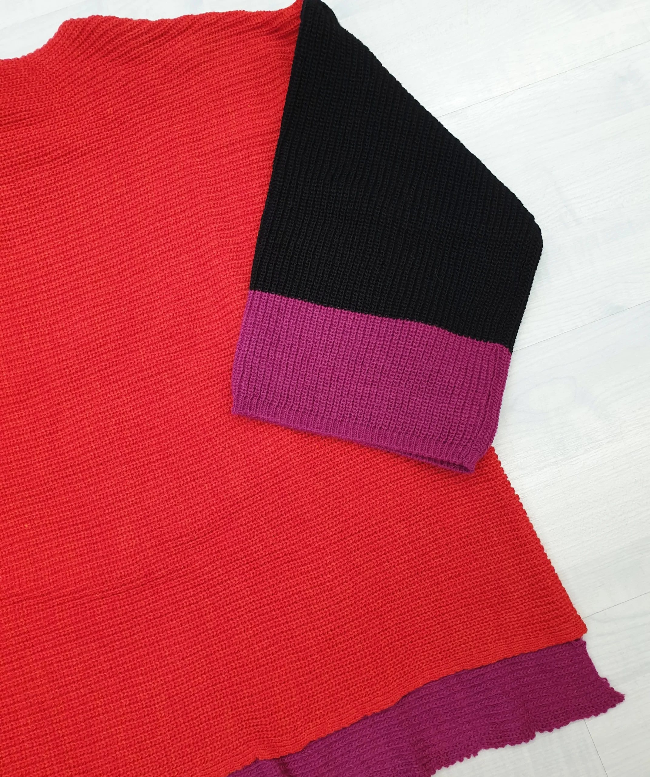 Maglione color block corallo, ciclamino, nero. Scollo a barchetta leggermente alto con lavorazione costine orizzontali e maniche 3/4 ampie. Composizione: 60% Acrilica 40% Lana MADE IN ITALY